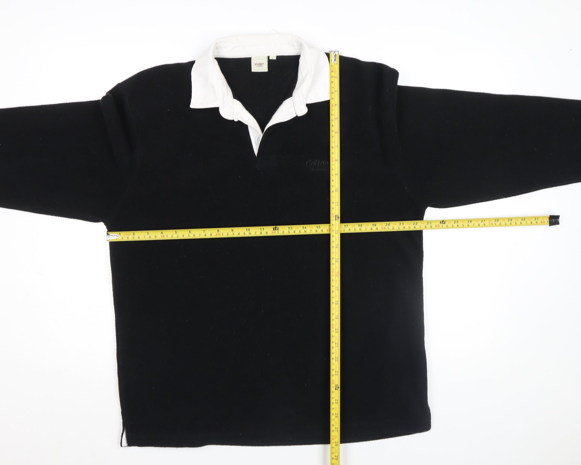 This Cotton Traders Men's Black Long Sleeve Rugby Polo Shirt offers a timeless and comfortable design ideal for both casual wear and sporting occasions. Crafted from a durable and soft fleece material blend of 65% polyester and 35% cotton, it delivers excellent warmth while remaining breathable and lightweight. The shirt features a smart contrasting white collar for a polished look, along with a buttoned placket that reflects a classic rugby style aesthetic. Designed with long sleeves and fitted cuffs, this top provides a secure and comfortable fit suitable for cooler weather, making it versatile for autumn and winter seasons. The solid black fabric is complemented by the subtle Cotton Traders logo accent on the chest, adding understated brand detail. The regular fit cut ensures easy layering and unrestricted movement, while the button-down collar adds structure and refinement to the overall look. Ideal for activities such as rugby, walking, or casual outdoor pursuits, this piece transitions effortlessly between activewear and leisurewear. It is machine washable for easy garment care, maintaining its soft texture and fit over time. The shirt measures approximately 115 cm in chest size and 80 cm in length, corresponding to a UK men's large. In very good condition, showing light wear with no visible damage, it remains perfectly suited for continued quality use. Perfect for those who appreciate durable, practical, and timeless sportswear with a touch of classic style, this Cotton Traders rugby polo is a must-have wardrobe essential for cooler months. An excellent choice for a laid-back day out, casual training session, or weekend wear, it combines classic British design with dependable comfort.