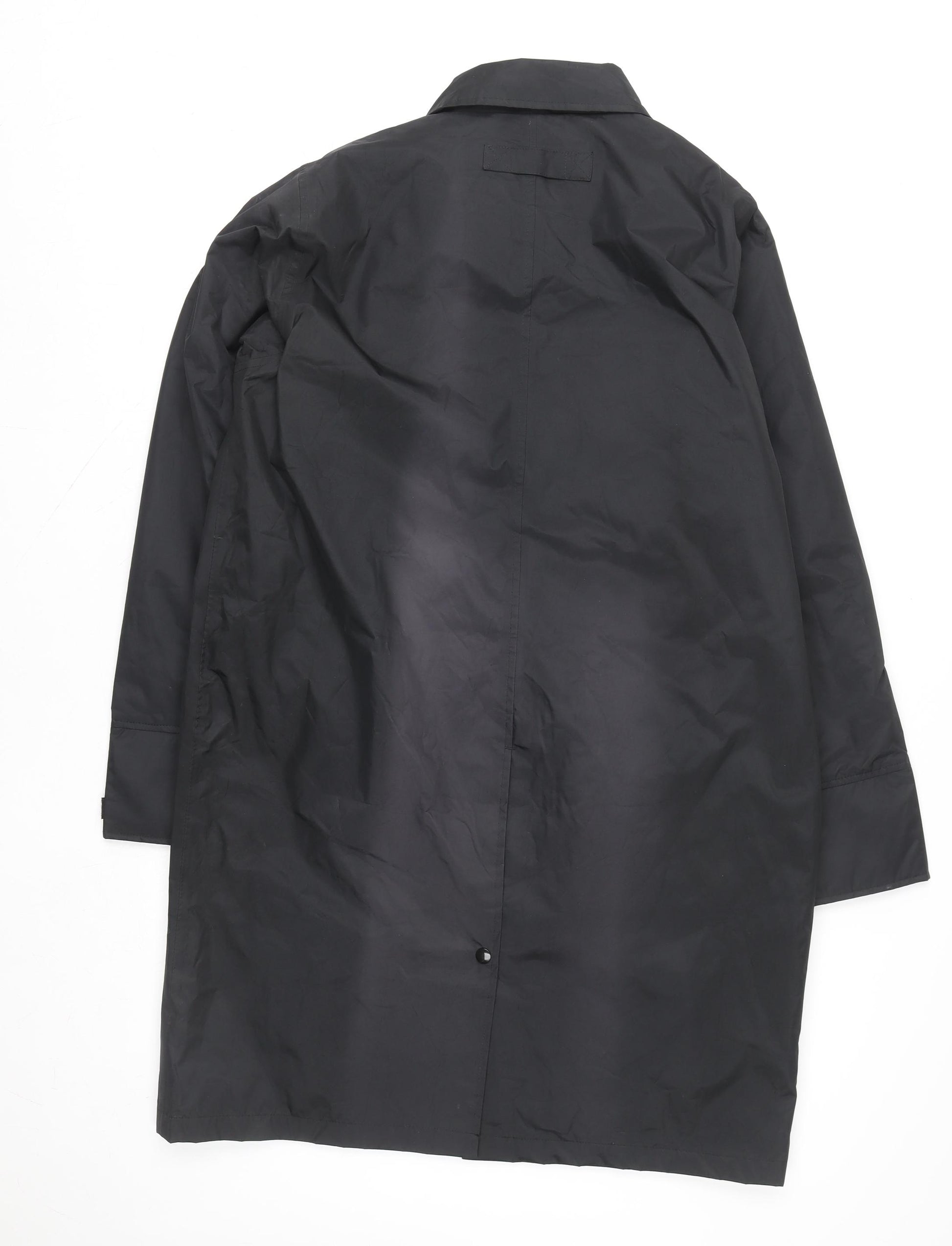 Stay dry and comfortable in any weather with this classic black rain coat from Cotton Traders. Designed for men who value practicality and style, this longer-length coat provides excellent protection against the elements while maintaining a sleek, modern appearance. Crafted from durable 100% polyester, it offers a smooth, water-resistant finish that keeps you protected from rain and wind on those unpredictable British days. The medium size provides a comfortable regular fit which allows for easy layering over shirts or knitwear, making it a versatile option for all seasons except the height of summer. The coat features a smart pointed collar, zip and button fastening for extra protection, and practical front flap pockets — ideal for holding keys, wallets, or gloves while on the go. Inside, the fully lined 100% polyester construction adds comfort and reinforces its durability, making this coat an ideal choice for everyday commutes, countryside walks, or casual outings. The minimalist, pattern-free black design ensures timeless style that pairs easily with both smart and casual looks alike. Perfect for men seeking dependable, weather-resistant outerwear suitable for autumn, spring, or mild winter days, this Cotton Traders rain coat combines functionality with effortless British charm. With its professional yet practical aesthetic, it fits seamlessly into both travel and workwear wardrobes. The condition is excellent, showing minimal signs of wear and remaining in great, clean order. A quality and affordable outerwear piece ideal for tackling the outdoors with confidence – ready to keep you dry and stylish wherever your day takes you.