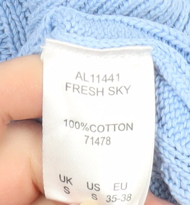 Add a touch of timeless comfort to your wardrobe with this lovely Cotton Traders women’s blue cable-knit jumper in size Small. Crafted from 100% cotton, it offers classic breathability and a soft, natural feel against the skin, ideal for cooler days or layering through the seasons. The pretty pastel ‘Fresh Sky’ blue gives it a fresh, versatile look perfect for pairing with jeans, skirts, or casual trousers for effortless style.The jumper features a flattering high neckline with a 1/4 zip detail, allowing you to adjust for warmth or style. Its beautifully textured cable-knit pattern adds a traditional yet chic finish, creating both structure and cosiness. Long sleeves with ribbed cuffs and hem ensure a comfortable, snug fit that retains shape wear after wear.With its breathable knit and all-season practicality, this piece suits a range of occasions from relaxed weekends to smart-casual outings. Perfectly designed for comfort and simplicity, it can be layered easily under coats or paired with a crisp shirt collar for a contemporary twist.This used jumper remains in excellent condition with only light general signs of wear, showing the care taken by its previous owner. Machine washable for convenience, it represents quality craftsmanship and a great value choice for anyone wanting reliable, easy-to-wear knitwear.Combining comfort, practicality, and understated style, this Cotton Traders blue cable-knit jumper promises to become a go-to favourite for everyday wear throughout autumn and winter. A timeless wardrobe staple with a refined colour and elegant detailing—ideal for those who love classic styles that never go out of fashion.