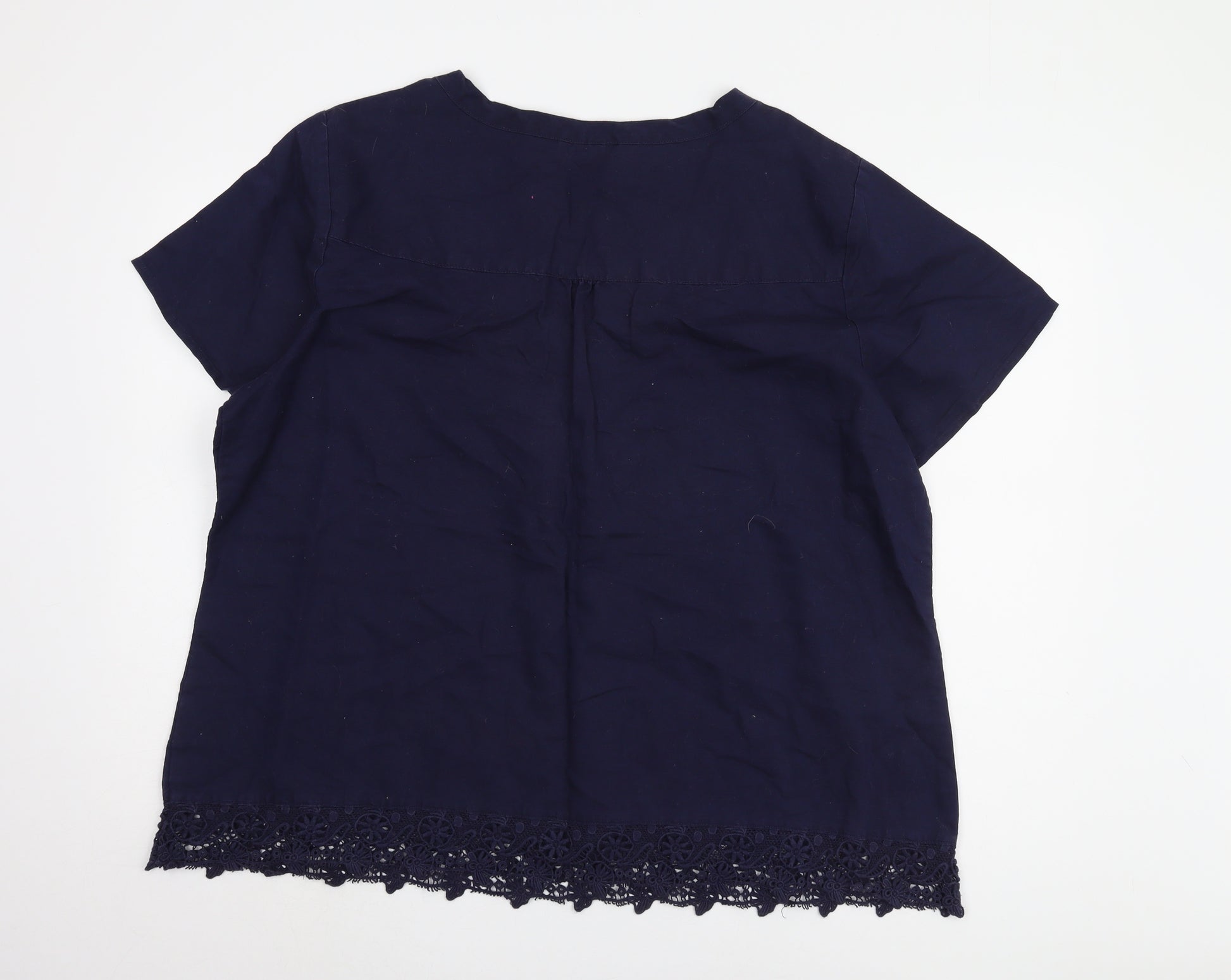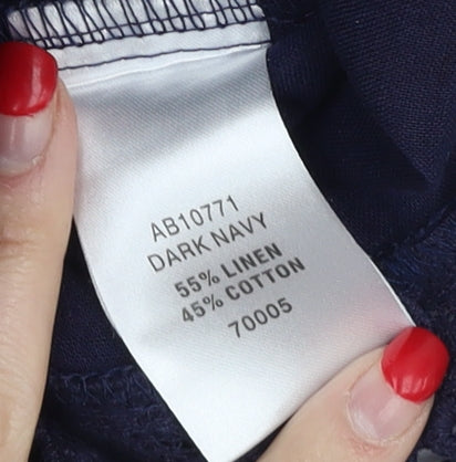 Discover a charming addition to your wardrobe with this Cotton Traders Women’s top. In a sophisticated dark navy, this piece offers a delightful blend of style and comfort. Expertly crafted from a unique linen and cotton blend, it ensures breathability and softness, ideal for casual occasions or relaxed outings.The top features a regular fit with short, classic sleeves and a round neckline, enhancing its relaxed appeal. The crochet accents along the neckline and hem add a touch of elegance, offering a subtle contrast to the solid blue. This minimalist yet stylish design will pair effortlessly with your favourite jeans or skirts.Sized as a 24 in plus size, this top is perfect for those who appreciate fashion with a comfortable fit. Although pre-loved, it remains in very good condition with only slight wear visible, ensuring you enjoy the stylish flair Cotton Traders offers. Featuring a pullover closure, this garment promises ease of wear and suitability for all-day comfort.Embrace timeless style with this versatile piece, perfect for casual outings or laid-back get-togethers. Its quality and style make it a worthy addition to any fashion enthusiast’s collection.