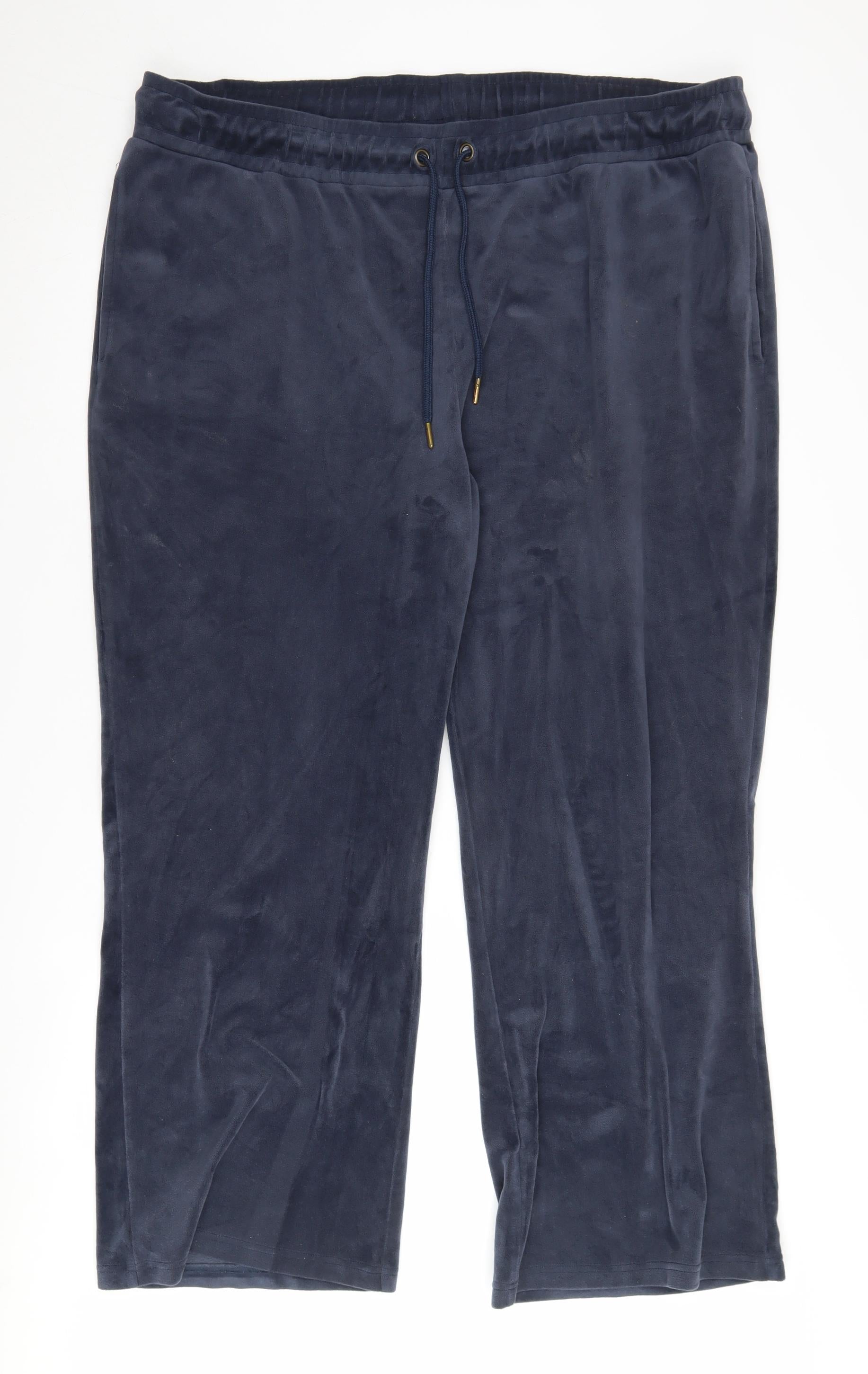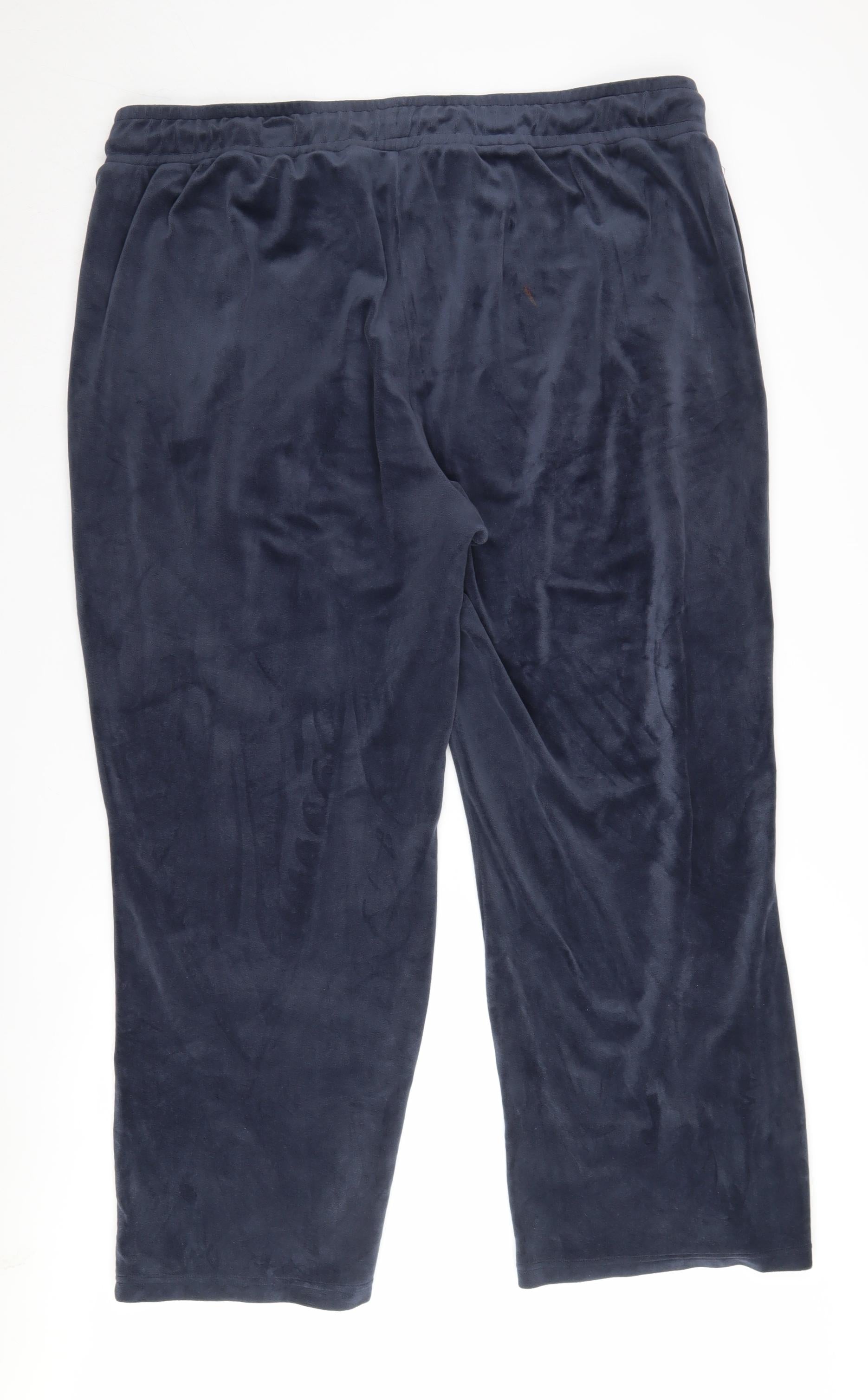 Introducing the Cotton Traders Women's Velour Joggers in an elegant shade of blue. Perfectly crafted for the autumn and winter seasons, these trousers are designed for maximum comfort and style. Made with a premium blend of 83% polyester and 7% elastane, they offer a relaxed fit that is superbly soft to the touch. The elastic waist and drawstring closure ensure a secure and customizable fit, while the wide-leg style adds a modern twist to the traditional jogger look. Ideal for casual occasions, these joggers provide a luxurious feel and classic style, making them perfect for lounging or running errands. Although preloved, they remain in good condition with a minor visible stain that adds character without compromising wearability. Perfect for those who appreciate both practicality and fashion, these joggers reflect Cotton Traders' dedication to quality and comfort. Elevate your wardrobe with this essential item, a blend of luxury and casual chic you can wear all day.