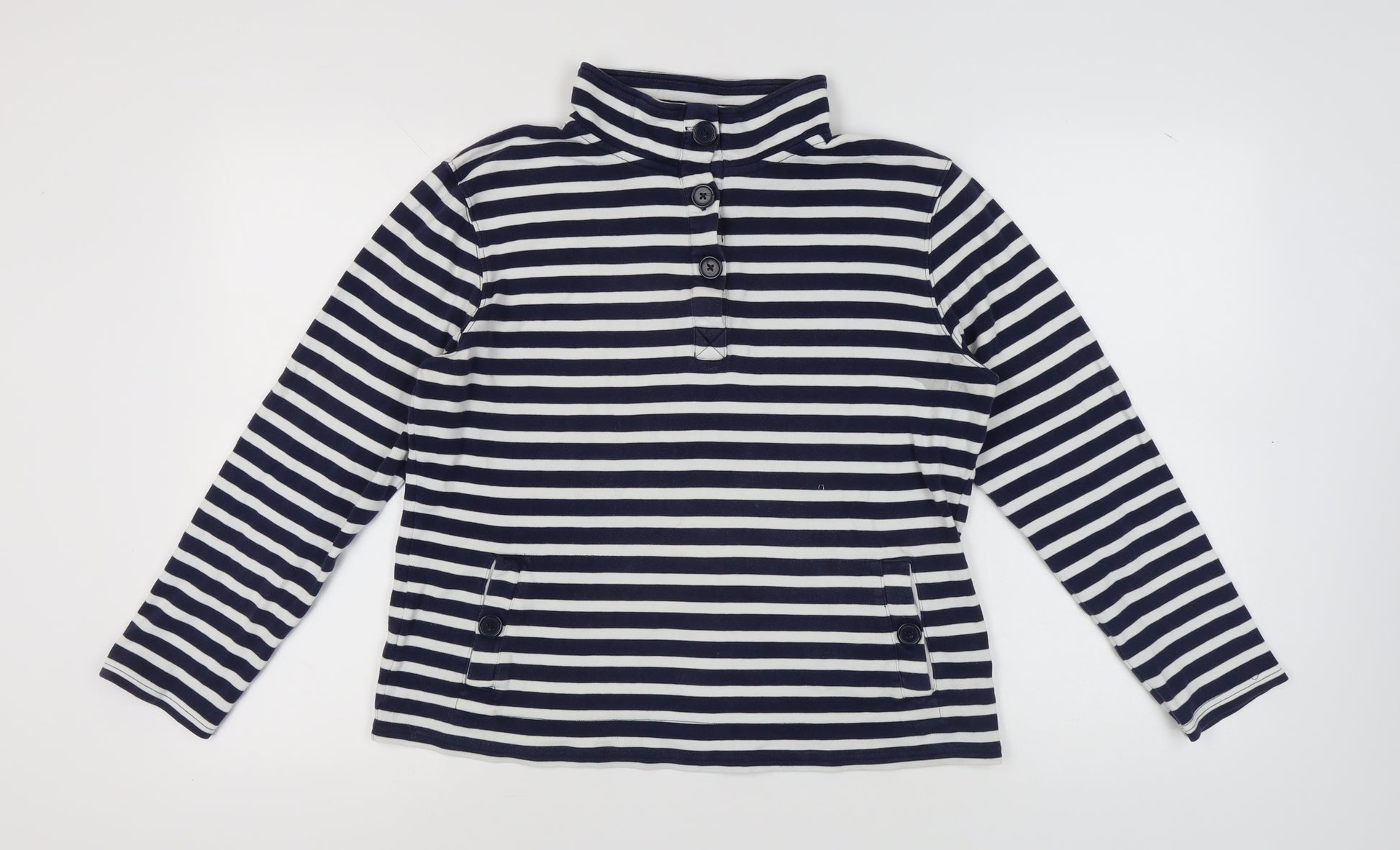 Step into casual comfort and timeless style with this Cotton Traders Women's Navy Striped Henley Sweatshirt. Crafted from 100% cotton, this jersey fabric sweatshirt promises breathability and comfort for daily wear. The classic striped pattern in navy adds a nautical touch, making it a versatile piece for both autumn and spring. Featuring a henley neckline with button accents, this sweatshirt exudes a laid-back yet sophisticated vibe, perfect for casual outings. It comes in a regular fit, tailored to enhance your silhouette without compromising on comfort. Designed with long sleeves, it offers adequate coverage, keeping you warm during chilly days. Ideal for layering, this sweatshirt is an essential addition to your wardrobe. Whether you're stepping out for a casual day with friends or just enjoying a quiet day at home, this piece effortlessly fits the bill. Machine washable for easy care, it maintains its softness and shape, wear after wear. Elevate your casual ensemble with this relaxed yet stylish sweatshirt, and enjoy the perfect blend of fashion and functionality.