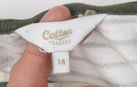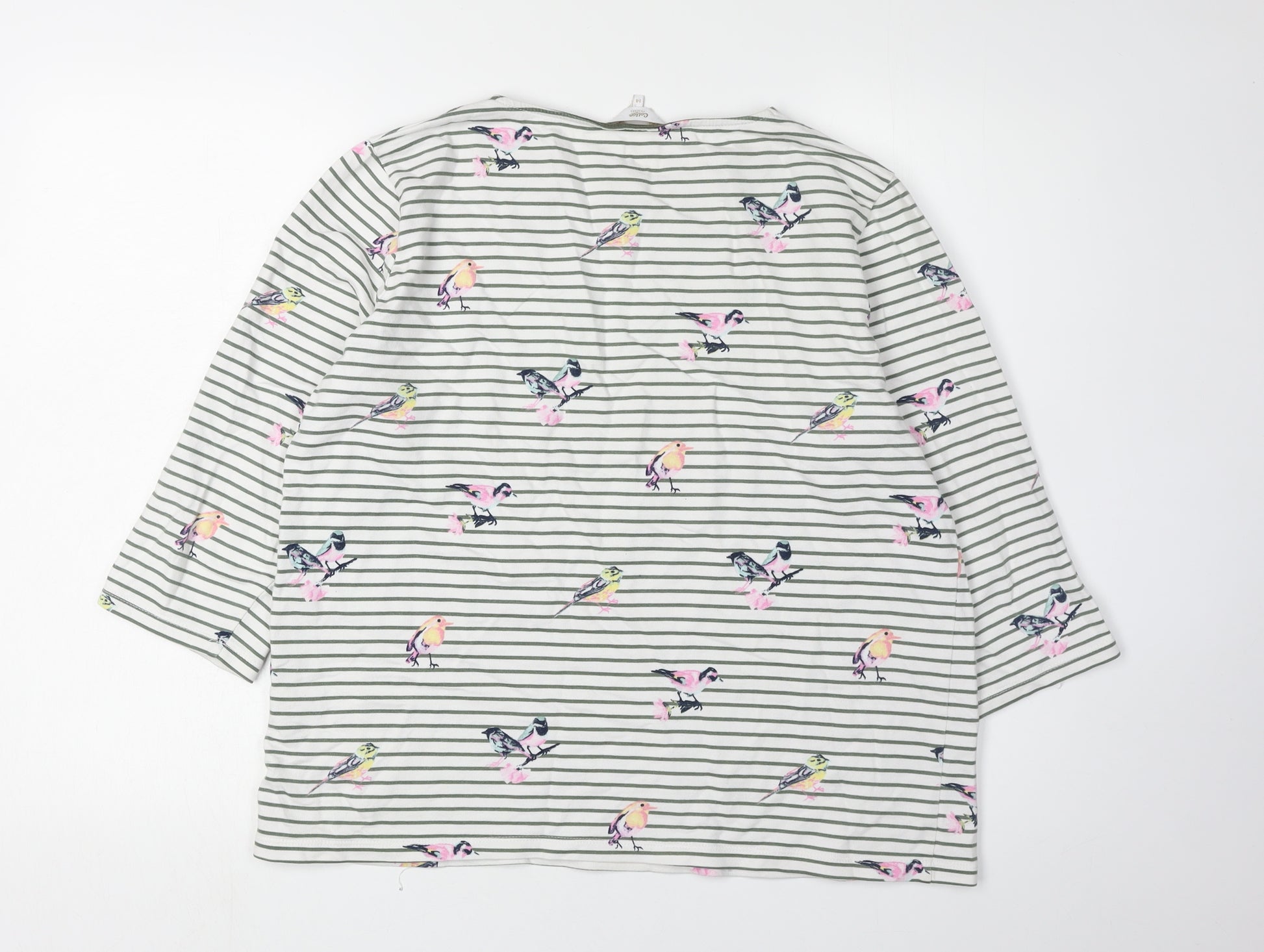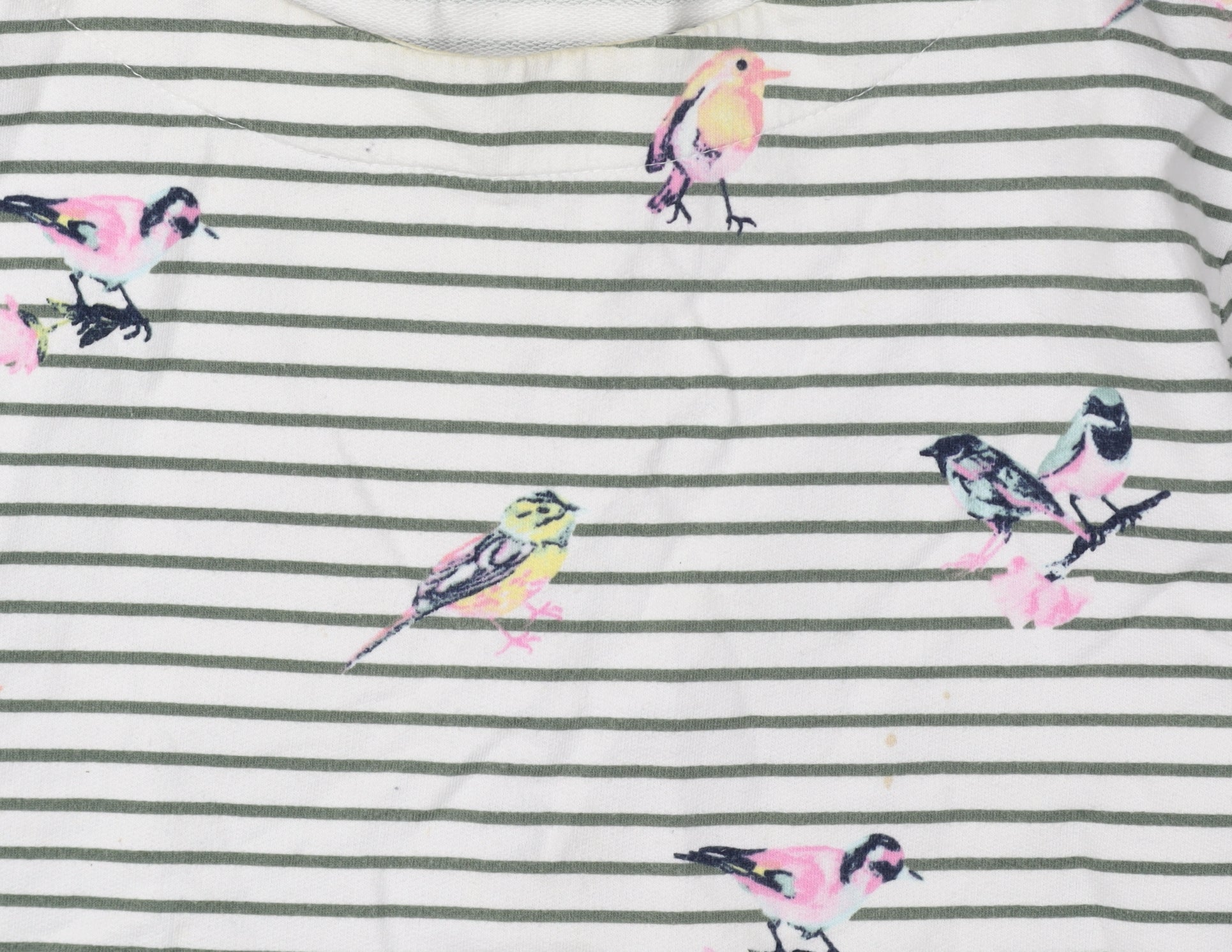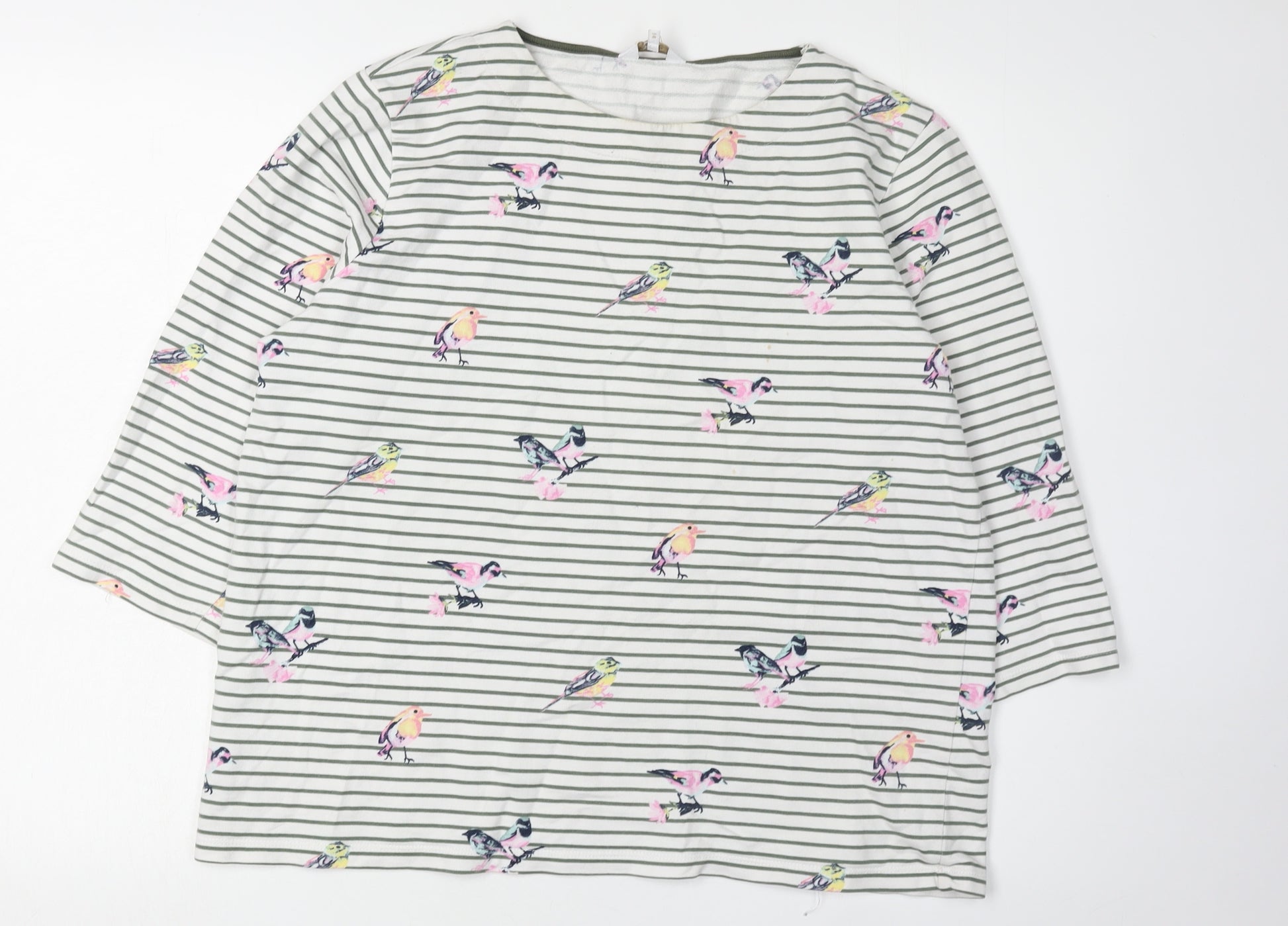 Elevate your casual wardrobe with this charming bird print T-shirt by Cotton Traders. Perfect for a relaxed day out, this top features a playful striped pattern with colourful bird accents, bringing a touch of whimsy to your ensemble. The 3/4 sleeves and crew neck offer a classic, comfortable fit that makes it ideal for casual wear. Crafted from 100% cotton, this T-shirt ensures breathability and comfort throughout the day, making it a staple piece for any season. Although rated in very good condition, minor stains are present, which only slightly discourage from the piece’s charm. Easy to maintain, this machine-washable T-shirt ensures stress-free care and long-lasting durability. Pair it with your favourite jeans or shorts for a delightful, laid-back look perfect for picnics, casual outings, or weekend getaways. Experience the unique blend of comfort and style that Cotton Traders always delivers with this versatile, must-have addition to your wardrobe. Secure this piece for a great price and enjoy wearing a T-shirt that feels as good as it looks.
