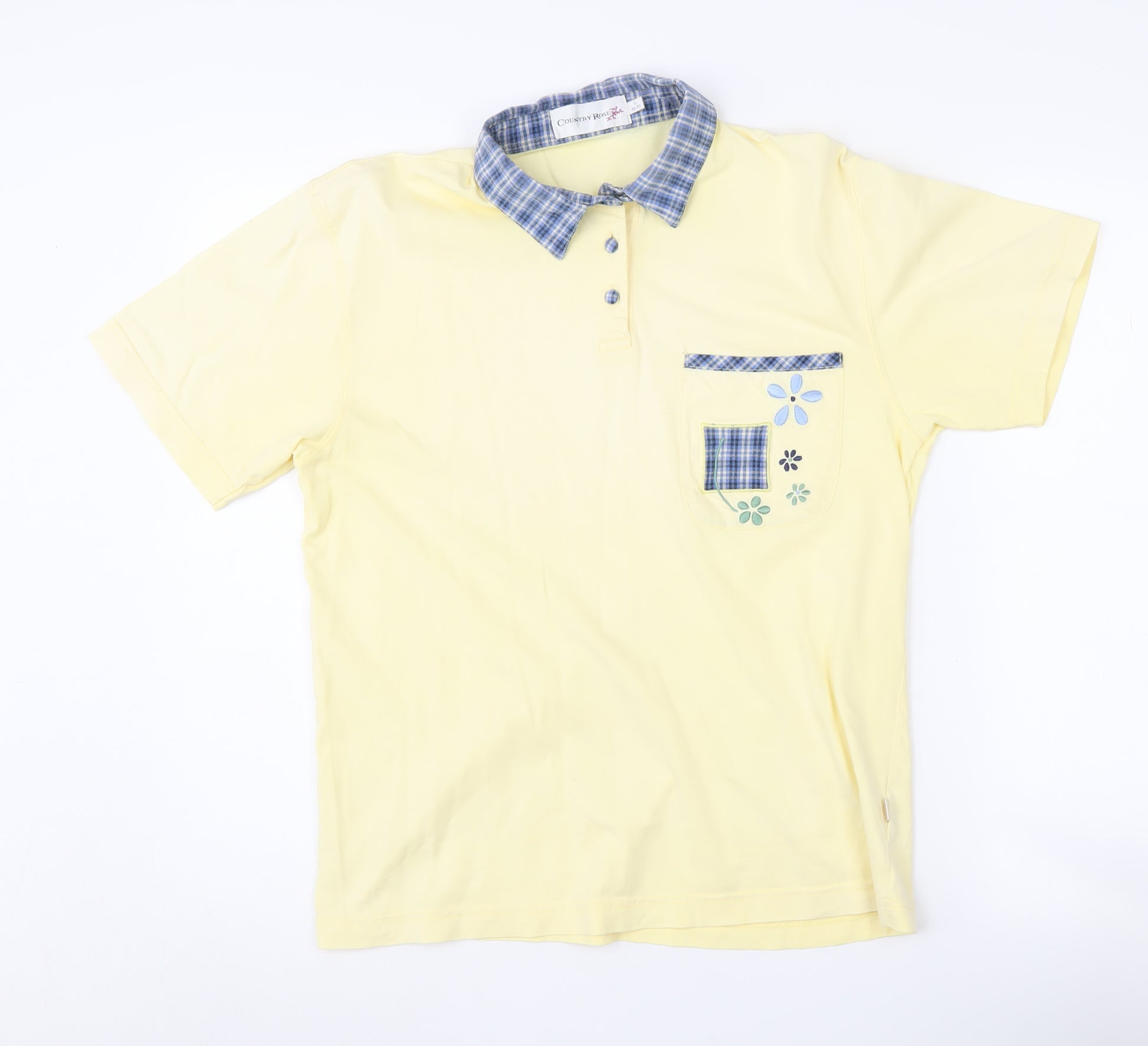 This charming yellow polo shirt by Country Rose is a delightful addition to any wardrobe, perfect for both spring and summer. Crafted from 100% cotton, this garment ensures a comfortable and breathable fit. The shirt features a distinctive collared neckline and short sleeves, adding a touch of casual elegance to your everyday looks. The embroidered floral accents on the pocket, paired with a subtle check pattern on the collar and pocket, give this polo a unique and stylish look. Designed for women with a regular size S fit, this versatile top is great for casual outings or relaxed get-togethers. Despite a small mark on the pocket, the overall condition is very good, offering you a chic and affordable choice at just £12.75. Machine washable, it promises easy care, making it a practical yet stylish option for your casual occasions. Don’t miss out on this beautiful Country Rose piece, perfect to brighten up your wardrobe with its vibrant yellow hue and delicate floral theme.