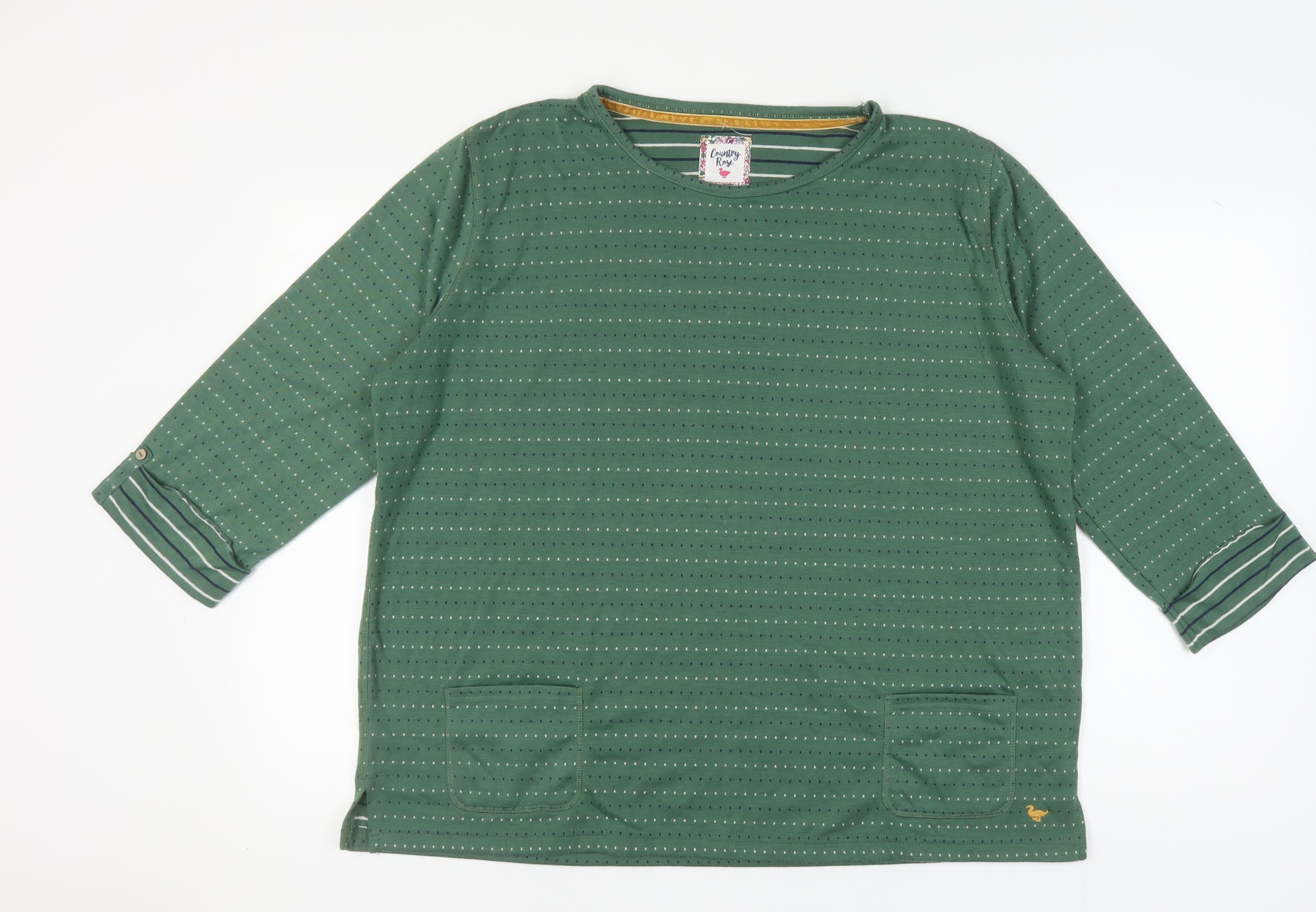 This relaxed fit T-shirt by Country Rose is a versatile addition to any casual wardrobe. Crafted from a comfortable blend of 90% polyester and 10% cotton, this piece is perfect for transitioning through the seasons, especially Autumn. The green colourway with a subtle striped pattern adds a touch of elegance, making it ideal for various casual occasions. The long sleeves and round neck provide a classic silhouette, ensuring you stay stylish while providing enough warmth on cooler days. Whether paired with jeans for a laid-back look or layered under a jacket, this top offers a blend of fashion and functionality. Machine washable for easy care, it's designed for the modern woman who appreciates comfort without compromising on style.