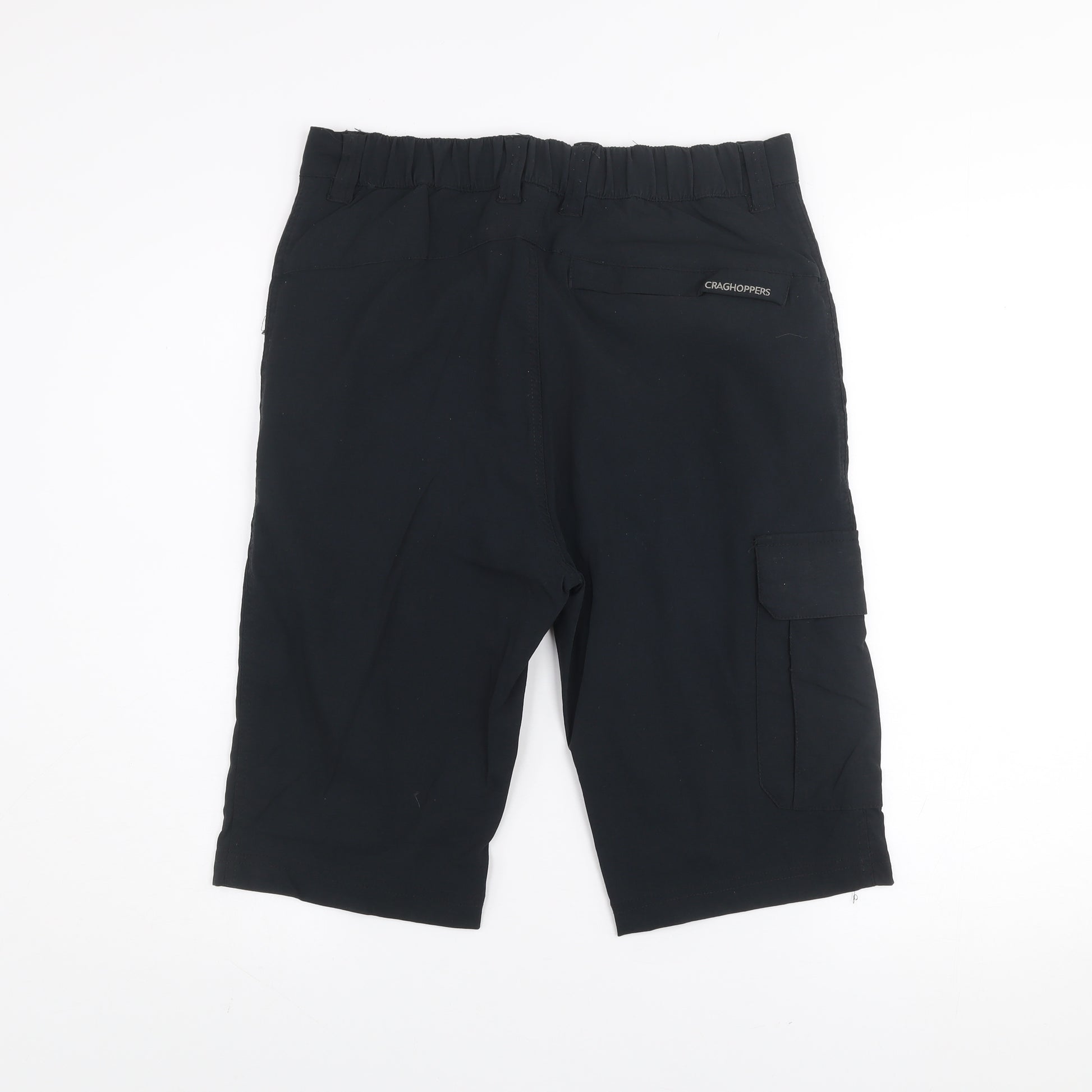 These Craghoppers men's black cargo shorts are designed for versatility, practicality, and comfort, making them an excellent choice for outdoor adventures, travel, or casual wear. Crafted from a lightweight blend of polyamide and elastane, these shorts offer flexibility, breathability, and quick-drying performance, ideal for active lifestyles. The water-resistant fabric ensures reliable protection from light rain and splashes, while the durable construction provides long-lasting wear and comfort in any environment. Featuring a size L fit with a UK 34-inch (86 cm) waist, these shorts offer a regular fit with an elastic waistband for optimal flexibility and comfort. They include a flat front design, secured by a zip and button closure, providing a clean and practical finish. Multiple pockets, including convenient zip and cargo pockets, make these shorts perfect for securely carrying essentials on the go. Whether you're hiking, travelling, or enjoying a relaxed day outdoors, these shorts are built to perform and adapt to your needs. The understated black colour pairs perfectly with a wide range of casual and active looks, while subtle Craghoppers logo accents add a touch of signature style. As with most Craghoppers designs, the focus on function combines effortlessly with timeless simplicity, ensuring these shorts remain a staple in any wardrobe. Machine washable for easy care, they maintain quality and shape wear after wear. These shorts are pre-loved and remain in excellent condition, showing light signs of wear but no defects or damage. Ideal for those who value quality outdoor clothing designed with both practicality and understated style in mind, they represent a dependable, comfortable, and stylish option for everyday adventure or leisure. With their smart outdoor-ready design and durable technical fabric, these Craghoppers cargo shorts are a fantastic addition for the active man looking for reliability and comfort in equal measure.