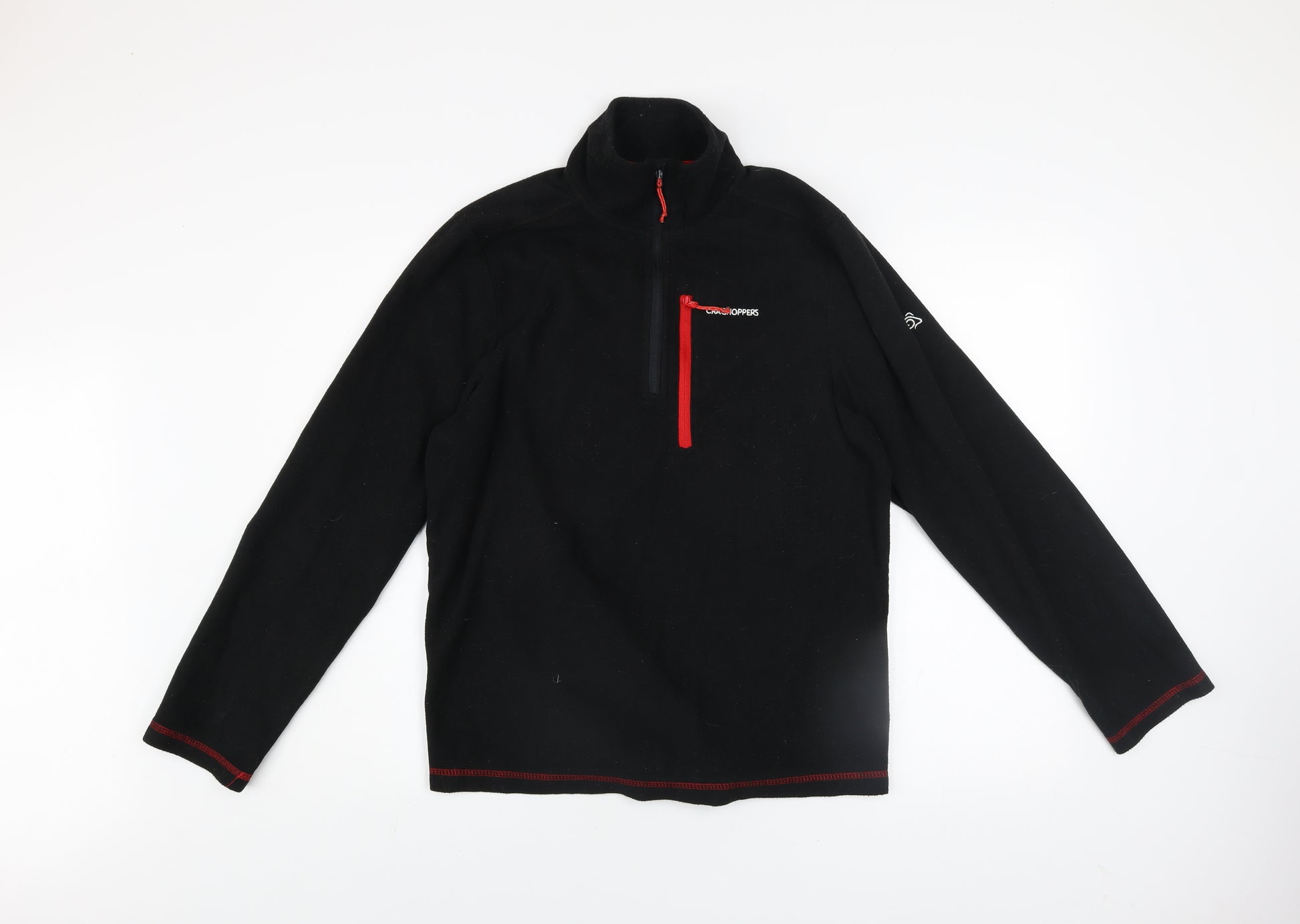 Elevate your outdoor wardrobe with this Craghoppers Men's Black Fleece 1/4 Zip Pullover Sweatshirt in size Small. Designed for comfort and practicality, this warm and breathable fleece top is perfect for both casual wear and outdoor adventures. Crafted from 100% polyester fleece, it offers lasting softness, lightweight insulation, and quick-drying performance ideal for hiking, walking, or layering in cooler weather. The design features a smart black colourway accented with red zip detailing and subtle Craghoppers branding, providing a stylish yet functional look. The quarter-zip closure allows for easy ventilation and a custom fit around the high neck to retain warmth, while the chest zip pocket offers secure storage for small essentials. The fleece material ensures durability and comfort, making it a reliable layer through multiple seasons—autumn, winter, and spring. This pullover sweatshirt is a classic choice for men who value versatility and performance in their clothing. Its lightweight and breathable nature makes it suitable for all-day wear, whether exploring the outdoors, commuting, or relaxing at home. The regular fit ensures freedom of movement without feeling bulky, while the fleece texture adds a touch of softness against the skin. Used but in excellent condition, this garment shows minimal signs of wear, with only light lint from handling. Based on similar listings for comparable Craghoppers fleeces, this piece is competitively priced for quality-conscious buyers looking for great value. A practical and stylish addition to any active man’s wardrobe, this fleece delivers dependable warmth, durability, and brand trustworthiness synonymous with Craghoppers. Perfect for anyone seeking a reliable and fashionable layering piece ready for all seasons.