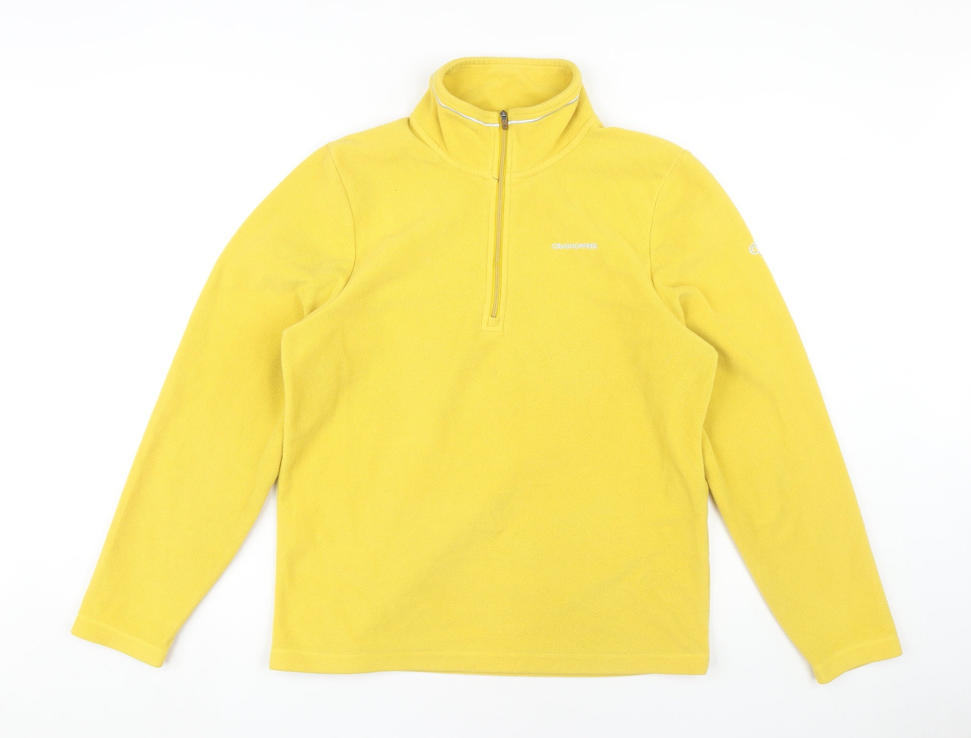This Craghoppers Men's Yellow Fleece Pullover Sweatshirt is perfect for those cooler autumn and winter days. Crafted from 100% polyester, this sweatshirt offers lightweight warmth and comfort. Its high neck and 1/2 zip design provide versatility in style and function, making it an ideal choice for layering. This vibrant yellow sweatshirt with a regular fit is machine washable, ensuring easy care and maintenance. Designed for men, it features long sleeves to keep you cosy while maintaining a sporty yet casual look. Whether you're enjoying a brisk walk or just relaxing at home, this fleece pullover is both practical and stylish. The absence of any additional accents keeps the design clean and simple, focusing on quality and comfort. Ideal for anyone seeking a reliable piece of clothing to add to their wardrobe, this sweatshirt showcases the excellent craftsmanship synonymous with the Craghoppers brand. Available in size S, it is tailored to fit comfortably, making it a great option for everyday wear.