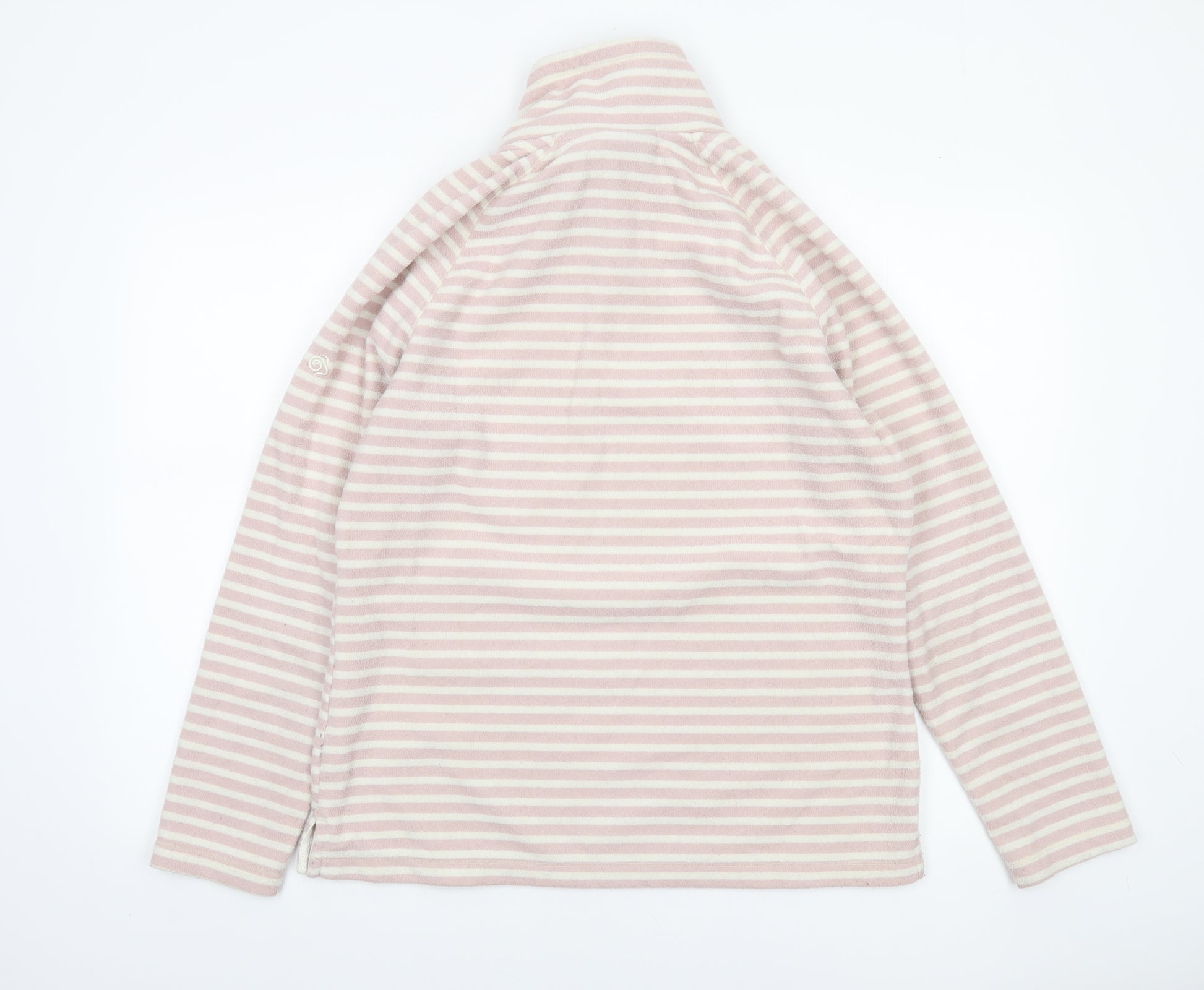 Stay comfortable and stylish in this Craghoppers Women’s half-zip fleece sweatshirt, perfect for outdoor adventures or cosy days indoors. Crafted with a soft, warm fleece fabric, this pullover provides lightweight insulation and breathability, ideal for layering during autumn and winter seasons. The soft pink and white horizontal stripe design adds a fresh, feminine touch, making this a versatile piece that pairs beautifully with jeans, walking trousers or leggings. Featuring a practical 1/2 zip closure for easy wear and ventilation, the high neck design helps retain warmth on cooler days while its raglan sleeve construction offers better movement and comfort for active pursuits. The relaxed fit ensures ease of layering, whether you’re out for a brisk walk, hiking in the countryside, or lounging at home. Designed by Craghoppers, a trusted British brand known for durable and functional outdoor wear, this sweatshirt combines practicality with simple style. The 100% polyester fleece material ensures soft comfort and reliability, while being easy to care for and machine washable. In excellent pre-owned condition, it shows minimal signs of previous use and remains in great shape with no visible marks or damage noted. Perfect for casual wear, travel, or outdoor adventures, this Craghoppers fleece will keep you snug and stylish whatever the weather. Offering warmth without bulk, it’s an ideal everyday essential for anyone seeking comfort and practicality with a touch of classic design. Size UK 14 for a regular, relaxed fit. Don’t miss the chance to add a high-quality, dependable outdoor piece to your wardrobe – perfect for year-round comfort and activity-ready style.