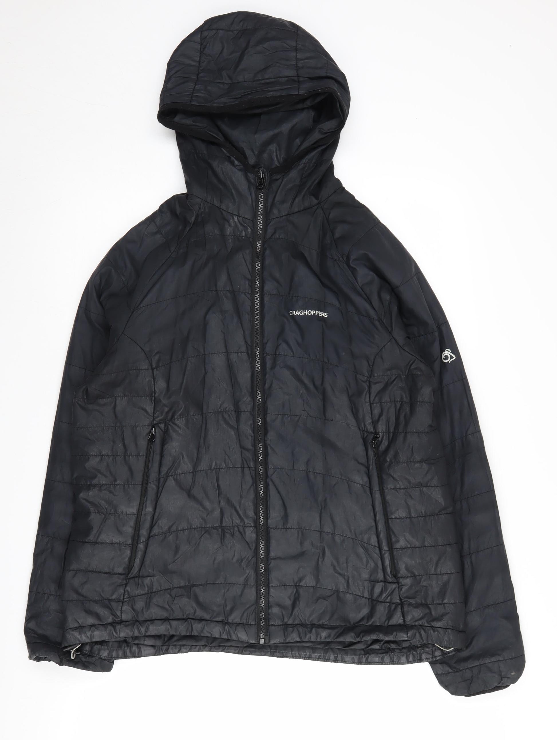 Embrace the chill with the Craghoppers Women's Black Puffer Jacket, a stylish and practical choice for the colder months. Crafted with 100% durable polyester, this jacket promises both comfort and longevity, making it an excellent addition to your winter wardrobe. The timeless black colour ensures versatility, easily pairing with any outfit. Ideal for various occasions, including casual outings and travel, this puffer jacket is designed to keep you warm and stylish simultaneously. The jacket features a secure zip closure and a cosy hood, perfect for braving unpredictable weather conditions. Additionally, the convenient zipped pockets provide ample space for carrying essentials like keys and mobile phones. The jacket's regular fit makes it a comfortable choice for everyday wear, accommodating layering effortlessly. Ideal for winter and autumn seasons, the Craghoppers Puffer Jacket is your go-to option for chic and practical outdoor wear. Despite showing some minor signs of wear, this jacket is in very good condition and is sure to meet your needs for winter adventures.