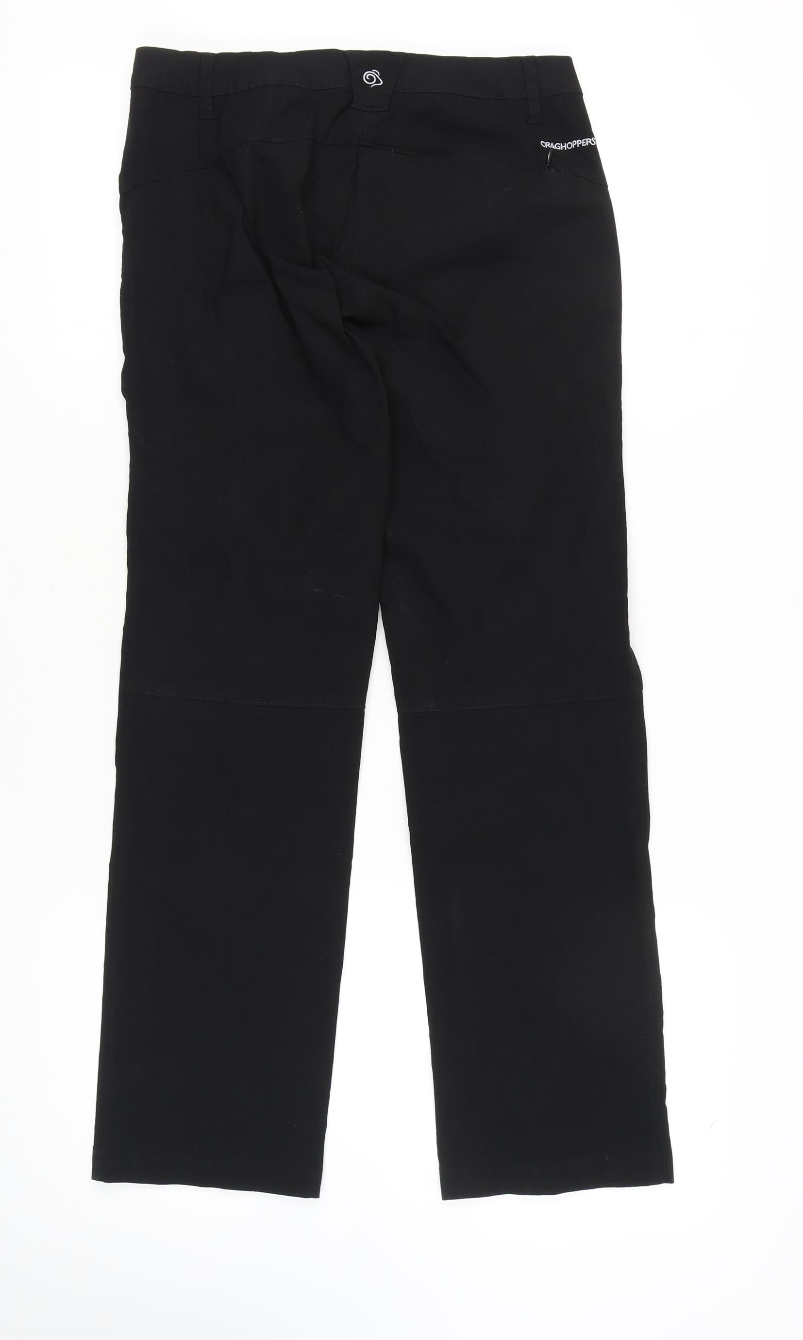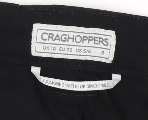 Discover the perfect blend of style and functionality with these sleek Craghoppers women's trousers. Designed in a classic black hue, these trousers offer a stylish straight leg fit, making them a versatile addition to any wardrobe. Crafted from a durable mix of 96% polyamide and 4% elastane, they provide comfort and flexibility whether you're out on a casual day or a light outdoor activity. The inclusion of practical pockets ensures added convenience while the subtle logo accent adds a touch of brand authenticity. Designed for machine washability, these trousers are easy to care for, ensuring they maintain their excellent condition with minimal wear visible. Ideal for those who value comfort without compromising on style, these trousers are perfect for everyday wear and appeal to women seeking a regular fit. With a modern flat front design and reliable button and zip closure, they are both functional and fashionable. Embrace versatility and comfort with these Craghoppers trousers, available now in size 10.