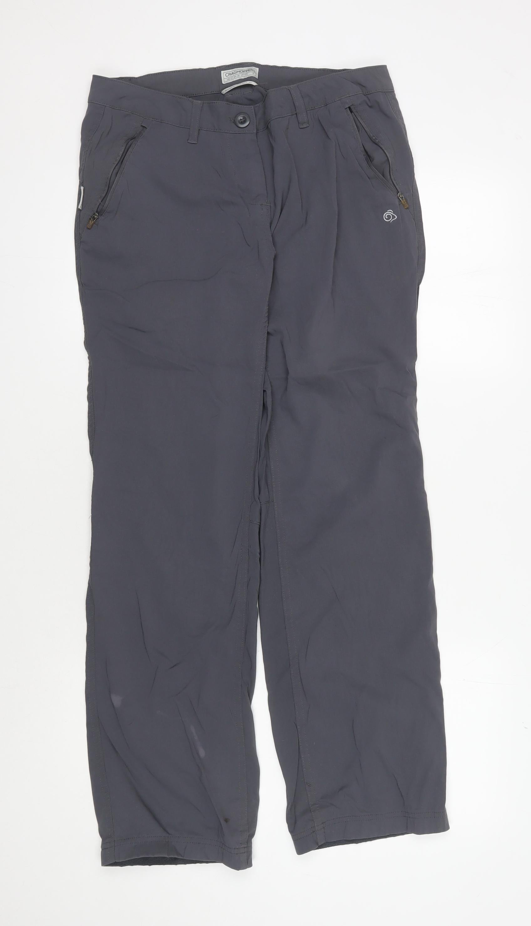 Discover the perfect balance of functionality and style with these Craghoppers women's trousers in a classic grey shade. Ideal for travel and daily adventures, these trousers boast a practical straight-leg design. They are crafted from lightweight polyamide, ensuring comfort and ease of movement. With a mid-rise fit, they cater to a regular size type, providing a flattering silhouette for everyday wear. The trousers come equipped with convenient pockets and feature both a zip and button closure for added functionality. Designed to be machine washable, they are easy to care for, making them a versatile addition to your wardrobe. Whether you're off on a casual outing or embarking on a travel journey, these trousers promise to be a reliable companion. Note the slight marks on the fabric, which reflect their very good condition and unique character. Priced attractively, they offer excellent value for those seeking quality and practical design in their everyday apparel.