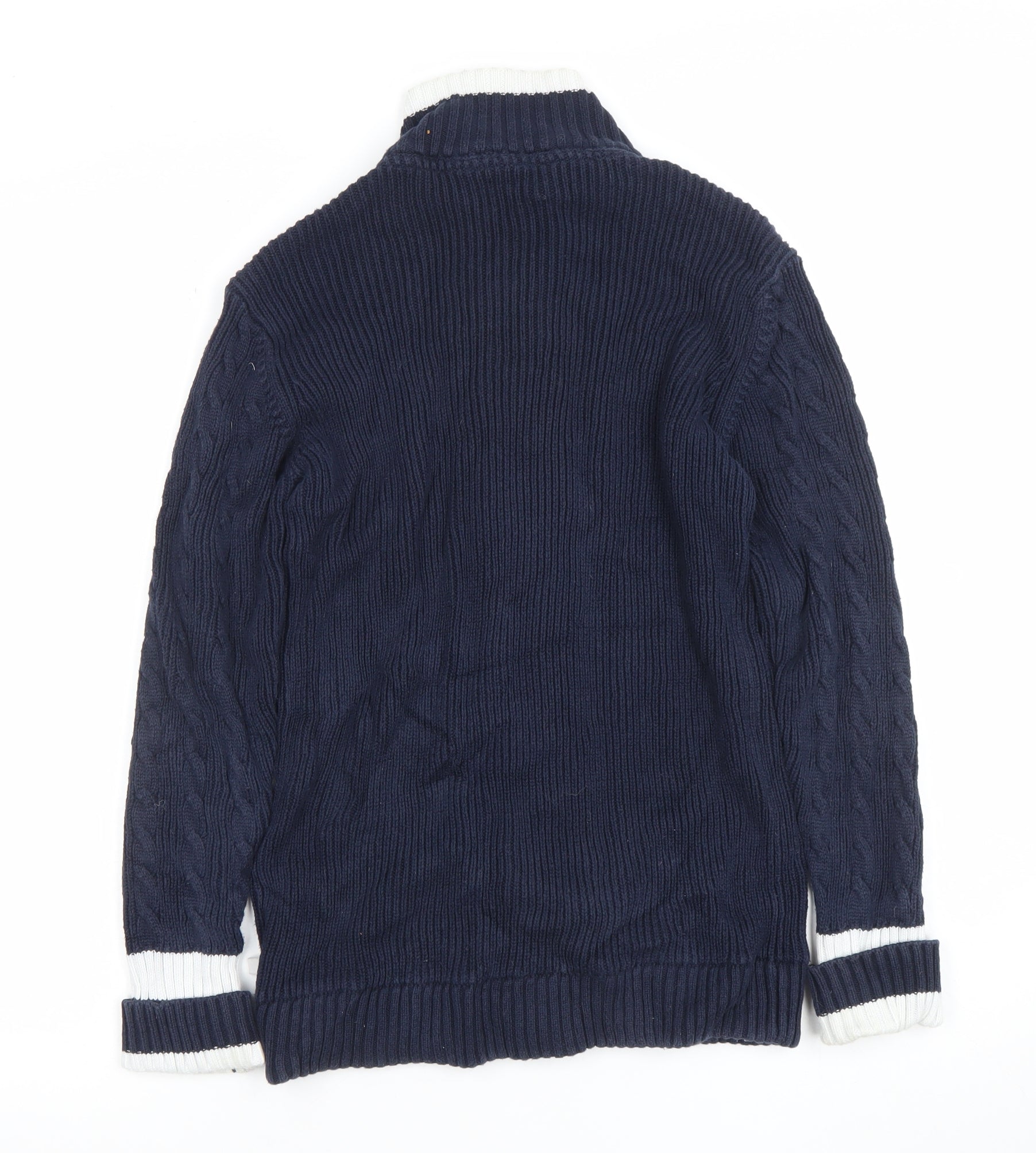 This Crew Clothing Co. women's blue cable knit cardigan in size 8 delivers a timeless and versatile piece perfect for everyday wear. Crafted from 100% cotton, the soft knit fabric ensures comfort and breathability across all seasons. The rich navy blue tone, accented with white ribbed cuffs and collar, adds a refined nautical-inspired touch that pairs effortlessly with various outfits. Featuring a full button front and a collared neckline, it offers both practicality and style for layering over blouses, shirts, or casual tops. The long sleeves and ribbed edges provide a snug yet flexible fit, while the cable-knit style enhances texture and visual depth, giving this cardigan a polished classic look. Perfect for casual occasions, office layering, or a relaxed weekend ensemble, its design speaks to understated elegance and reliable quality. The medium-weight cotton knit makes it a great year-round choice, especially during transitional seasons like spring and autumn.In very good pre-owned condition, this cardigan shows minimal signs of wear with only a small mark on the front panel that does not detract from its overall appearance. It maintains the integrity and comfort Crew Clothing Co. is known for, reflecting durability and timeless coastal-inspired fashion. This item’s pure cotton composition makes it easy to care for—machine washable for convenience and softness retention. A wardrobe essential, this cardigan is ideal for women who appreciate laid-back sophistication blended with a touch of British coastal style. Whether paired with jeans for a relaxed weekend, worn over a dress for an added layer of warmth, or styled with chinos for a smart-casual look, it’s a versatile piece you’ll reach for time and again. With its flattering regular fit, button detailing, and breathable knit fabric, this Crew Clothing Co. cardigan perfectly balances comfort and effortless charm.