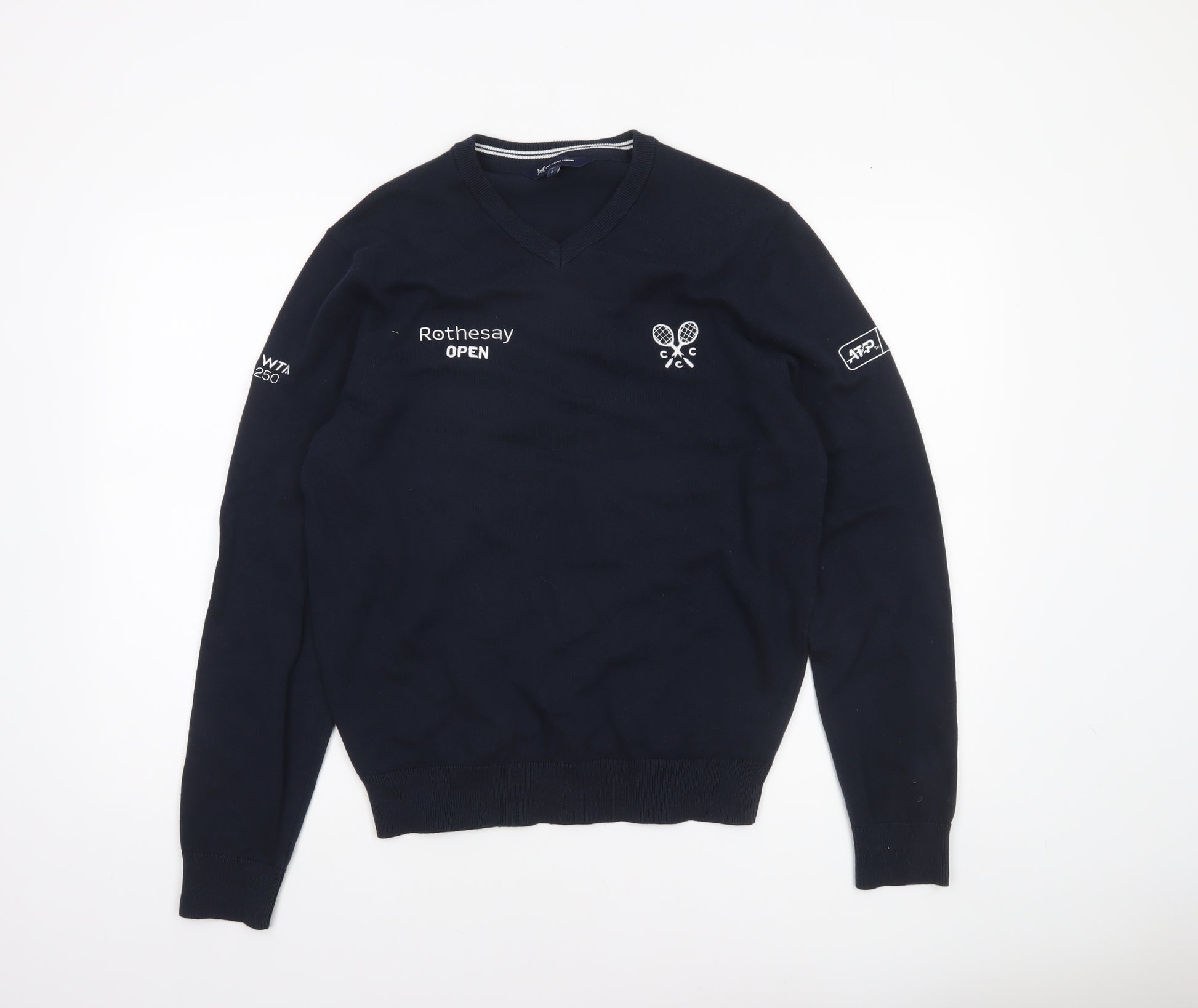 Step out in effortless style with this Crew Clothing Company men’s V-neck pullover jumper in a classic navy blue shade. Designed with understated sophistication, this piece features fine knit cotton that offers both comfort and breathability for all-day wear. Perfect for layering or wearing on its own, it suits a smart-casual wardrobe with ease. The jumper showcases the embroidered Crew Clothing logo on the chest and additional tennis-themed embroidery including 'Rothesay Open' and 'WTA 250', celebrating the refined yet sporty aesthetic of Crew Clothing Company’s heritage. Crafted from 100% cotton, it delivers a soft hand feel and long-lasting quality. The ribbed cuffs, hem, and neckline ensure a comfortable fit and maintain the jumper’s shape over time. Designed for a regular fit, it works perfectly for everyday styling, whether paired with chinos, jeans, or shorts. Breathable and lightweight, this jumper is the ideal layering piece for transitional weather—perfect for spring, autumn, and mild winter days. Machine washable for easy garment care, it’s made to be practical as well as stylish. This Crew Clothing Company jumper offers all-season wearability and a timeless look that suits business-casual outings, weekends, or social events. Completing the look is its embroidered detailing that reflects both quality craftsmanship and a subtle nod to leisure sports such as tennis and golf. Ideal for men with discerning taste in relaxed yet premium casualwear, this blue V-neck jumper delivers both comfort and charm, making it an essential addition to any wardrobe.