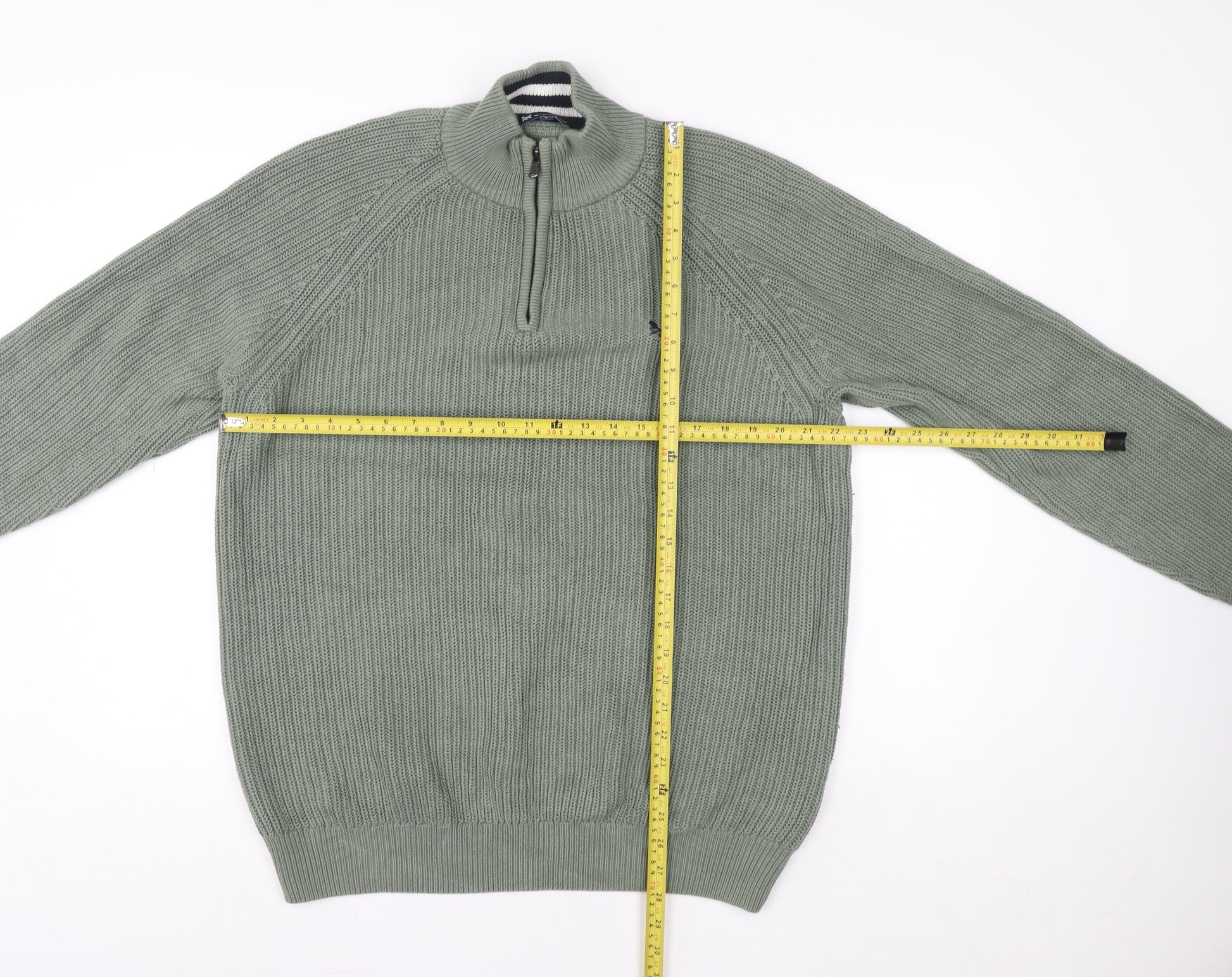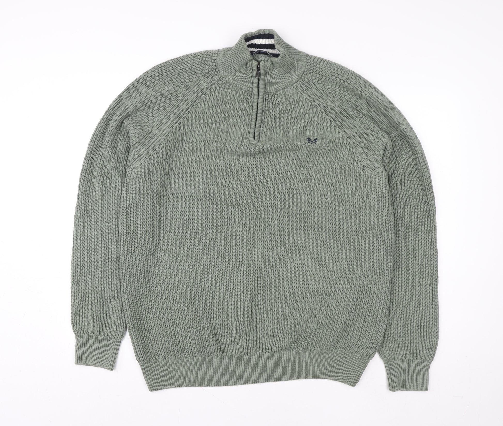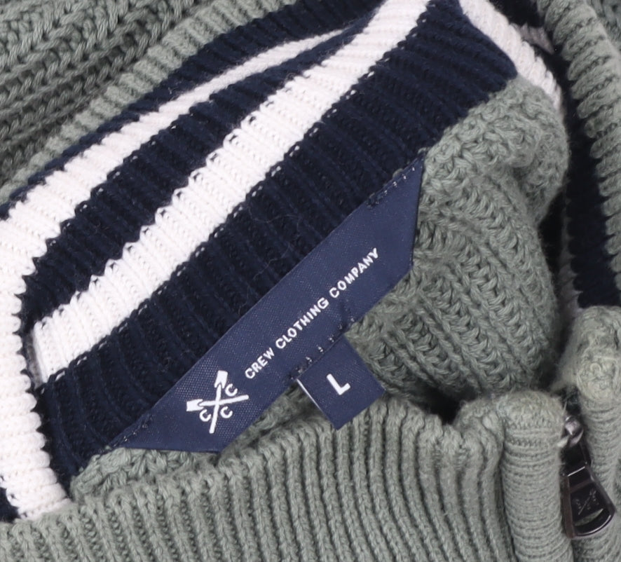 This Crew Clothing Company men’s green 1/4 zip sweatshirt brings together classic British style and comfort. Crafted from 100% cotton in a breathable knit finish, it offers a soft yet durable wear for cooler days. The mock neck with quarter zip detail adds versatility, allowing you to adjust for comfort whether layered over a shirt or worn on its own. The ribbed cuffs and hem ensure a tailored, secure fit that retains its shape with wear, while the subtle embroidered Crew Clothing crossed oars logo on the chest adds a refined touch of branding. Designed in a regular fit, this jumper provides easy movement without compromising style, making it ideal for everyday wear or smart-casual occasions. The lightweight cotton knit construction keeps it suitable for multiple seasons — perfect for autumn evenings, spring walks, or layering through winter. Combining practicality and enduring appeal, the zip neckline enables quick temperature regulation, making it a go-to piece for relaxed weekends, coastal strolls, golf rounds, or casual outings. Its muted green tone is versatile enough to pair effortlessly with jeans, chinos, or shorts, bringing understated elegance to any outfit. Comfortable against the skin and easy to care for, this machine washable piece promises long-lasting quality. In excellent used condition with only light wear and no notable flaws, this piece has been carefully checked to ensure continued comfort and style. Offering a timeless blend of functionality and sophistication, this Crew Clothing Company 1/4 zip sweatshirt embodies modern coastal living with a touch of heritage charm — the ideal staple for those who appreciate enduring design and comfort-driven craftsmanship.