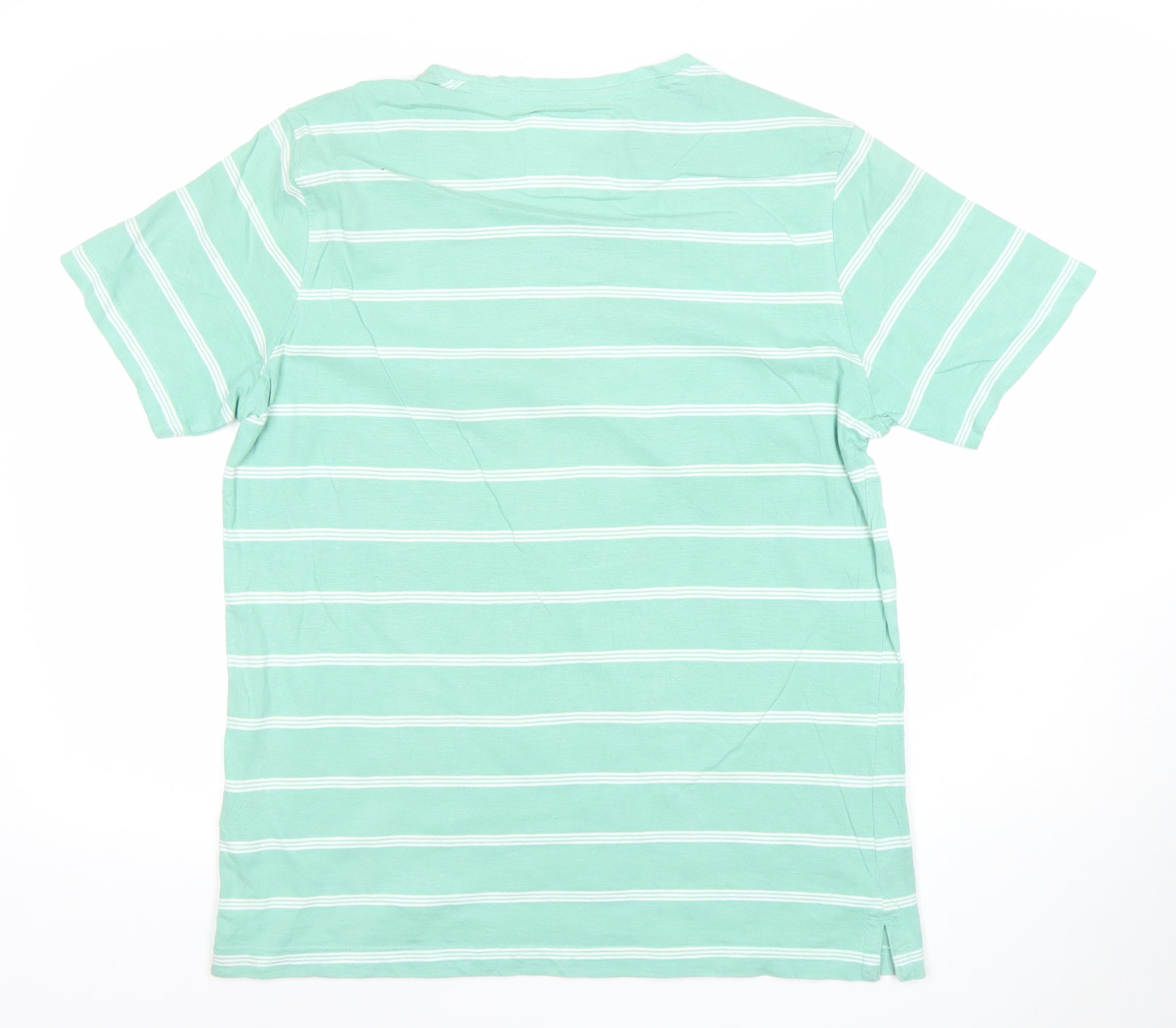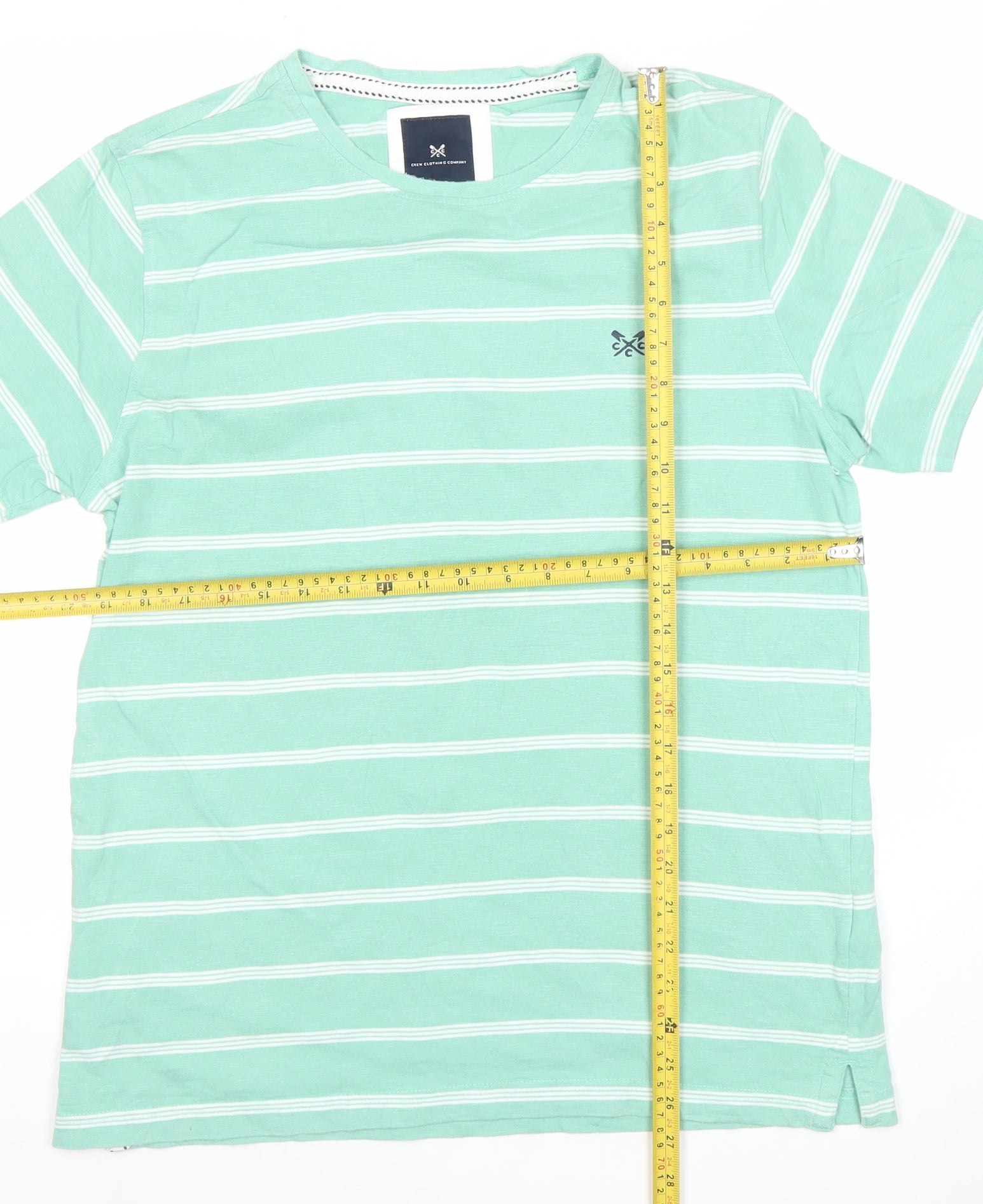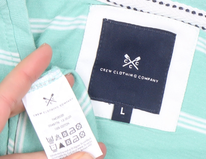 Elevate your casual wardrobe with this Crew Clothing Company men’s T-shirt, designed for comfort and everyday style. Crafted from 100% cotton in a soft, breathable jersey fabric, this classic striped tee ensures lasting quality and ease of wear. Its pale green hue, complemented by crisp white horizontal stripes, offers a fresh, coastal-inspired look perfect for the warmer months. With its regular fit and short sleeves, it provides versatile comfort for laid-back days, outings, or holiday wear. The neatly finished crew neckline adds a timeless touch, while the small embroidered Crew Clothing logo on the chest lends an understated designer accent. Designed to keep you cool and comfortable, it’s ideal for pairing with denim shorts, chinos, or your favourite jeans. Machine washable and easy-care, this T-shirt combines practicality and effortless style for the modern man. Whether you’re strolling along the beach, meeting friends for a casual lunch, or looking for a reliable everyday essential, this Crew Clothing Company T-shirt delivers the perfect balance of quality and simplicity. Its lightweight construction allows for all-day comfort, while the striped design adds a touch of nautical charm to your outfit. A must-have spring and summer staple that reflects the brand’s coastal heritage with practicality and refined ease. Presented in excellent pre-owned condition with only minimal signs of wear, it remains fresh and ready for its next stylish outing.