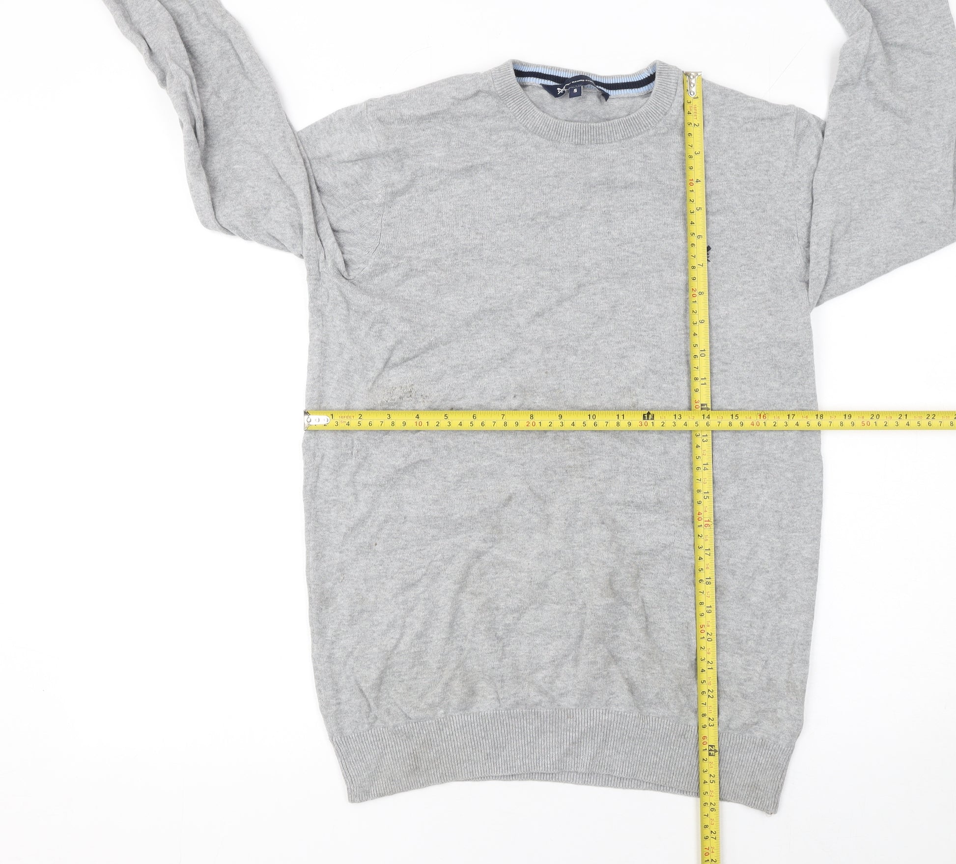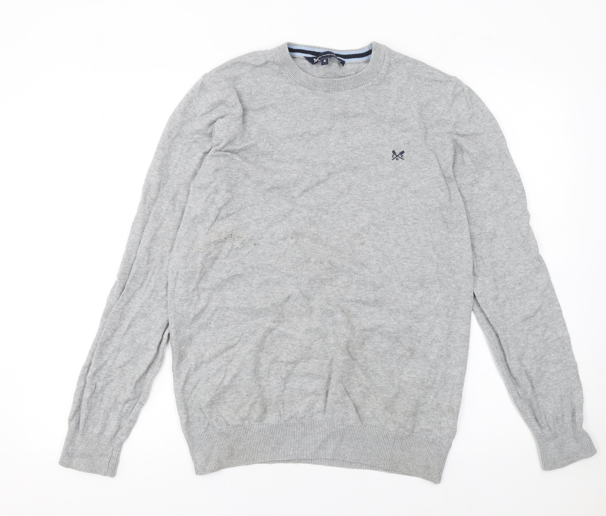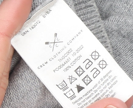 This stylish grey jumper from Crew Clothing Company is a timeless wardrobe essential for any man seeking both comfort and sophistication. Crafted entirely from soft, breathable cotton, this crew neck pullover offers an easy, relaxed fit that’s perfect for layering or wearing on its own. The classic grey colour makes it highly versatile, pairing effortlessly with jeans, chinos or trousers for a refined yet casual look that suits any season.The simple design is enhanced by the brand’s signature logo embroidered on the chest, adding a subtle touch of distinction. With a ribbed hem, cuffs, and neckline, this jumper retains its shape and gives a neat finish while keeping you comfortable throughout the day. The lightweight knit construction makes it suitable for autumn, winter, and spring wear, ensuring year-round practicality.While the jumper shows some light marks and signs of use, it remains in good wearable condition and offers the same dependable quality Crew Clothing Company is known for. Ideal for casual outings, weekends away, or relaxed days at work, it’s a reliable piece that balances style with comfort.A perfect layering item under jackets or over shirts, this men’s pullover jumper is a must-have for those who appreciate understated elegance and durability. Easy to care for and machine washable, it delivers effortless maintenance along with enduring everyday wearability. The combination of timeless design, classic fit, and quality cotton fabric ensures it remains a smart addition to any modern man’s collection.