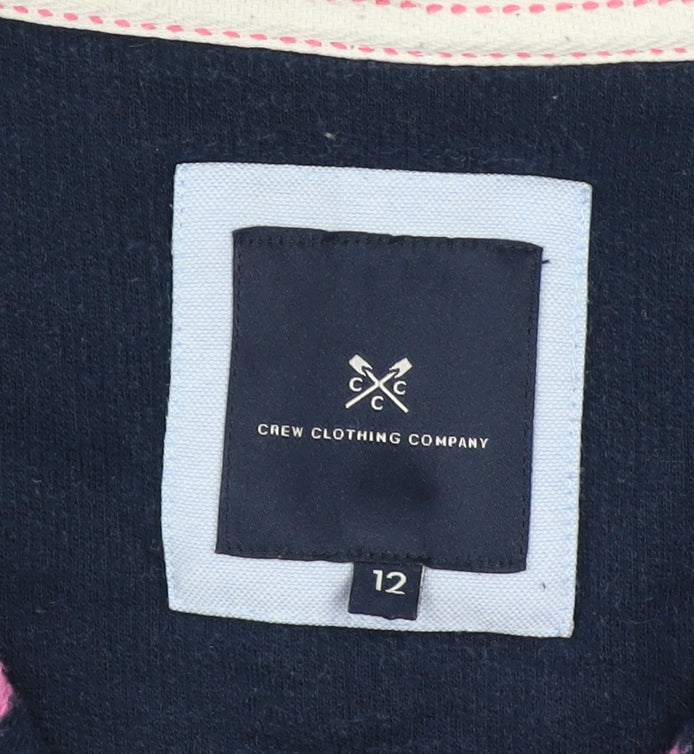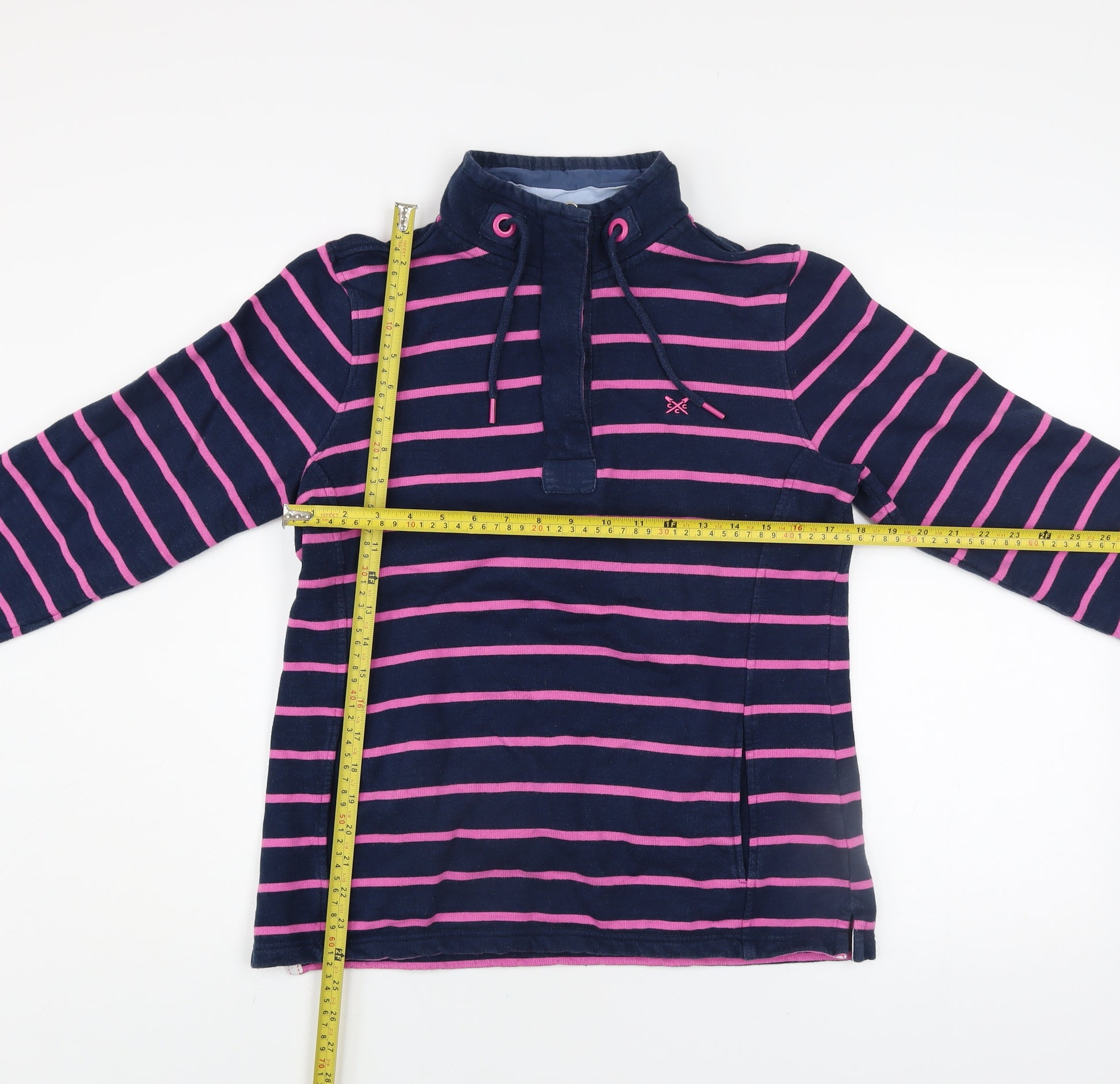 Add a touch of nautical charm to your everyday wardrobe with this classic women's striped sweatshirt from Crew Clothing Company. Crafted from 100% cotton, this pullover ensures lasting comfort and breathability, making it perfect for wear across multiple seasons. The fabric offers a lightweight and soft texture, ideal for layering on cool spring evenings, breezy autumn days, or under a jacket in winter.Styled in a deep navy base with contrasting pink horizontal stripes, the sweatshirt features the iconic Crew Clothing crossed oars logo embroidered on the chest, embodying the brand’s British coastal heritage. The high neckline includes a drawstring fastening and button placket for adjustable comfort and added warmth. The long sleeves and relaxed fit create an effortlessly laid-back silhouette, suitable for both town and seaside adventures.This size 12 pullover combines quality craftsmanship and attention to detail with practical wearability. The design also features subtle side vents for movement and a slightly longer back hem to enhance comfort. Machine washable for easy care, this piece is perfect for casual outings, weekend getaways, and relaxed activities such as walking or lounging.Whether paired with jeans or casual trousers, this Crew Clothing sweatshirt delivers easygoing sophistication with a nautical edge, making it a must-have staple for any woman seeking timeless British style blended with everyday comfort.