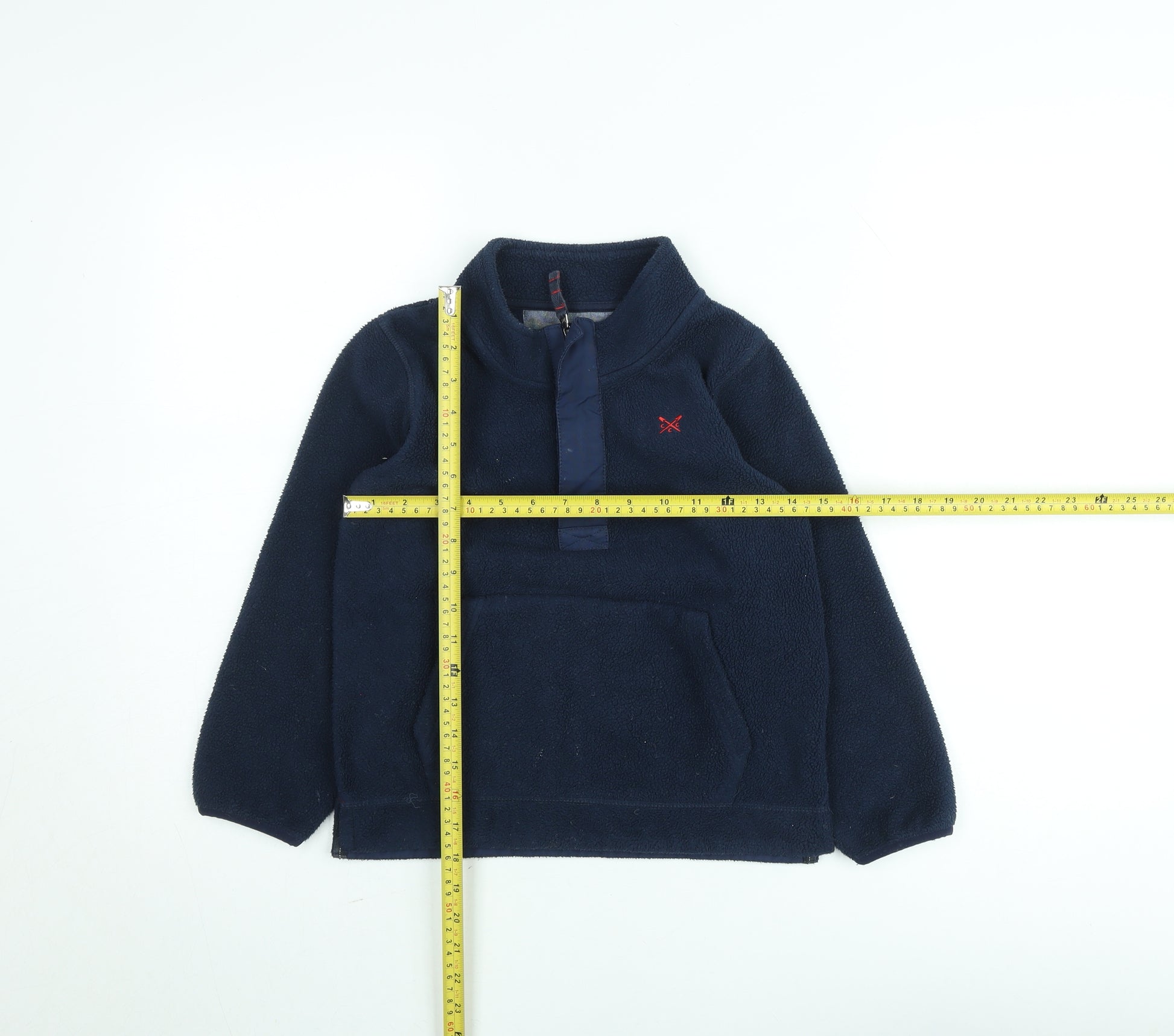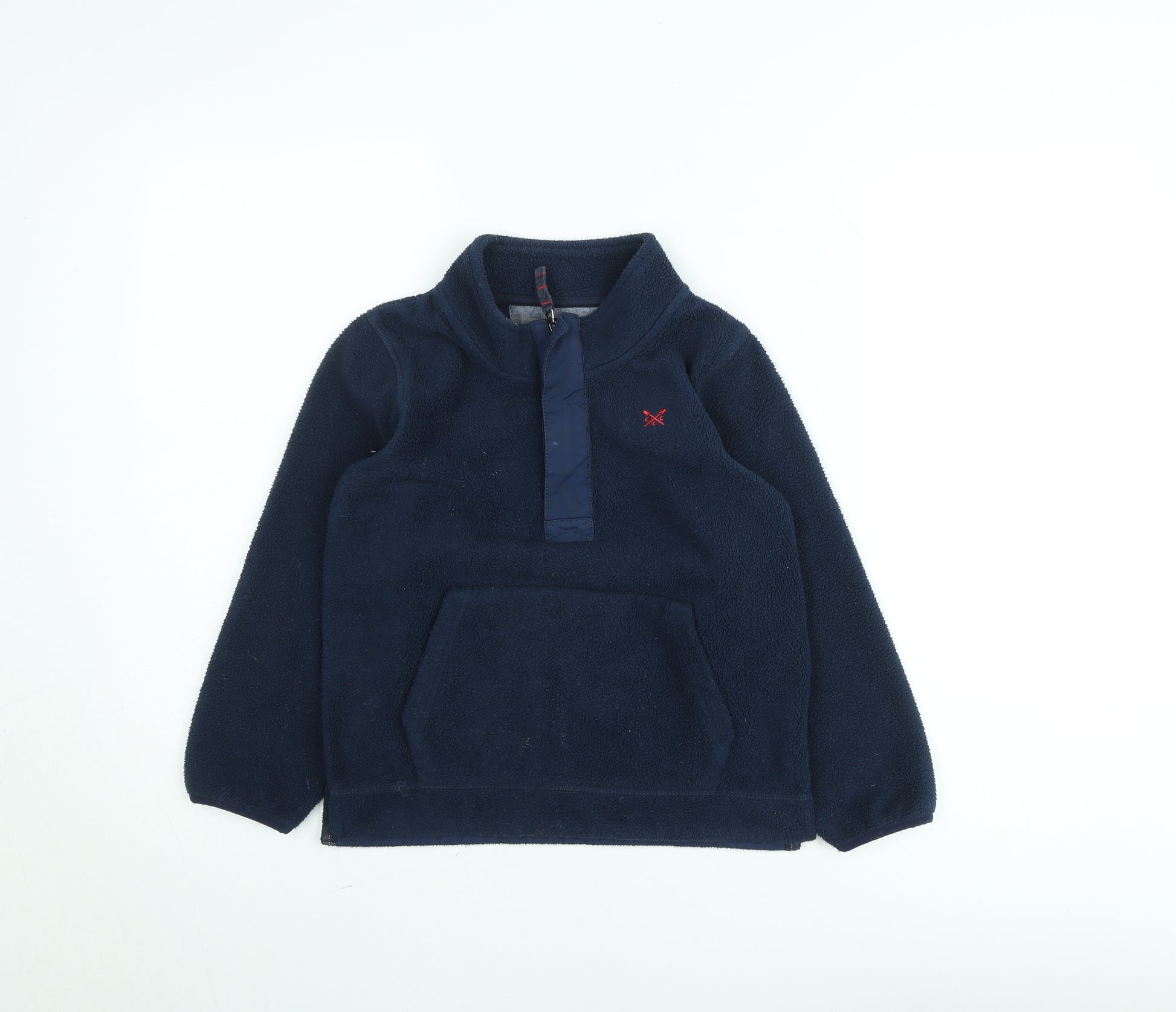 Keep your young one cosy and stylish with this Crew Clothing Kids navy fleece jumper, ideal for layering through the autumn and winter months. Crafted from 100% durable and soft polyester fleece, this pullover offers warmth without bulk, making it a comfortable option for everyday wear or school days. The classic navy blue design features a discreet red embroidered logo on the chest and a half zip front with a high neck to lock in warmth on cooler days. The practical front kangaroo pocket adds a casual sporty touch while offering room to keep hands warm or small essentials close by. Made to Crew Clothing’s quality standards, the fleece is lightweight yet insulating, ensuring reliable comfort whether worn outdoors or as a mid-layer during chilly weather. Designed in a regular fit and easy to pair with jeans or joggers, it is both practical and stylish, perfect for active kids who need durability and freedom of movement. Machine washable and quick drying, parents will appreciate its easy-care nature and long-lasting wear. In an excellent pre-owned condition, this jumper shows minimal signs of use and remains in fine shape with soft fleece texture intact. The Crew Clothing Kids 7–8 years fleece pullover is a dependable choice for casual, everyday outings, making it a wardrobe essential for the colder seasons. A perfect blend of comfort, warmth, and British casual charm.
