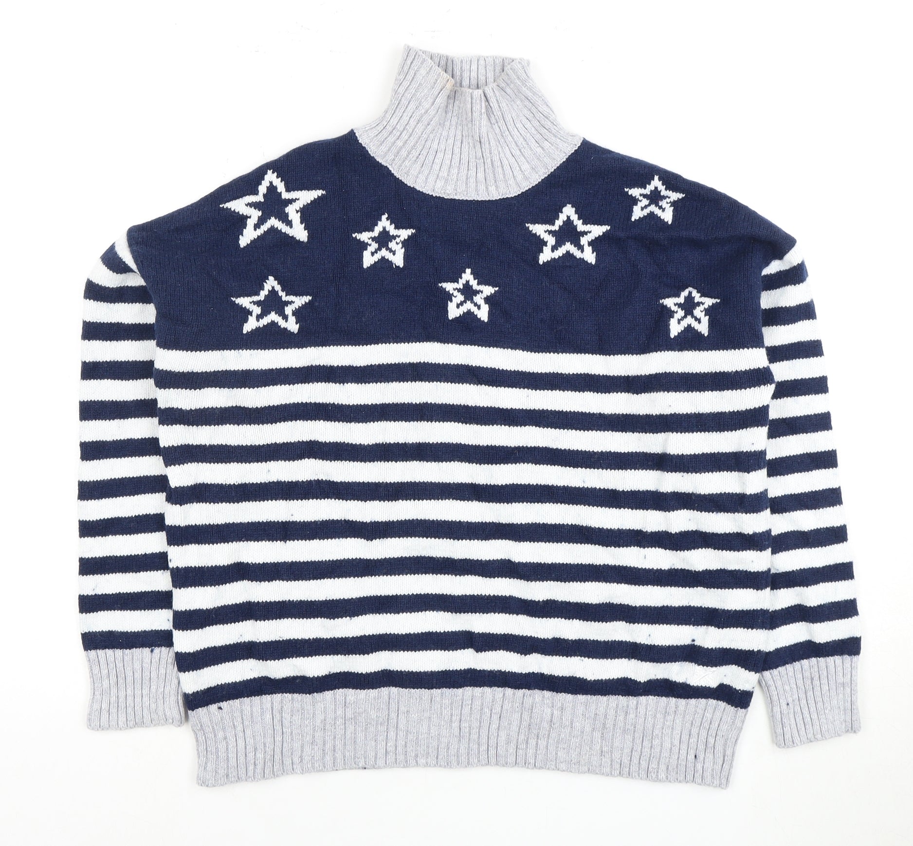 Step into the colder months in serious style with this beautiful multicoloured striped pullover jumper from Crew Clothing Company. Crafted for women who love classic elegance, this piece offers both style and comfort, making it a perfect addition to your winter wardrobe. Made from a luxurious blend of wool and cotton, it provides a cozy yet breathable fit, ideal for those crisp autumn and winter days. The high neckline adds an extra layer of warmth while its regular fit ensures it pairs effortlessly with jeans or a skirt for a casual, chic look. The eye-catching star pattern adds just the right amount of playfulness to your ensemble, ensuring you stand out in any crowd. Long sleeves complete its classic look, making it a versatile staple you'll love to wear time and time again. Whether you're enjoying a relaxed weekend outing or heading to a casual gathering, this jumper will have you covered in style. Gently used, this jumper retains its excellent quality, offering a fantastic purchase for those seeking a durable, stylish piece. Elevate your collection with this Crew Clothing jumper, blending timeless design with contemporary flair, making it an irresistible piece for women everywhere.