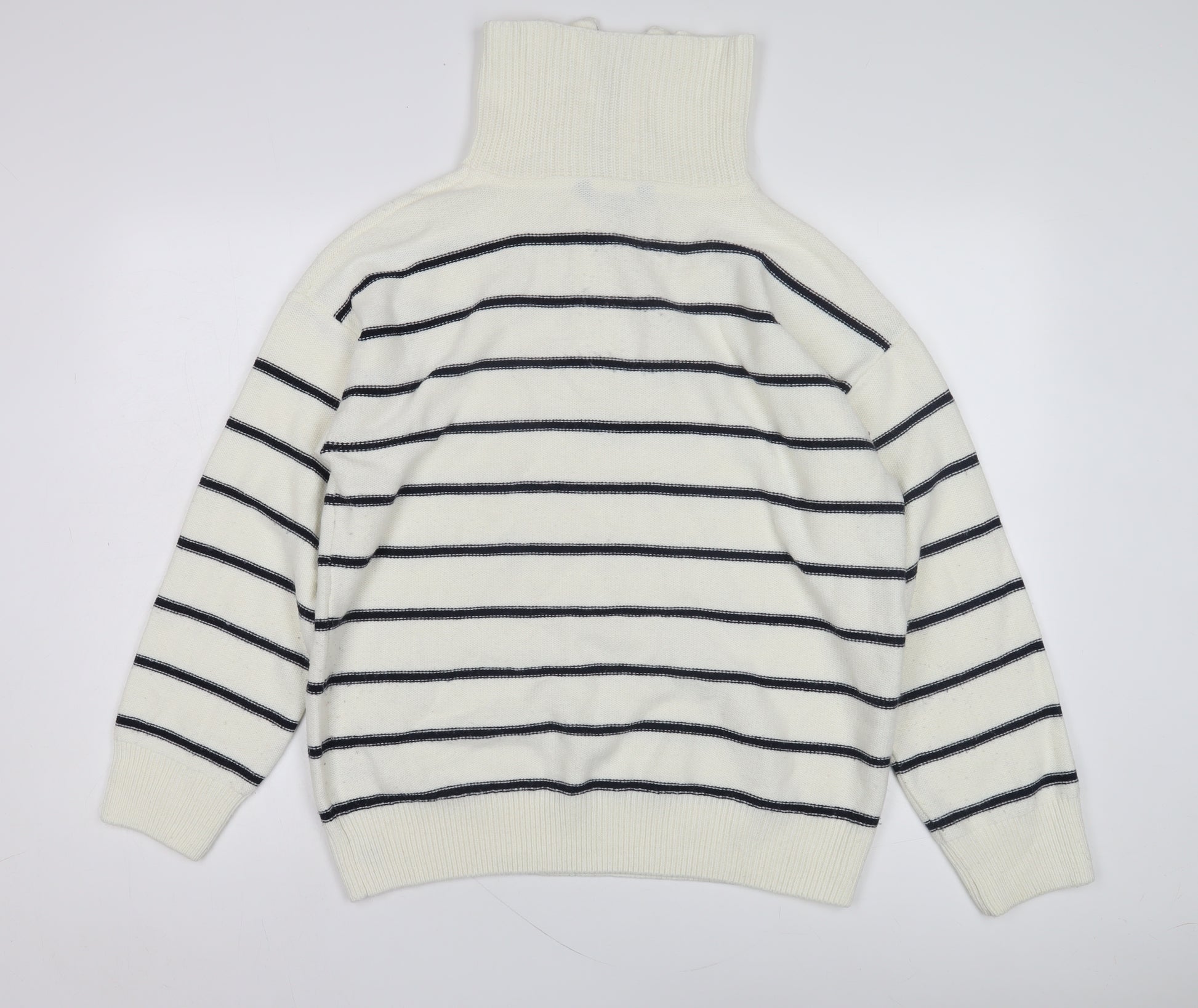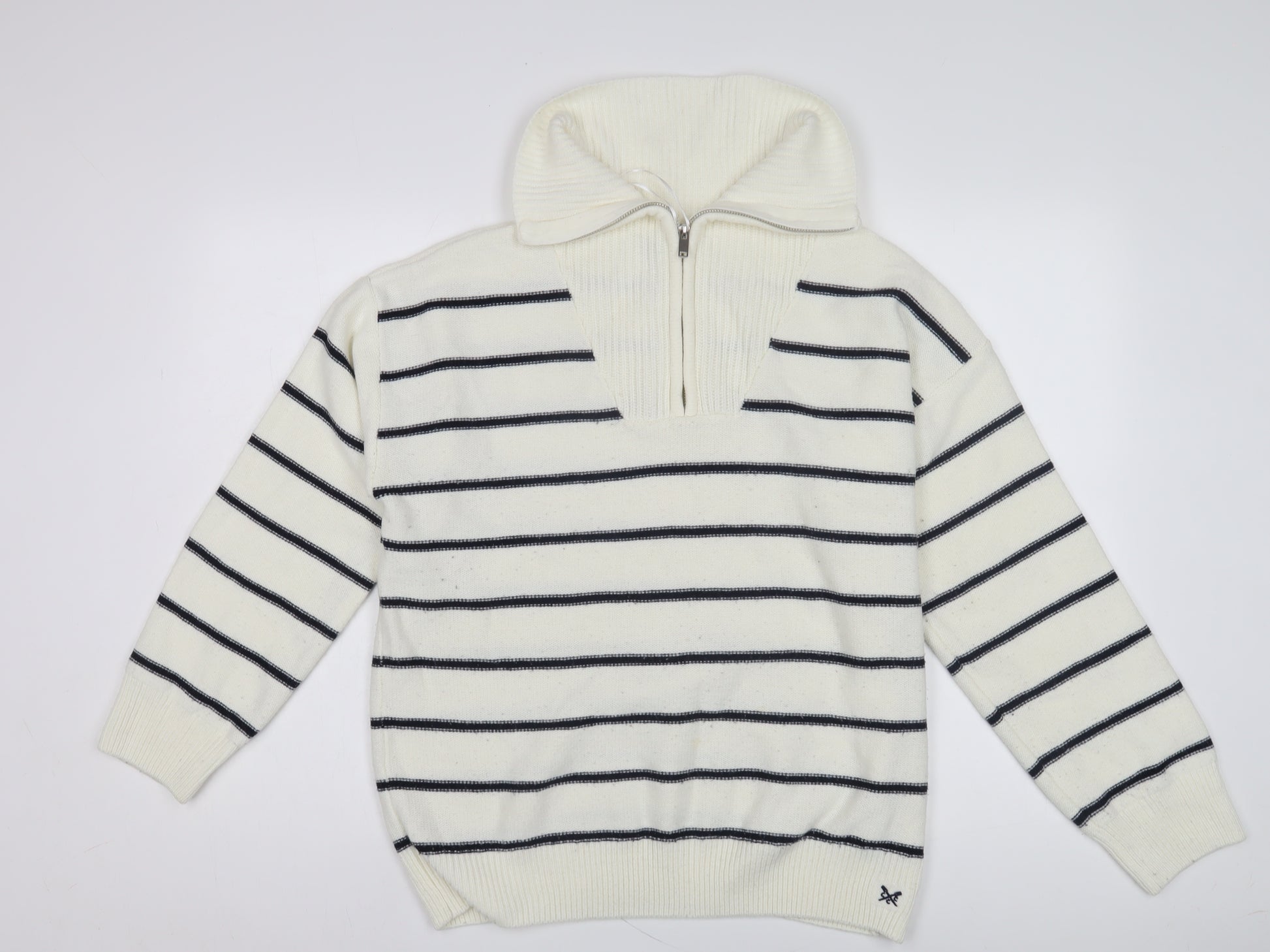 Embrace comfort and style with this Crew Clothing Company Women's Jumper, perfect for the cosy seasons of autumn and winter. Designed in a classic white with elegant stripes, this full zip jumper offers a chic and versatile addition to your casual wardrobe. Its roll neck provides extra warmth, while the long sleeves ensure you stay comfortable throughout the colder days. Crafted from high-quality acrylic and wool blend materials, this piece delivers both softness and durability. The cable-knit fabric adds a touch of texture, making it not just a practical choice, but a fashionable one too. With its regular fit, it's ideal for layering over your favourite tee or under a coat. Ideal for casual outings, this jumper allows for easy styling with jeans or skirts, making it a go-to piece for effortless style. Easy to care for, it's machine washable, ensuring your look stays fresh and clean no matter the occasion. Don't miss out on adding this must-have item to your collection.