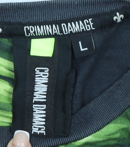 Add a bold and stylish edge to your summer wardrobe with this eye-catching men’s T-shirt from Criminal Damage. Designed in a relaxed and comfortable fit, this T-shirt showcases a vibrant tropical floral pattern in standout shades of red, green, and cream against a sleek black background. The large front print features the label’s signature branding, giving it an urban streetwear appeal that’s both contemporary and effortlessly cool. Crafted from a smooth jersey fabric blend of polyester and elastane, the shirt offers a breathable, lightweight feel with a slight stretch for comfort and mobility during everyday wear. The crew neckline and short sleeves make it an ideal warm-weather staple, perfect for festivals, holidays, or casual outings. Pair it with shorts, jeans, or joggers for an easy yet bold outfit that showcases personality and confidence. The T-shirt remains in excellent condition, showing no visible signs of wear or damage, maintaining its quality and vivid print. Ideal for the modern man who appreciates unique prints and well-crafted design, this Criminal Damage T-shirt brings a statement look to your casual collection. Suitable for spring and summer wear, it’s perfect for anyone who loves standout prints and vibrant designs with a premium streetwear edge. Whether you’re heading out with friends, relaxing at home, or updating your weekend attire, this tee delivers both comfort and impact.