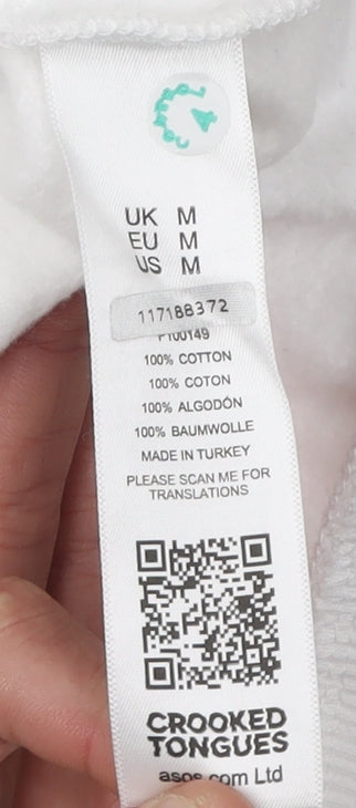 Embrace comfort and style with this Crooked Tongues men's hoodie, an ideal choice for those who enjoy a casual yet trendy look. Crafted from 100% cotton jersey fabric, this white pullover hoodie promises unrivaled comfort and a regular fit perfect for autumn and winter wear. Featuring a bold graphic print on the back and a contrasting logo at the front, it makes a stylish statement. This medium-sized hoodie provides the classic comfort of a drawstring closure and a snug hood, ensuring warmth and coziness. Whether you’re heading out for a casual outing or lounging at home, this hoodie offers versatile fashion. Despite a small mark on the front, this piece remains in very good condition and at a price point that reflects its slight imperfection. Machine washable for easy care, it’s a practical addition to any wardrobe. Don’t miss the opportunity to own this unique hoodie that combines a simple colour with eye-catching, fun graphics. Perfect for pairing with jeans or joggers for a well-rounded casual look.