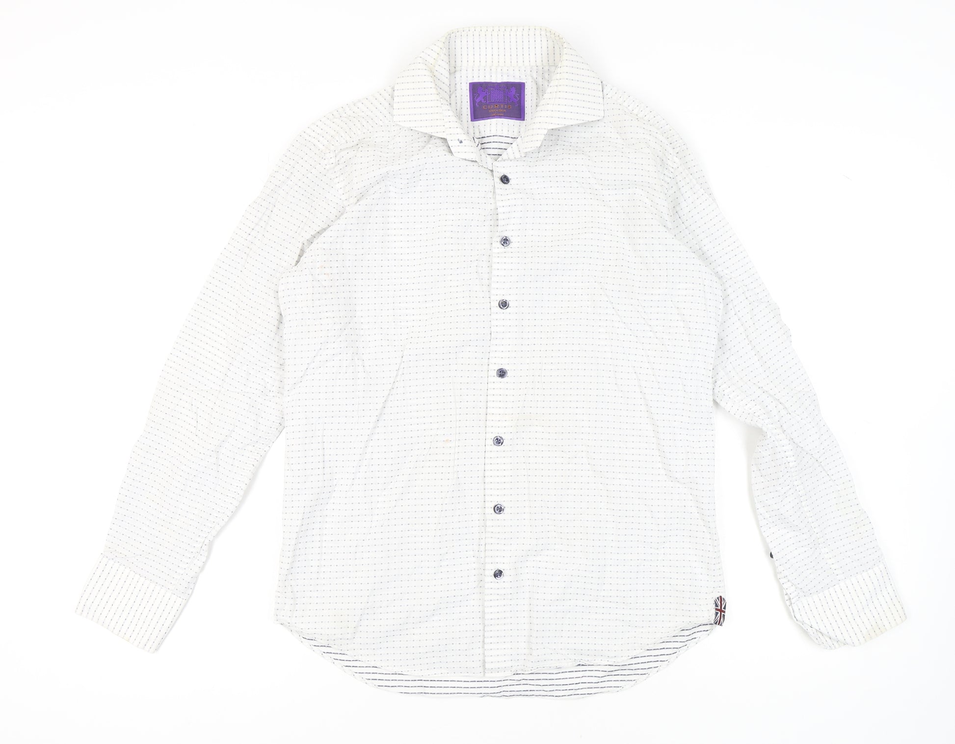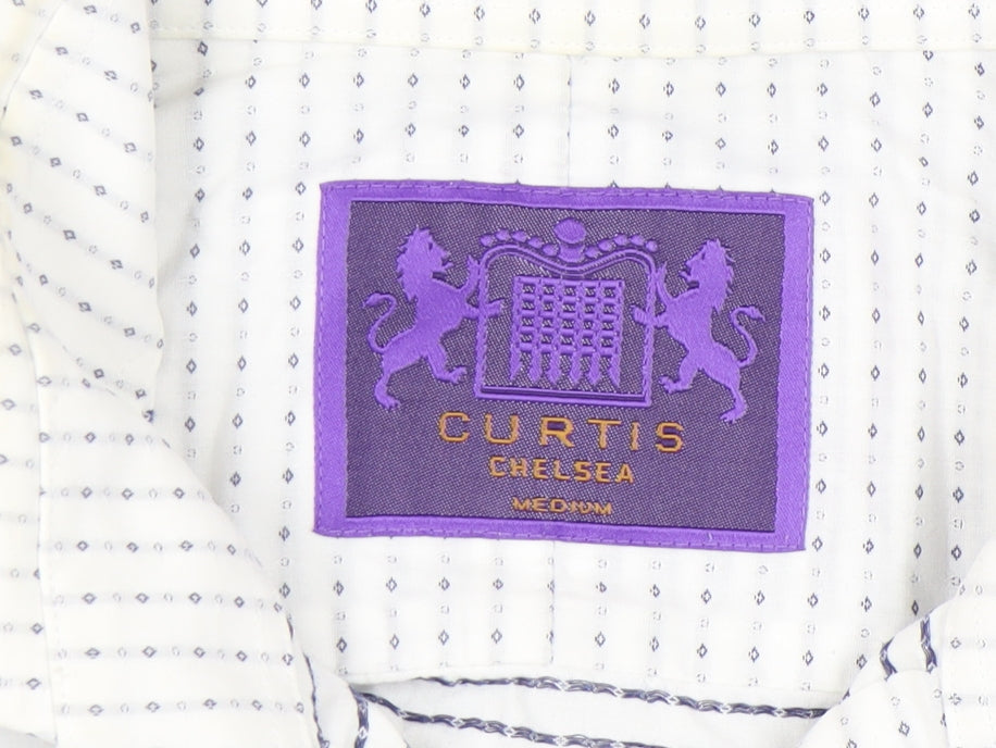 Discover the exquisite blend of style and comfort with this Curtis Chelsea men's casual shirt. Crafted from 100% pure cotton, the shirt ensures a breathable and gentle touch against your skin, perfect for daily wear. With a sophisticated geometric pattern in a pristine white hue, this button-up shirt exudes a modern aesthetic, making it an excellent choice for a variety of casual settings. The medium size aligns with the regular fit style, offering comfort without compromising on appearance. This long sleeve shirt features a classic pointed collared neckline and buttons seamlessly down the front, contributing to a clean and polished look that's ideal for effortless layering or standalone wear. The shirt's versatile design makes it suitable for casual occasions, whether you're enjoying a relaxed day out or meeting friends for brunch. While the accents are kept minimal with stylish buttons, the shirt showcases refined simplicity and timeless elegance. Despite being pre-owned, the shirt is in excellent condition, highlighted by only minor creasing, indicating light wear. Additionally, the garment is machine washable, promising hassle-free maintenance. Elevate your wardrobe essentials with this Curtis Chelsea shirt—a perfect blend of quality, comfort, and understated style.