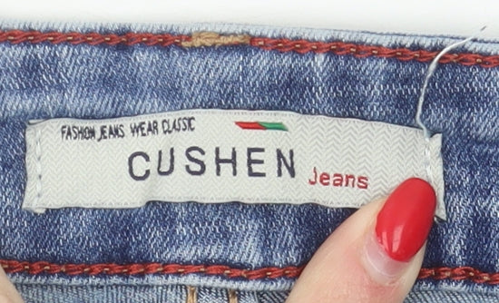 Discover comfort and style with these Cushen men's blue denim shorts. Crafted for a casual look, these regular-fit shorts are perfect for a relaxed summer day or a 90s-themed gathering. Featuring a distressed style with a 5-pocket design, they are both functional and trendy. These cargo shorts have a zip and button closure for a secure fit. Made from a comfortable cotton-elastane blend, they offer slight stretch for added comfort. Machine washable and easy to care for, these shorts will quickly become a staple in your wardrobe. With a light fabric wash and mid-rise design, these shorts provide both style and functionality for those seeking a blend of classic and contemporary design.
