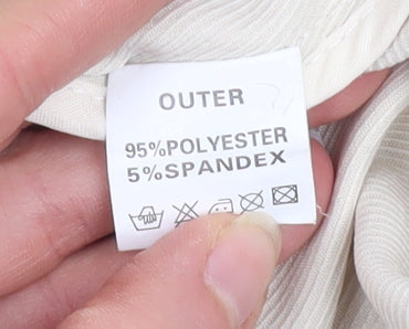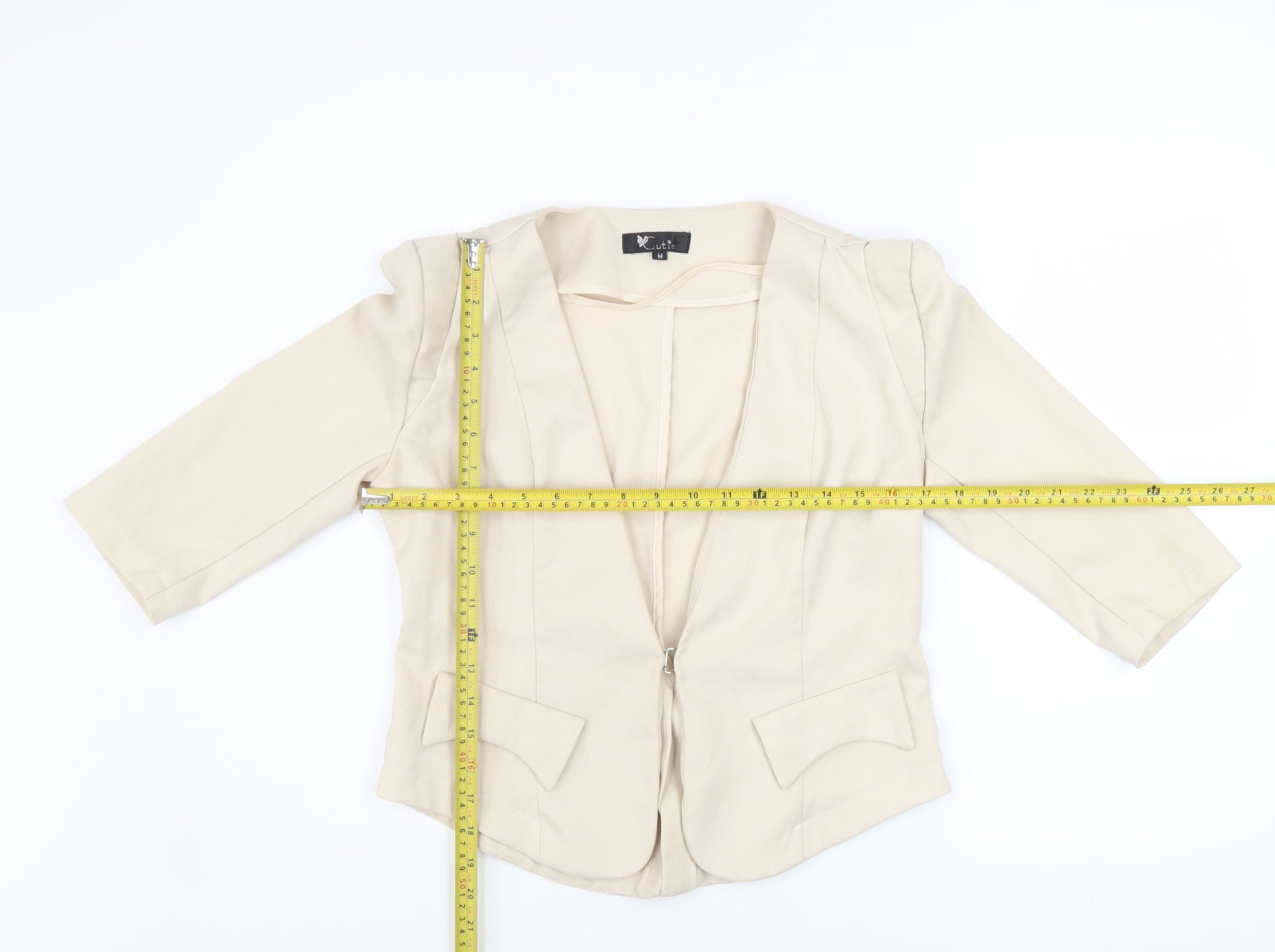 Elevate your wardrobe with this stylish beige women's blazer from Cutie, designed with a classic open front and flattering silhouette perfect for layering. Crafted from a soft twill fabric blend of polyester and elastane, this blazer provides both comfort and flexibility for all-day wear. The smooth texture and lightweight finish make it ideal for transitional seasons like spring and autumn. The structured cut and gentle shoulder detailing create a polished look suitable for business meetings, evenings out, or smart-casual occasions. Featuring 3/4 length sleeves and functional flap pockets, the design offers a perfect balance between chic sophistication and practicality. Its neutral beige colour ensures versatility—pair it effortlessly with tailored trousers, skirts, or jeans. The jacket is lined for comfort and maintains a soft drape, enhancing your figure while allowing movement. Subtle button-style accents add understated charm to the clean design. In very good pre-owned condition with minor signs of wear such as light marks near the cuff and back hem, this piece remains highly wearable and stylish. Ideal for women seeking a timeless blazer that transitions smoothly from office wear to an elegant evening ensemble. A wardrobe essential that embodies effortless sophistication, modern femininity, and all-season adaptability. The balanced fit and mid-weight texture make it a smart addition to any outfit where comfort meets refined tailoring. Refresh your outfit collection with this Cutie blazer—sophisticated, simple, and versatile for multiple occasions, offering lasting style and value in one easy-to-wear piece.