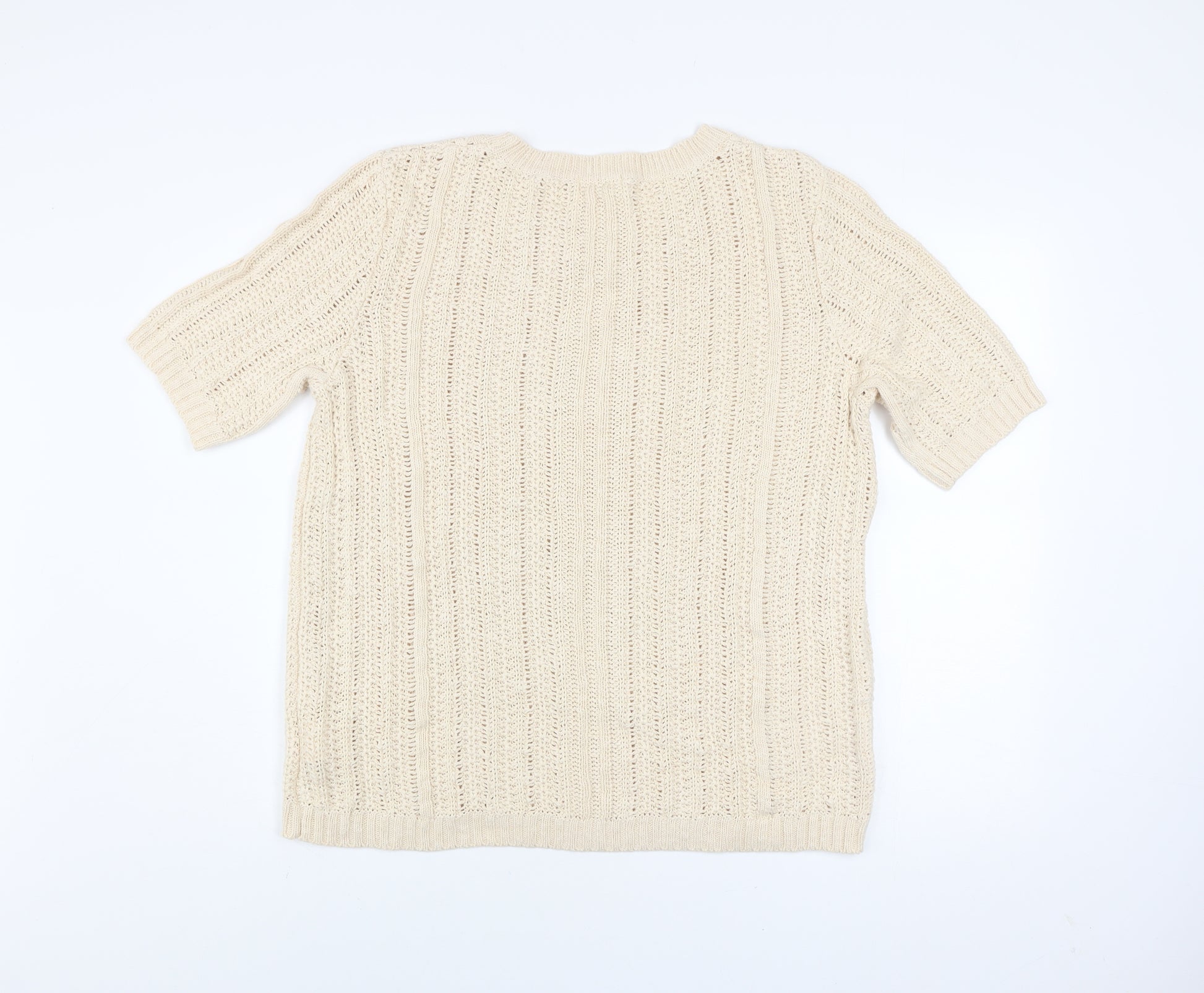 Women Beige Cotton Short Sleeve Open-Knit Pullover Jumper L
