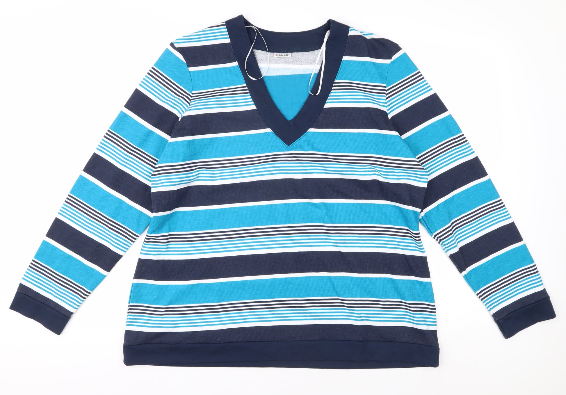 Discover comfort and style with this Damart Women's Blue Striped V-Neck Long Sleeve Tee. Perfect for casual outings, this t-shirt features a striking striped pattern that adds a touch of elegance to your everyday look. The vibrant shades of blue and navy create an eye-catching design, making this tee a standout piece in any wardrobe.Crafted for regular fit, this high-quality polyester and cotton blend ensures a soft texture and durability, promising long-lasting wear. The knit fabric offers flexibility and ease of movement, making it an ideal choice for all-day wear. The V-neck neckline adds a chic edge, providing a flattering silhouette that's perfect for styling with your favourite jeans or trousers.Designed for women, this t-shirt is especially suited for those looking for a versatile addition to their collection. Its machine washable feature ensures easy maintenance, keeping it fresh and ready for any occasion. With long sleeves and a classic cut, it's ideal for the autumn, winter, and spring seasons.Whether you're heading out for a casual lunch or just relaxing at home, this tee offers both comfort and style at an affordable price. Experience the effortless elegance of Damart and refresh your wardrobe today. With its excellent condition and affordable price, this is a must-have piece that you'll turn to time and again.