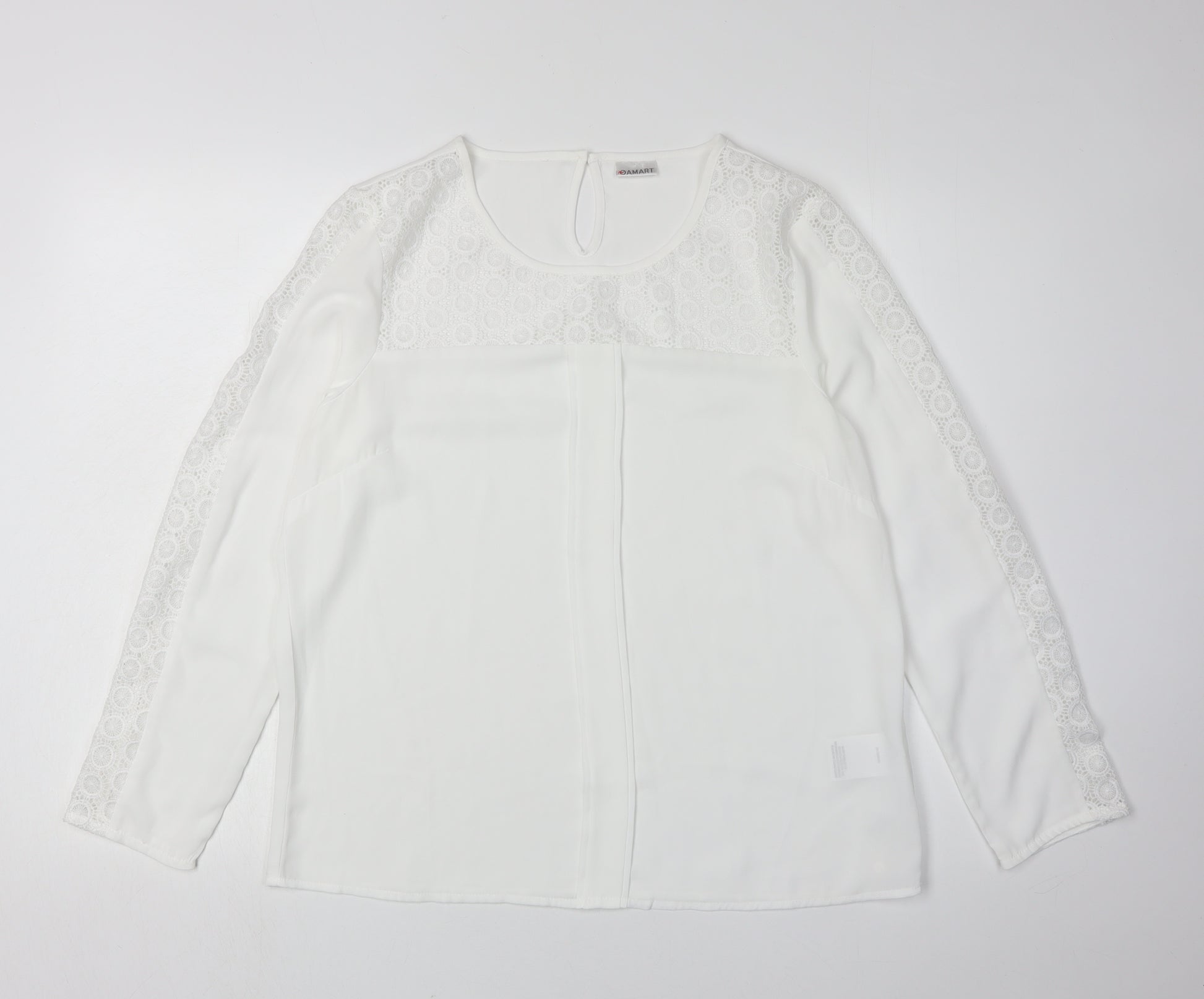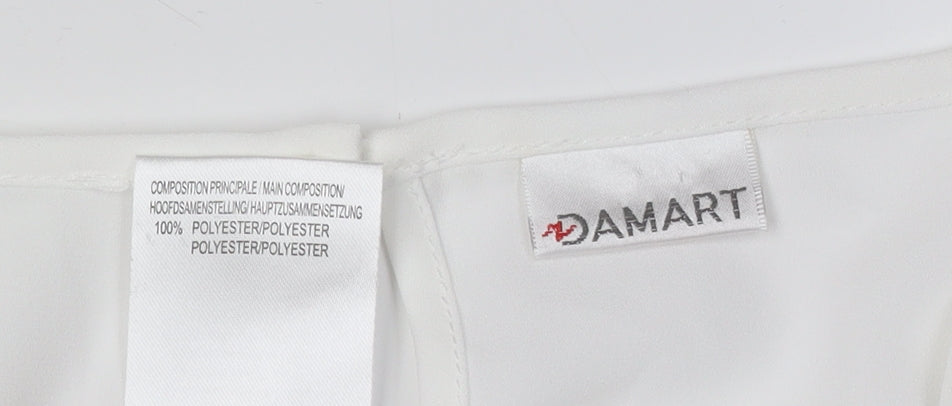 Enhance your wardrobe with this elegant Damart Women's Blouse, exquisitely crafted for both comfort and versatility. This blouse is designed in a classic white colour, easily pairing with any ensemble. The long sleeves and round neckline create a timeless silhouette, ideal for both casual and slightly formal occasions. Accentuated with delicate crochet detailing, this piece adds a touch of sophistication and femininity, making it perfect for those who love minimalist charm.Made from 100% polyester, this blouse ensures durability and comfort, while being machine washable for easy care. The solid white colour invites endless styling possibilities, whether you're heading to the office or out for a casual day. Designed in a regular fit, it facilitates easy movement and comfort throughout the day. Fastened with a subtle button closure at the back, it's quick to put on and take off.This blouse is in excellent condition, appearing as good as new with no visible defects, and is offered in a UK size 14, making it a fantastic addition to any wardrobe. The polyester fabric offers a lightweight feel, ideal for layering or wearing alone during different seasons. Elevate your style effortlessly with the Damart Women's Crochet Blouse, a staple piece that promises both style and practicality.