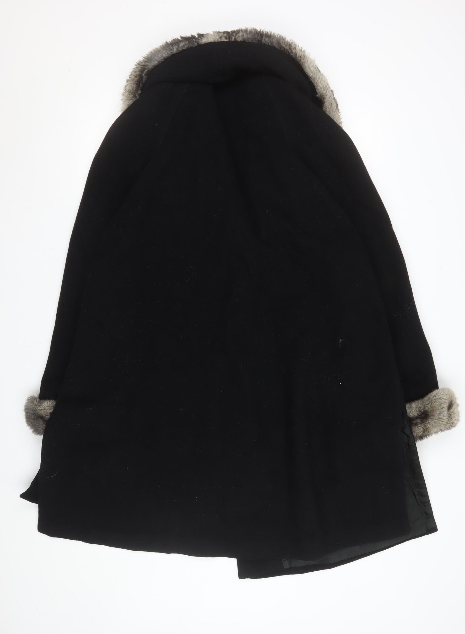 Women Black Wool Fur Trim Coat Size 14 Mid-Length Overcoat