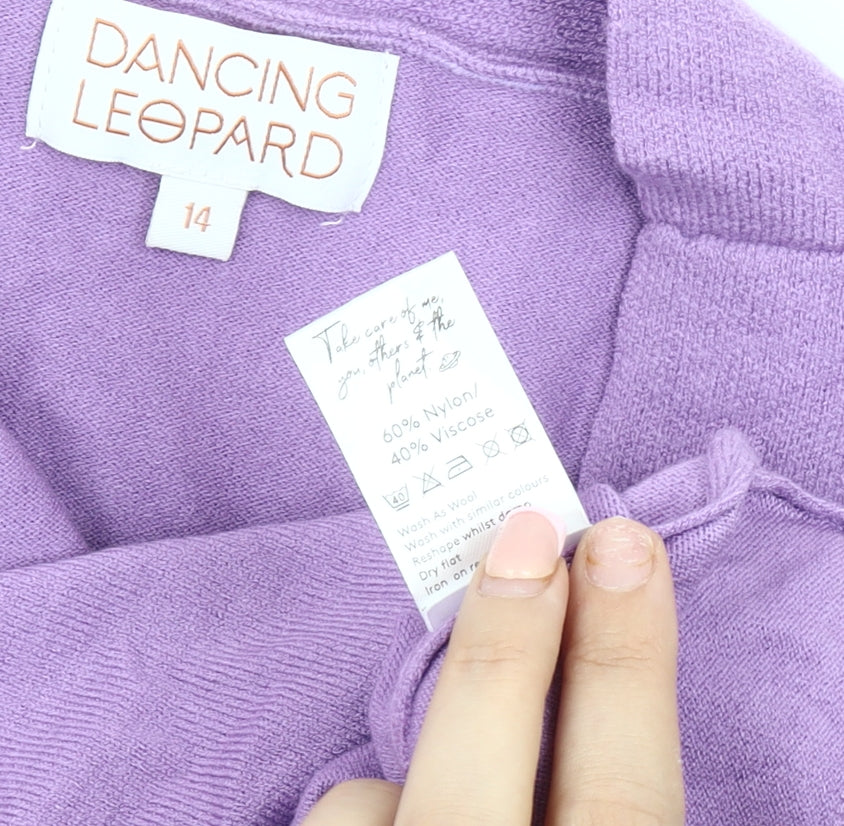 Freshen up your wardrobe with this charming purple cardigan from Dancing Leopard, designed for those casual days when elegance is still a must. Crafted with a thoughtful 60% Nylon and 40% Viscose blend, this cardigan offers a lightweight yet durable feel, perfect for aligning comfort with style. The cardigan, tailored to a regular size 14 fit, ensures comfort without compromising on a sleek silhouette. One of the standout features of this cardigan is its V-neckline, offering a classic touch while highlighting a flattering neckline. The garment maintains a tight-knit pattern, providing a structured feel that holds its shape wear after wear. The puff sleeves bring a hint of playful volume to the piece, adding an element of fun to the casual ensemble. Its versatile nature means it can be paired seamlessly with both denim for a laid-back look or a skirt for a touch of sophistication. While the cardigan is pre-loved, it's maintained in excellent condition, with only a slight wear visible, adding to its charm without detracting from its appearance. Finish your ensemble with a pair of casual flats or dress it up with heels for an easy transition from day to night. A quintessential piece for all seasons, embrace the blend of classic design and modern trends with this purple Dancing Leopard cardigan. Whether you're stepping out for brunch or heading to an early dinner, this cardigan complements your style effortlessly. A simple yet chic choice for the woman who celebrates style in all forms.