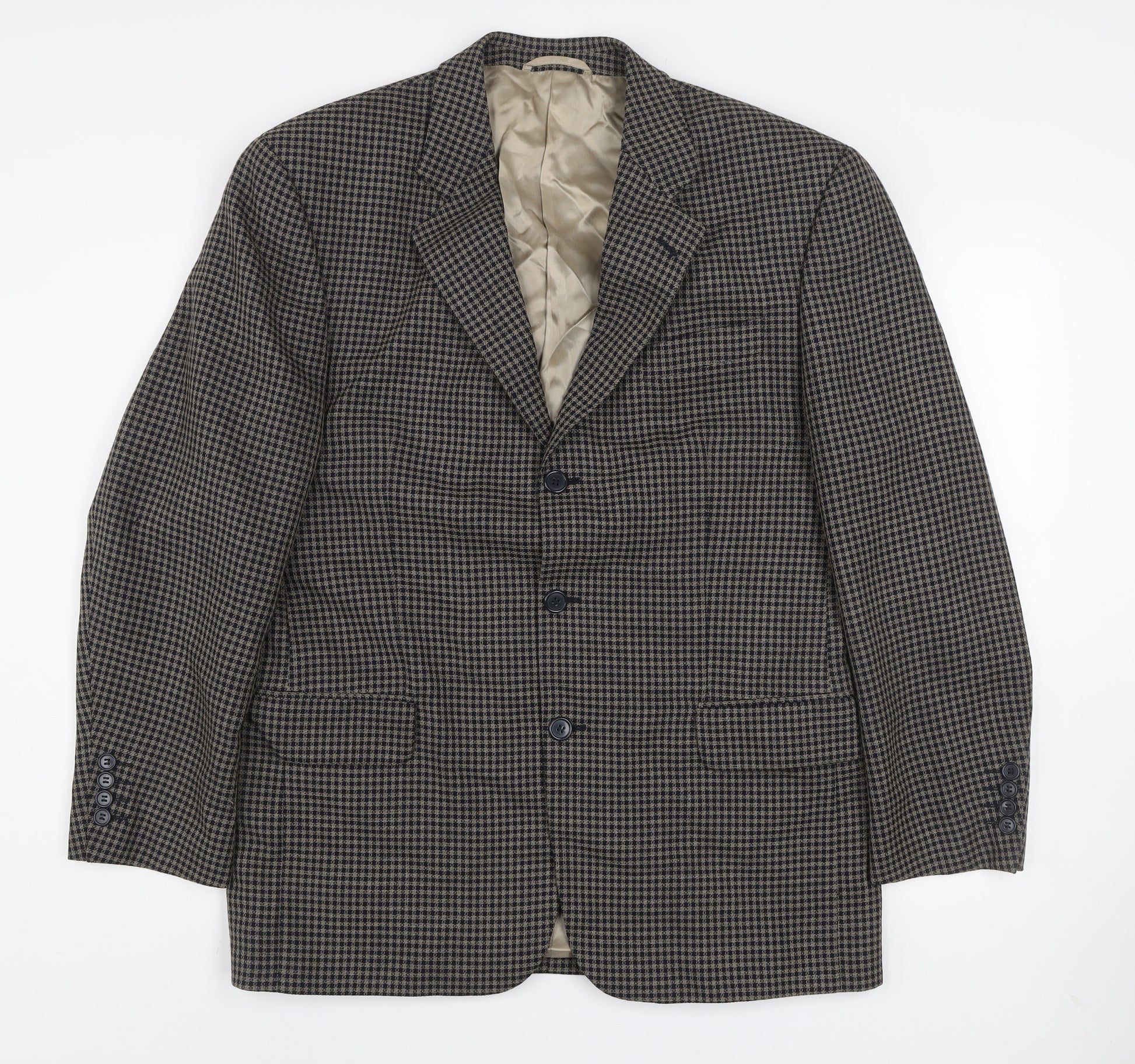This Daniel Grahame men's check blazer is an excellent addition to any classic wardrobe. Crafted in a soft wool blend of 45% wool and 55% polyester, it offers both timeless style and reliable comfort. The warm brown check pattern with subtle tones gives the jacket a versatile appearance, perfect for pairing with tailored trousers or dark denim. Designed in a regular fit with a single-breasted, two-button front, it provides a sharp yet relaxed silhouette ideal for business, formal, or special occasions such as weddings. The jacket features a standard notch lapel for a traditional finish, complemented by three-button cuffs and practical inside pockets that add a touch of sophistication. The full lining is made from smooth 100% viscose for an added layer of luxury and comfort. This mid-weight fabric is well-suited to autumn and winter wear, offering a superb balance of warmth and breathability. The classic tailoring and expert construction of this Daniel Grahame blazer ensure durability and enduring style. Its versatile brown colour pairs easily with a range of shirts and accessories, making it an excellent choice for professional and semi-formal settings alike. In excellent condition with minimal signs of wear, this jacket retains its shape, texture, and colour beautifully. Perfect for the modern man who values traditional craftsmanship and comfort. Own a timeless piece of menswear elegance ideal for daily smart dressing or standout occasion wear with this finely made tweed-like check blazer.