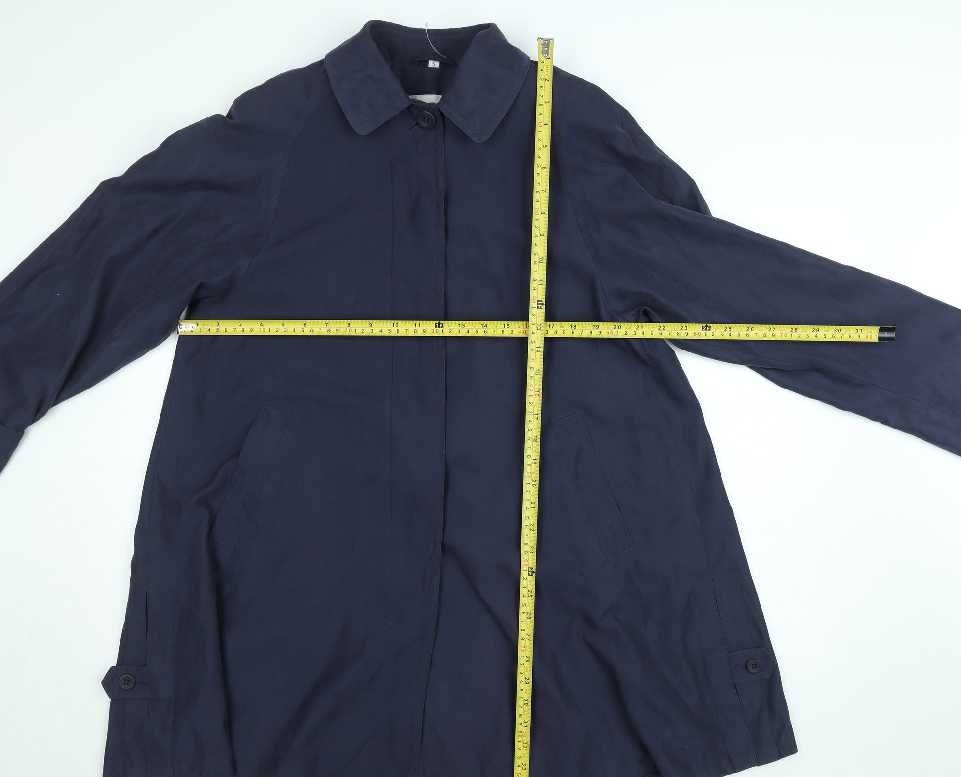 Stay stylish and comfortable whatever the weather with this elegant Dannimac women's mid-length rain coat in an attractive deep blue hue. Designed for both function and sophistication, this coat is crafted from a quality blend of nylon and polyester, finished with a Teflon coating to help resist water and light showers, making it an ideal outerwear choice for autumn and spring. The lightweight yet durable fabric ensures comfort and mobility, perfect for everyday use, commuting, or travel. The coat features a classic collared neckline and a clean, streamlined silhouette with button fastening that adds a timeless appeal to any outfit. Fully lined with soft polyester, it offers a smooth internal finish and long-lasting comfort. Practical side pockets and adjustable button tabs at the cuffs give the coat a versatile and secure fit. This Dannimac coat pairs seamlessly with both casual and smart looks, offering enduring elegance that transitions from workwear to weekend wear with ease. Its mid-length cut provides ample coverage, striking a balance between protection and style, while the durable outer shell maintains a neat structure even after frequent wear. With its understated classic appeal, this coat delivers the dependable quality Dannimac is known for. In excellent pre-loved condition with minimal signs of wear, it remains a smart choice for a buyer seeking an affordable, durable, and fashionable raincoat. Machine washable for easy care. Add this refined, water-resistant blue rain coat to your wardrobe and embrace chic protection for all seasons with a touch of timeless British outerwear craftsmanship.