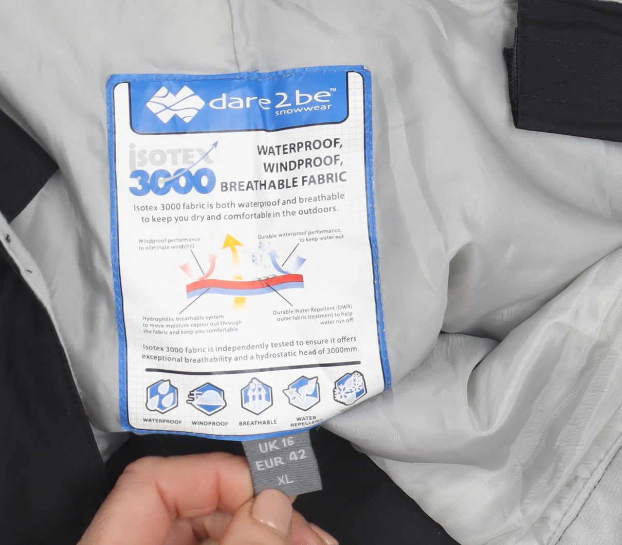 Stay warm, dry and comfortable on the slopes or during outdoor winter adventures with these Dare 2 Be men’s black snow pants. Crafted using durable Isotex 3000 fabric, they offer reliable waterproof, windproof and breathable protection, making them the perfect choice for skiing, snowboarding or hiking in cold, wet conditions. The outer fabric is treated with a water-repellent finish to allow rain and snow to run off easily, ensuring comfort throughout the day. Designed in size XL for a comfortable regular fit, they feature an adjustable waistband with secure hook and loop tabs for a flexible fit and zip fastening for convenience. The trousers have a simple straight leg design that layers easily over ski or hiking boots. They are insulated for effective warmth retention without added bulk, keeping you protected from low temperatures while maintaining freedom of movement. The lightweight softshell construction enhances comfort and weather resistance at the same time. Ideal for winter sports enthusiasts, hikers, or anyone looking for superior outdoor protection, these trousers are also machine washable for easy care. In excellent pre-owned condition with light general wear, they still deliver the performance expected from a leading activewear brand. With multiple features including waterproof, windproof, breathable and thermal properties, this item offers fantastic value for quality and durability. Perfect for your next ski trip or cold-weather outing, these Dare 2 Be black snow pants combine practicality and style in a reliable, technical design that’s built for the British winter and beyond.