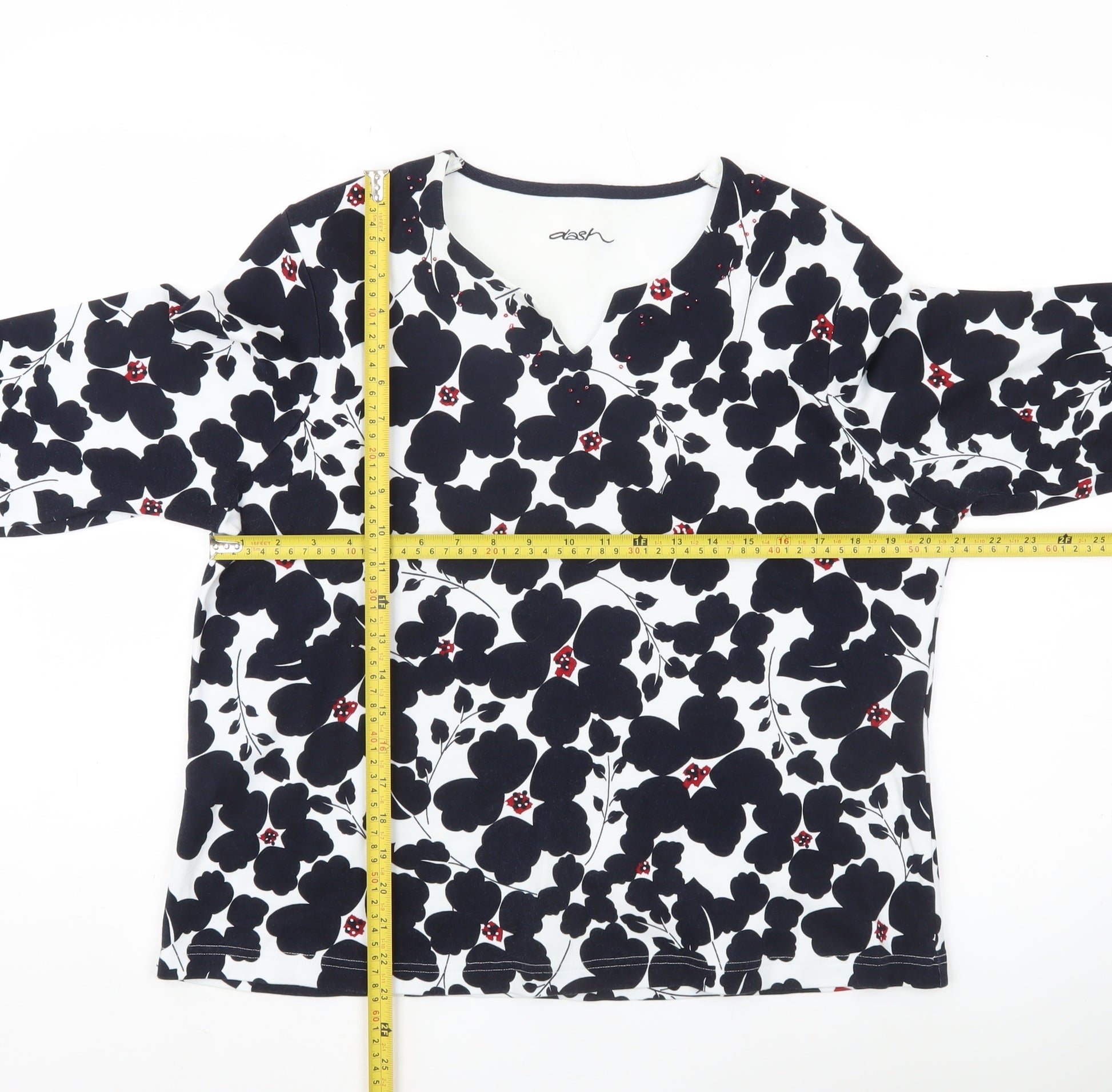 Add a touch of bold style to your everyday wardrobe with this beautiful Dash women’s tunic blouse, designed in a flattering size 20. Crafted from a soft and breathable jersey fabric blend of 97% cotton and 3% elastane, this top provides both comfort and just the right amount of stretch for ease of movement. The lightweight fabric makes it an ideal piece for spring, summer and autumn wear, while the clean pullover style ensures effortless dressing.The blouse features a stylish black floral pattern with subtle touches of red printed across a crisp white background, giving it an eye-catching yet refined appearance. The classic V-neckline adds a flattering touch to the silhouette, while the 3/4 length sleeves and relaxed tunic styling make it suitable for day-to-day casual use, travelling, or even more relaxed social gatherings. Designed with a regular fit, it offers comfort without compromising on a polished look.This Dash blouse is perfect for pairing with jeans, tailored trousers, or skirts, depending on the occasion, making it a versatile addition to any wardrobe. Its carefully chosen blend of cotton and elastane provides durability and easy care, with the added bonus of machine washability ensuring it remains a practical favourite for frequent wear. The stretch element ensures fit flexibility, while still maintaining shape and comfort throughout the day.In excellent condition, this pre-loved piece shows very light wear, with no visible marks or flaws, making it an attractive choice for those seeking great quality at a fraction of the original retail price. Its multicoloured floral theme allows for a fresh seasonal look that’s perfect for brightening your outfit whatever the occasion.This blouse’s timeless pattern and versatile fit allow it to seamlessly blend with both casual and travel wardrobes, offering a piece that is chic yet practical. A stylish staple, this Dash floral V-neck blouse will soon become a go-to favourite for modern women looking for comfort with elegance.