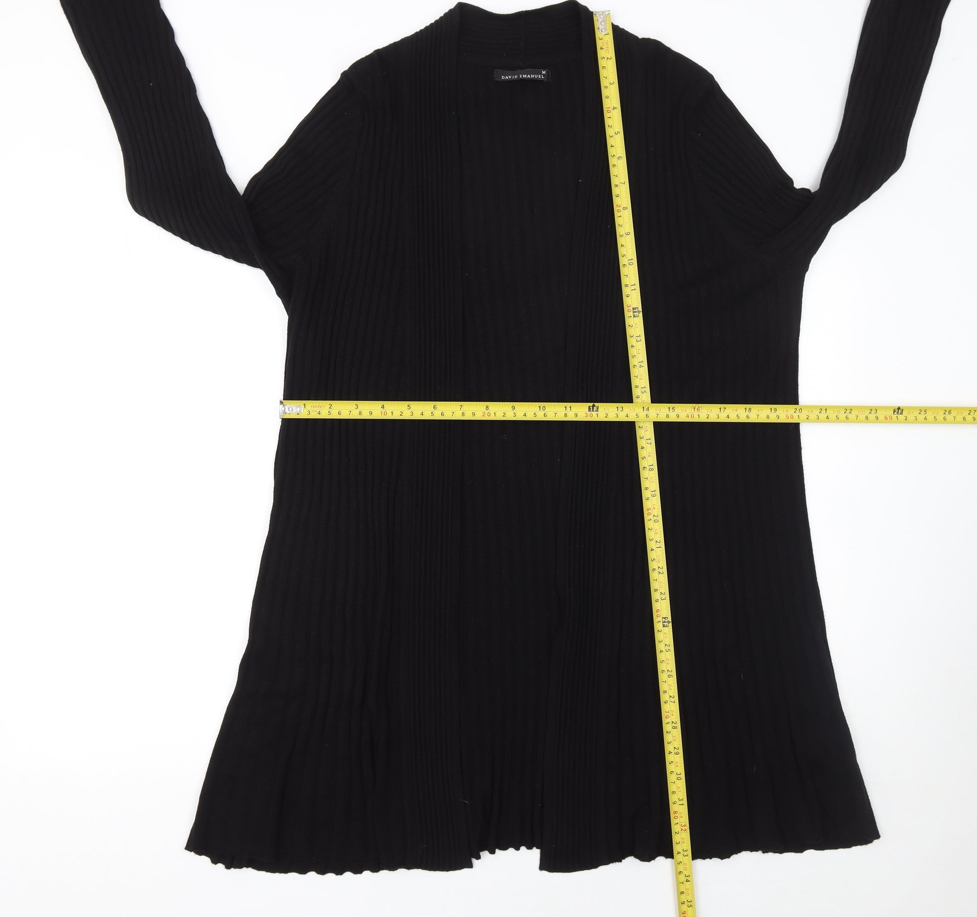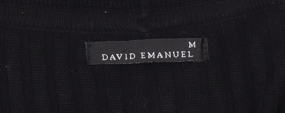 This elegant women’s black cardigan by David Emanuel is a timeless piece that complements a wide range of outfits. Crafted from a soft and comfortable blend of 50% Acrylic and 50% Viscose, it offers a lightweight yet cosy feel that makes it ideal for layering during the cooler Autumn, Winter, and early Spring months. Designed in a flattering open front style with a ribbed knit texture, it effortlessly combines comfort with sophistication. The open neckline and long sleeves make it a versatile garment to wear over blouses, tops, or t-shirts for a polished look suitable for both casual and workwear settings. The ribbed knit design provides gentle stretch and a slender silhouette, making it easy to pair with trousers, jeans, or skirts. Its soft fabric ensures comfort throughout the day, while the black colour enhances its adaptability, seamlessly matching both bold prints and neutral tones. This cardigan’s lightweight and breathable knit make it a wardrobe essential that can be worn across multiple seasons. Whether you’re dressing up for the office, running errands, or heading out for an evening meal, this versatile cardigan offers effortless style and practicality. In excellent pre-owned condition with no visible damage or marks, it maintains its quality and structure. A classic choice for those who appreciate understated elegance and versatile layering options, this David Emanuel cardigan makes an ideal addition to any modern wardrobe. Easy to care for and machine washable, it’s a smart blend of functionality and timeless fashion that will serve you well for years to come.