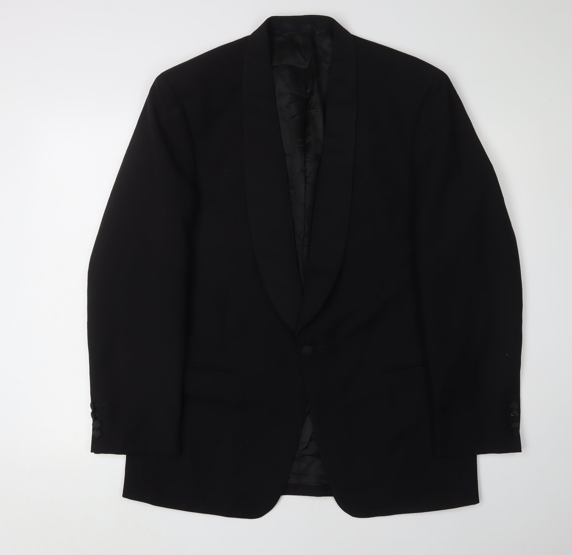 Elevate your formal wardrobe with this exquisite David Moss black tuxedo jacket. Crafted from 100% pure new wool, this blazer promises unmatched comfort and style, ideal for any sophisticated occasion. Whether you're attending a wedding, a formal party, or a business event, the shawl lapel and single-button closure add a touch of classic elegance that never goes out of fashion. The regular fit and single-vented style ensure you look sharp, while the viscose lining offers a comfortable fit throughout the day. Made in the UK, this blazer reflects premium craftsmanship and quality. Ensure your formal attire is complete with this versatile and timeless piece.