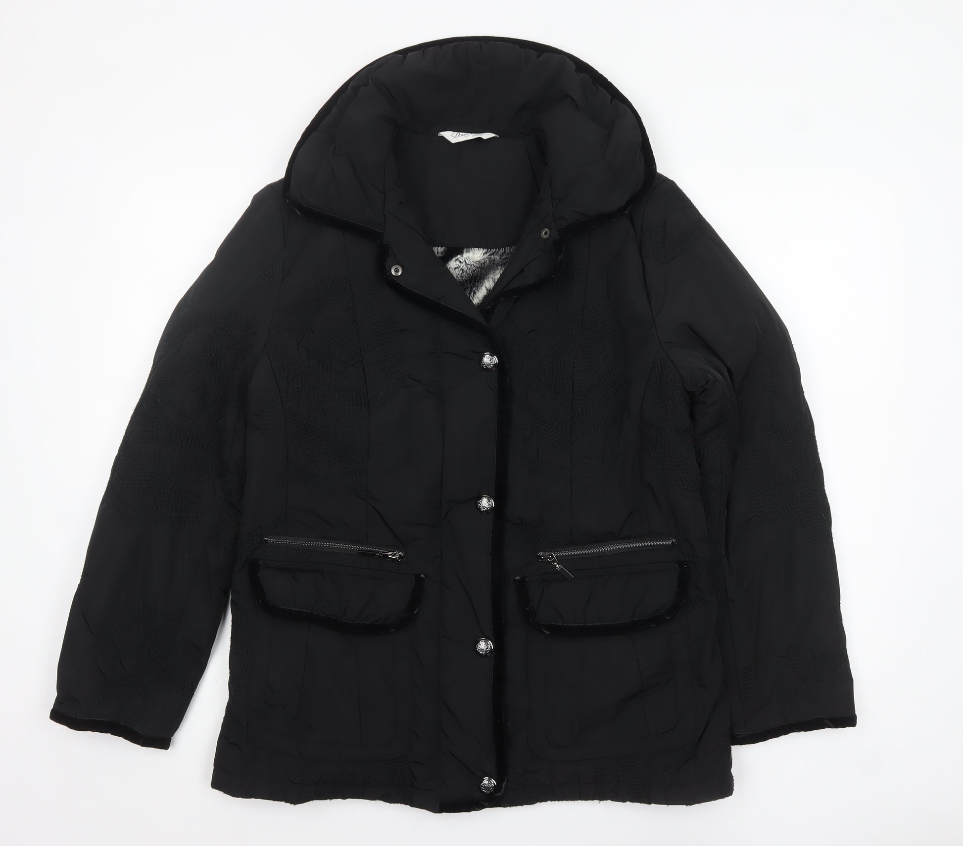 Step out in warmth and timeless sophistication with this David Nieper women's black mid-length coat, designed for practical comfort and classic style. Crafted from a durable yet soft polyester outer shell, this fully lined coat offers reliable protection from cold weather while maintaining a sleek and flattering silhouette. The coat’s insulating polyester interior keeps you comfortably warm during winter months without adding unnecessary bulk. Featuring both a secure zip fastening and elegant button closure, it provides flexibility and a polished finish perfect for everyday wear. Two front pockets lend convenient storage and style, enhanced by subtle zip and button accents that add a touch of modern design detail. The luxurious black shade pairs effortlessly with any outfit, making this an ideal outerwear choice for layering over work, casual, or travel ensembles. Its mid-length cut provides balanced coverage, complementing both tailored trousers and casual jeans alike. Designed for regular fit, it ensures comfort and freedom of movement throughout the day. Ideal for cold autumn and winter days, the coat’s smooth polyester microfibre fabric makes it easy to maintain and machine washable, combining fashion with practicality. Suitable for various occasions including daily errands, casual outings, or light business wear, this David Nieper coat is an elegant staple that never goes out of style. In excellent pre-owned condition with light signs of wear and no visible flaws, it exemplifies the fine quality associated with the brand. Perfect for anyone seeking a versatile, cozy, and stylish outerwear piece ready to endure many seasons ahead.