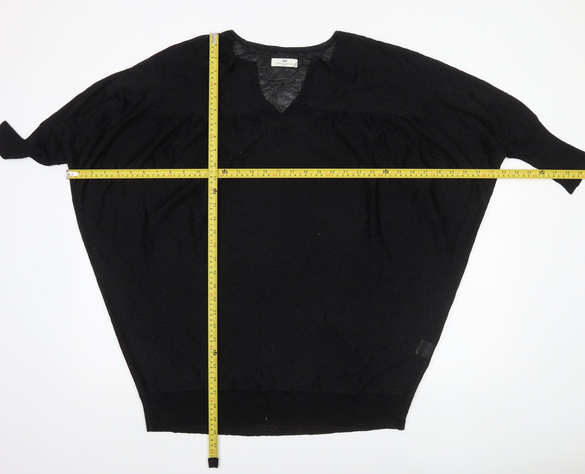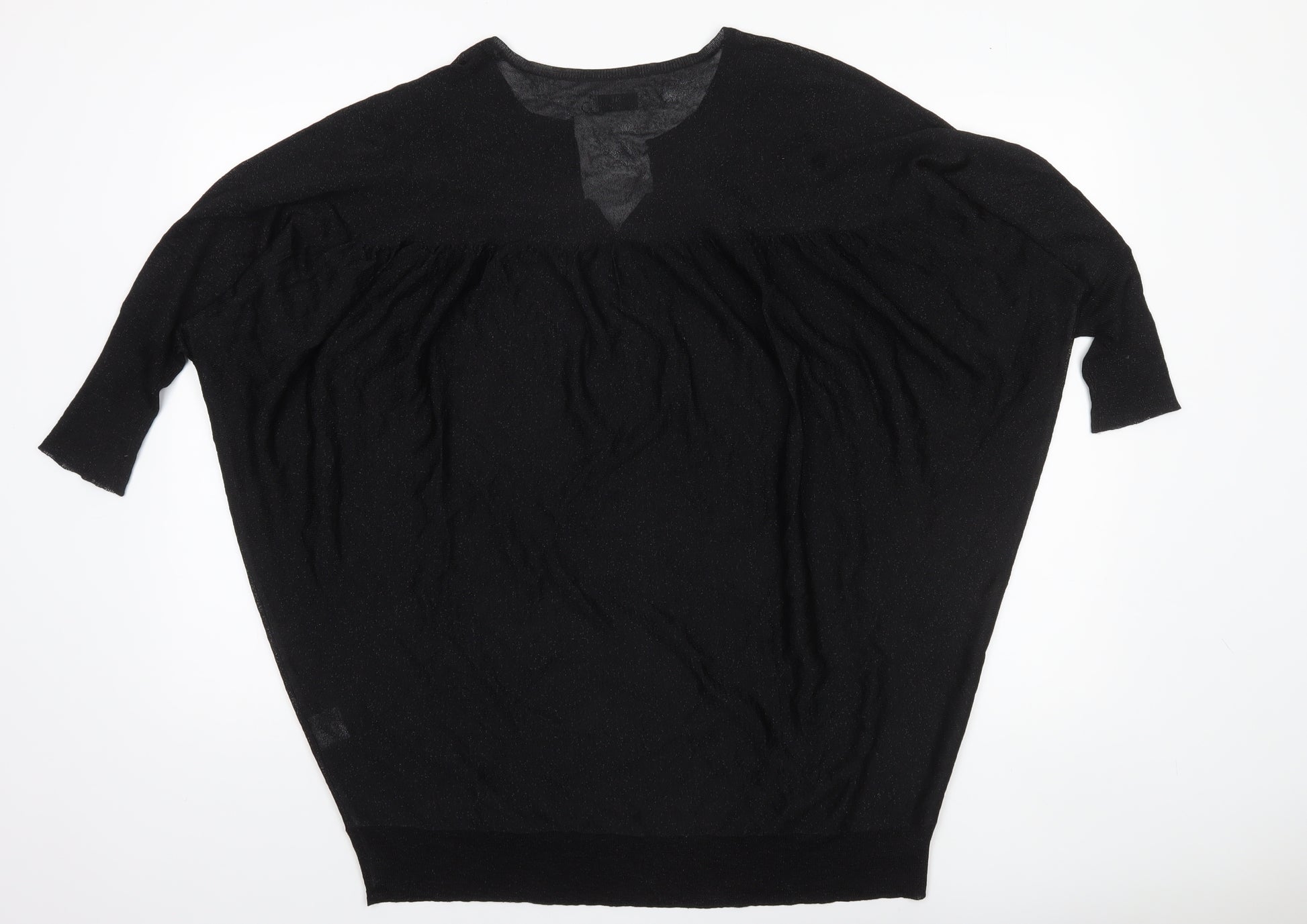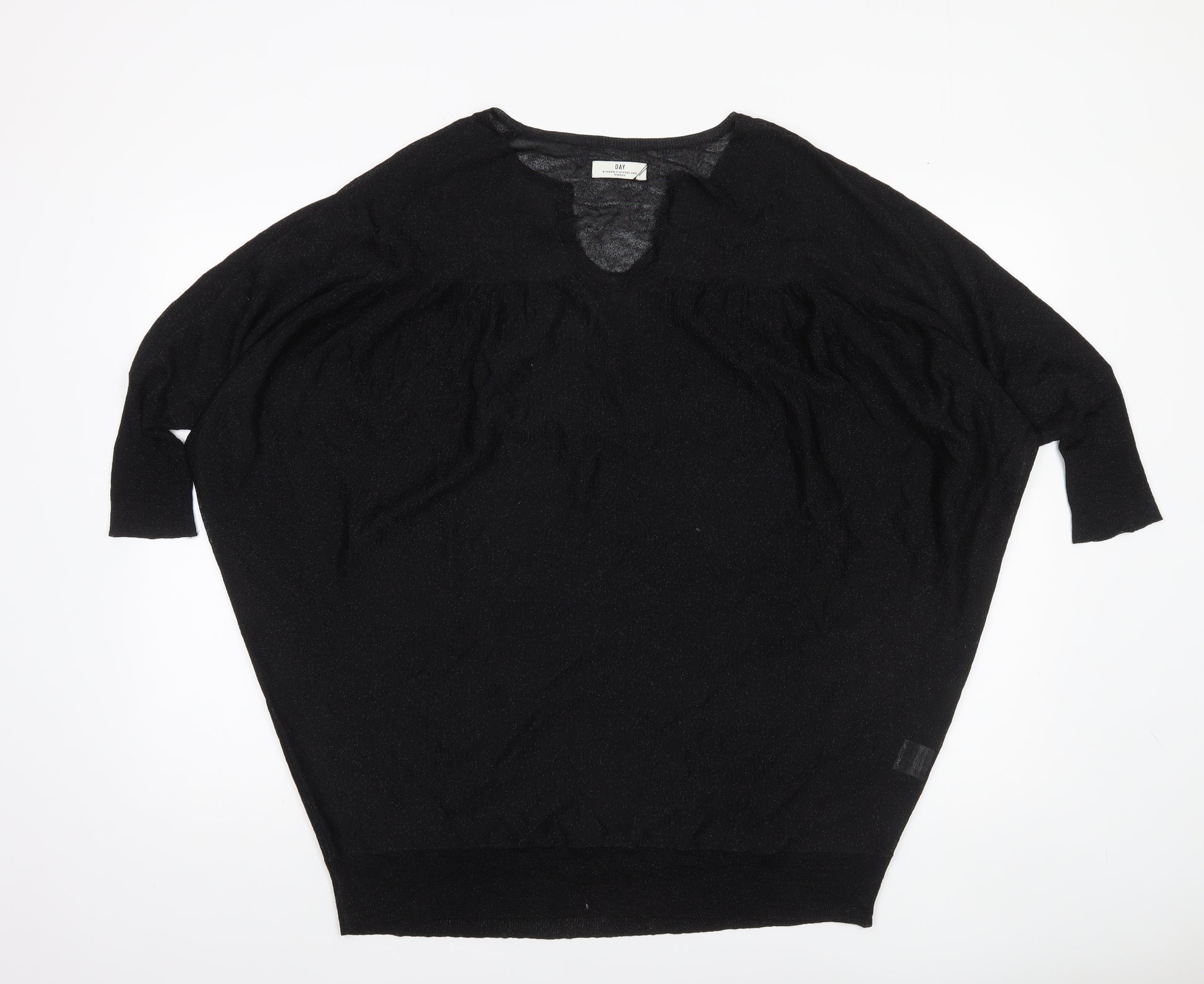 Refresh your wardrobe with this elegant and effortlessly chic women's jumper from Day Birger et Mikkelsen. Crafted in a fine lightweight knit, this black V-neck pullover combines Scandinavian minimalism with a relaxed, flattering silhouette. Cut in a batwing sleeve design with a comfortable 3/4 sleeve length, the knit falls naturally for a draped, easy wear shape that enhances both casual and smarter ensembles. The soft viscose fabric blended with metallic yarn gives it a subtle shimmer, adding a touch of refinement to any outfit without compromising comfort. Perfect for transitional weather, it serves wonderfully layered over camisoles in cooler months or worn solo in milder seasons. The relaxed fit ensures effortless movement, while the neat neckline and ribbed hem add understated definition. A versatile black shade makes this jumper highly pairable — style it with jeans for everyday style, or with tailored trousers and heels for an elevated yet comfortable look. Designed to fit true to size in a regular medium, it flatters a variety of body shapes. In excellent pre-loved condition, showing only minimal signs of gentle wear and no visible flaws or damage. Easy to care for with hand wash only instructions, this jumper embodies quality and understated luxury that Day Birger et Mikkelsen is known for. An ideal choice for women who love modern simplicity, timeless elegance, and high-quality wardrobe staples. Upgrade your knitwear collection with this relaxed yet sophisticated piece that effortlessly transitions from day to evening wear while ensuring comfort and style.