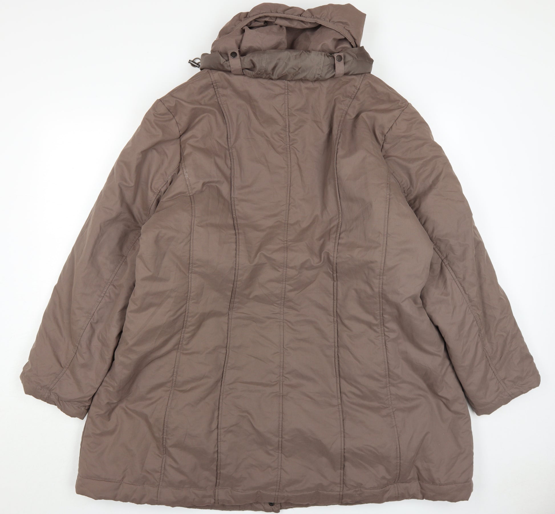 Discover ultimate comfort and timeless style with this Debenhams Classics Women's Puffer Coat in a lovely brown hue. Specifically designed for plus-size women, this coat offers a relaxed regular fit ensuring both style and comfort. Crafted from a durable fabric blend of 70% polyester and 30% nylon, the coat guarantees warmth and protection against the chilly winter breeze. The soft, polyester lining enhances the coat’s thermal efficiency, making it ideal for colder months. The coat features a comfortable hood to shield you from unexpected weather changes, while button and zip closures ensure a secure fit. With its mid-length cut, it gracefully complements any outfit, adding a classic touch. Practicality meets style with functional pockets, perfect for keeping your hands warm or storing essentials. This classic puffer style caters to casual occasions while providing warmth and comfort. Accented with button and zip details, it's perfect for layering over your favourite winter outfits. Though in excellent condition with only slight fabric wrinkles, this machine-washable coat is easy to maintain, ensuring you look effortlessly stylish all season long. Don't miss the opportunity to own this versatile wardrobe staple, perfectly blending fashion and function to elevate any cold-weather ensemble.