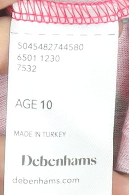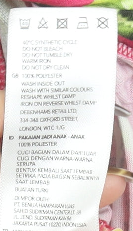 Brighten up her wardrobe with this vibrant pink floral crop blouse from Debenhams. Designed for girls aged 10, this cheerful top combines playful style with everyday comfort. The blouse features a bold tropical floral pattern in lively shades of green, orange, yellow, and white, set against a fuchsia pink background. The short sleeves and round neckline offer a classic silhouette, while the cropped length adds a modern twist perfect for summer outfits. Crafted from 100% polyester, the lightweight crepe fabric provides a soft, breathable feel with subtle pleating for added texture and movement.A discreet back zip closure ensures a secure and easy fit, while the ruched knot detail at the front adds a touch of sophistication to this charming casual piece. Ideal for holidays, family outings, or sunny weekend wear, this blouse pairs beautifully with skirts, shorts, or jeans for an effortlessly stylish look.The top is machine washable for convenience and retains its bright pattern wash after wash. The item is in excellent pre-loved condition, showing minimal signs of wear and no visible marks or damage. Perfect for parents seeking quality and durability from a trusted high-street brand, this Debenhams girls’ blouse brings colour and joy to any seasonal wardrobe.Offering affordability and practicality, this piece is a great choice for daily wear or casual gatherings. With its eye-catching floral print and comfortable fit, it’s a must-have statement piece she’ll love to wear all summer long.