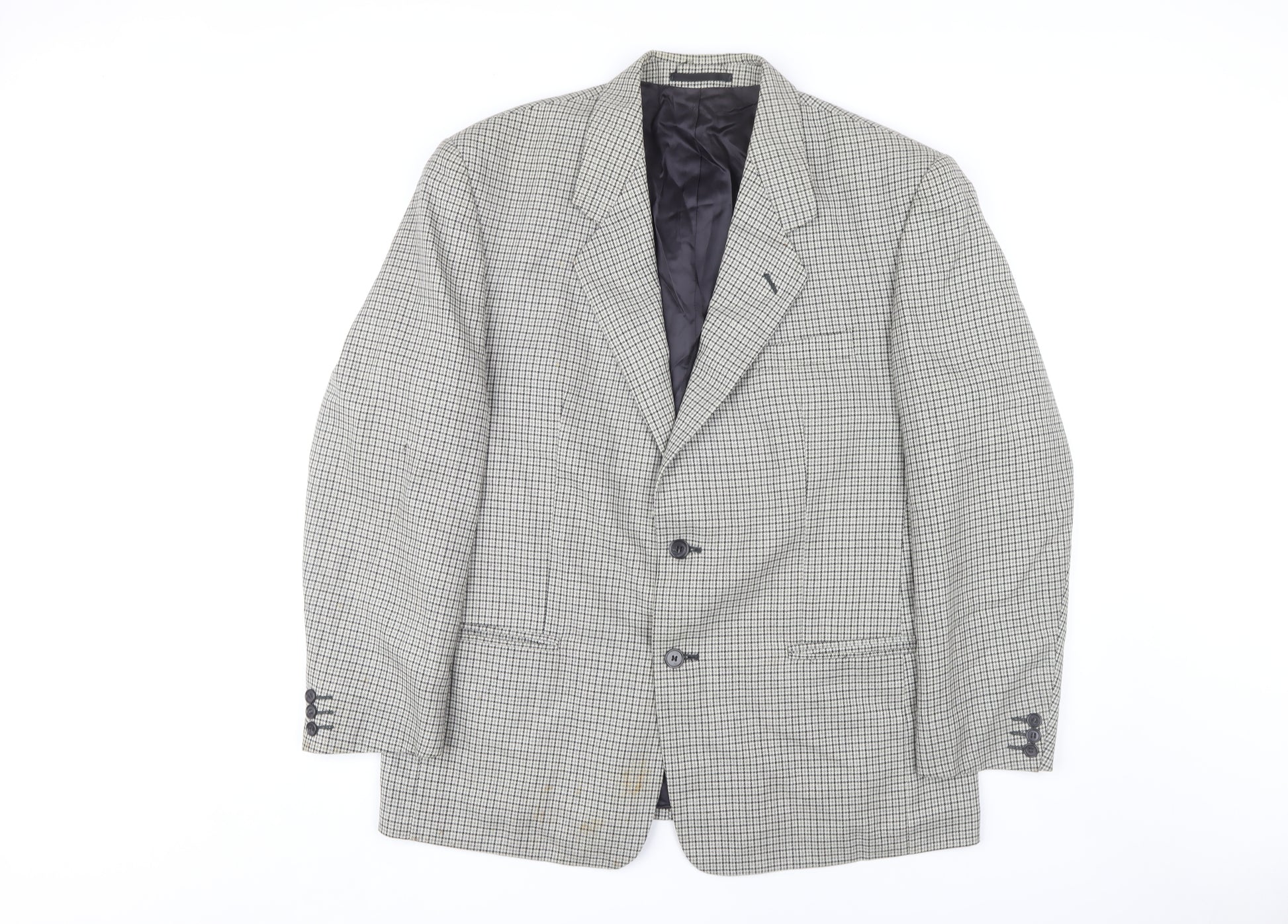 Elevate your wardrobe with this timeless grey check blazer from Debenhams. Perfect for business, casual, or formal occasions, this single-breasted blazer offers a classic look with its stylish notch lapel and two-button front. Crafted from high-quality pure new wool, it ensures comfort and durability, while the polyester lining provides a smooth feel. Designed for a regular fit, this jacket is perfect for the autumn and winter seasons. The three-button sleeves add a touch of sophistication and elegance, while the inner pockets offer practical storage solutions. The single-vented back ensures ease of movement, making it ideal for both office wear and social gatherings. Despite being in excellent condition, this blazer has faint marks on the fabric, adding a touch of character to its classic appeal. Suitable for those who appreciate a vintage vibe without the age. Whether you're dressing up for the office or heading out for an evening event, this Debenhams blazer is the perfect addition to any gentleman's collection. Invest in a versatile piece that blends style and utility seamlessly, offering you multiple wear options. Add a touch of elegance and sophistication to your outfit with this must-have blazer.