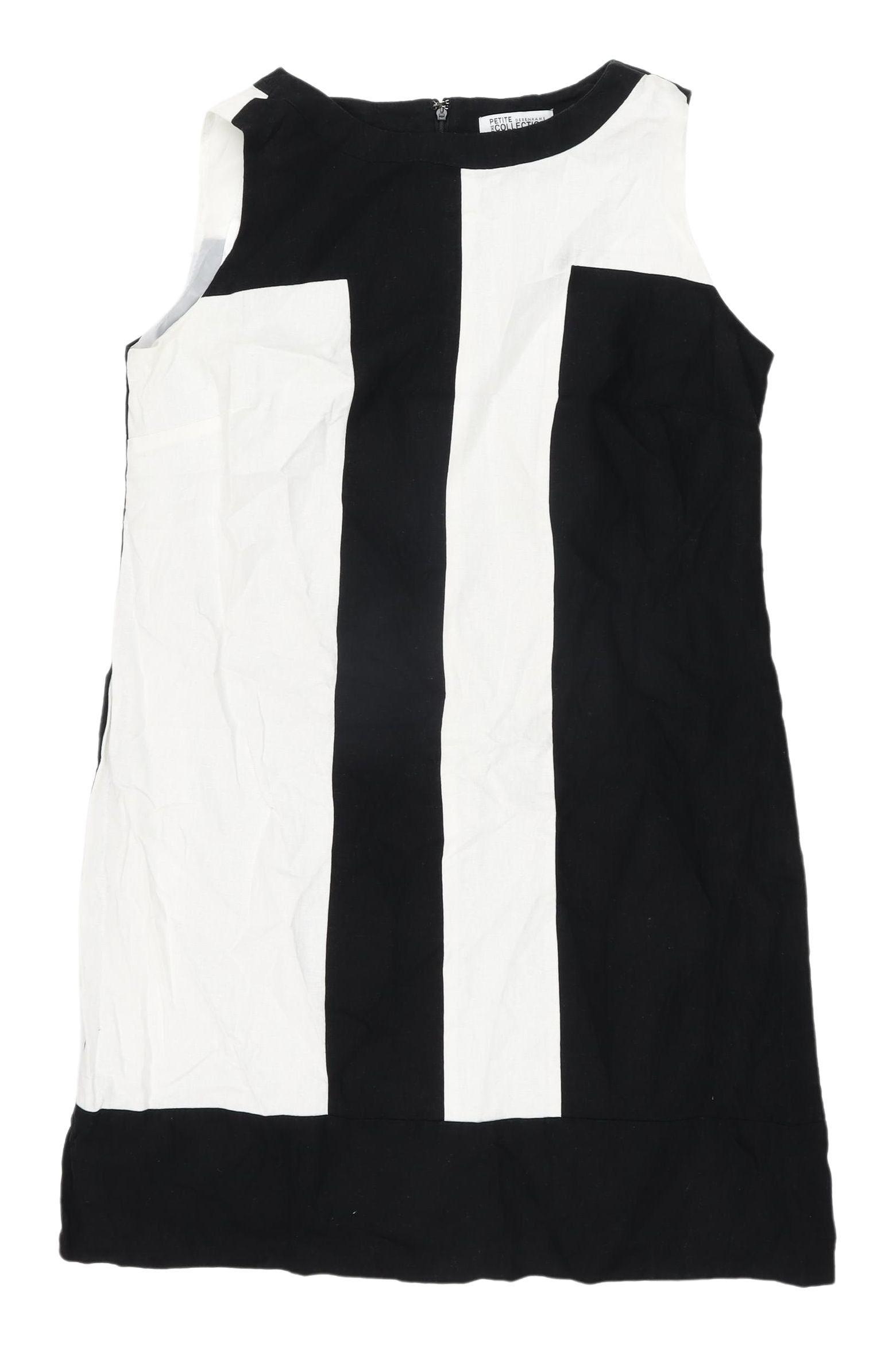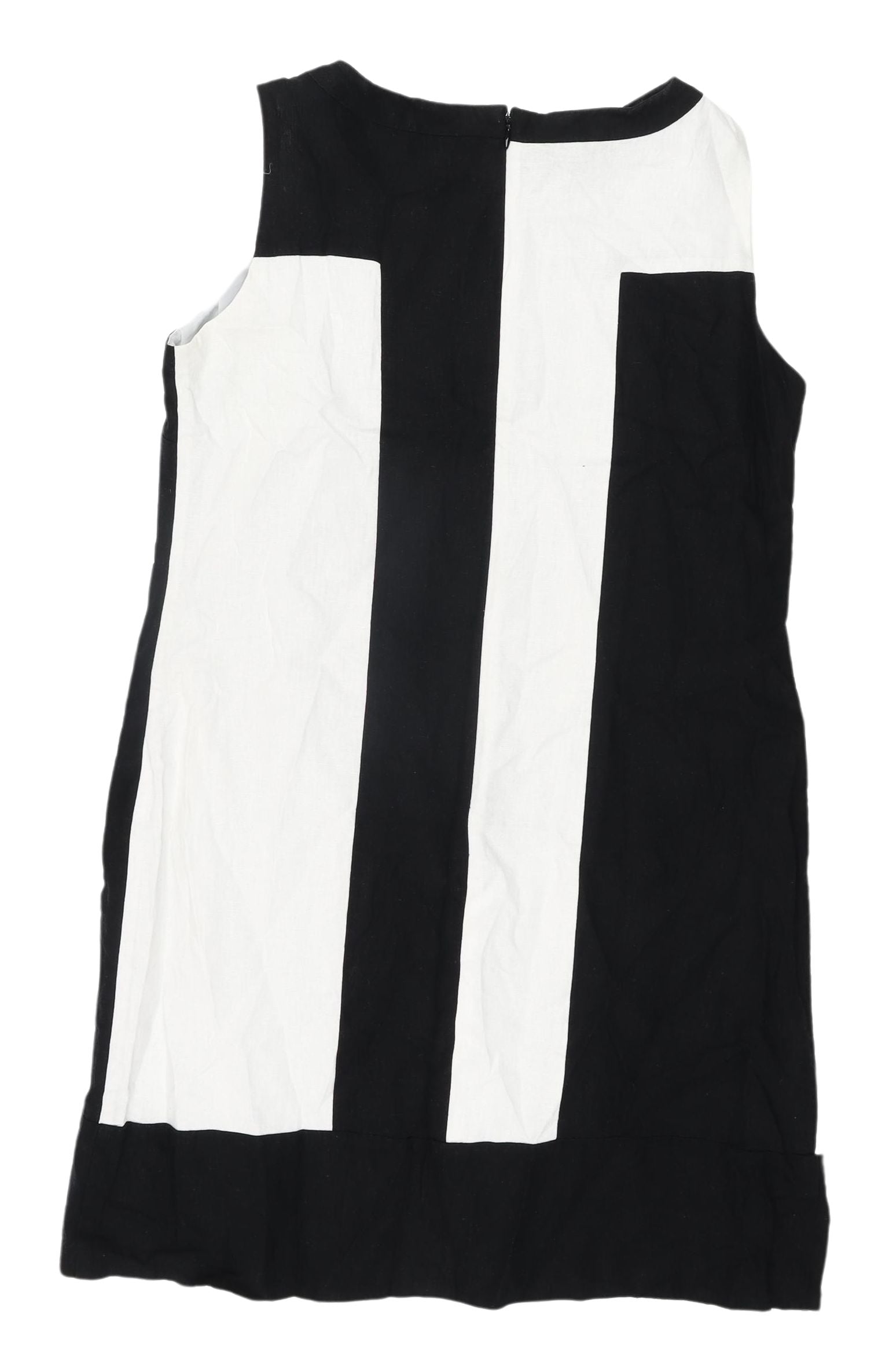 Elevate your wardrobe with this chic Debenhams Petite Collection shift dress in timeless black and white. Designed for women who appreciate style and comfort, this dress is perfect for a range of occasions, whether you're heading to the office or enjoying a casual day out. Crafted from a luxurious blend of linen and viscose, it offers a lightweight and breathable experience, ideal for those warmer days. The sleeveless design and round neckline add a touch of elegance, making it easy to pair with your favourite accessories. The dress features a colourblock pattern, providing a modern and sophisticated look. Although pre-owned, it remains in excellent condition, with only slight creasing on the fabric that can easily be smoothed out. The petite sizing ensures a perfect fit for those with a smaller frame. Make a statement at your next event with this versatile and fashionable piece.
