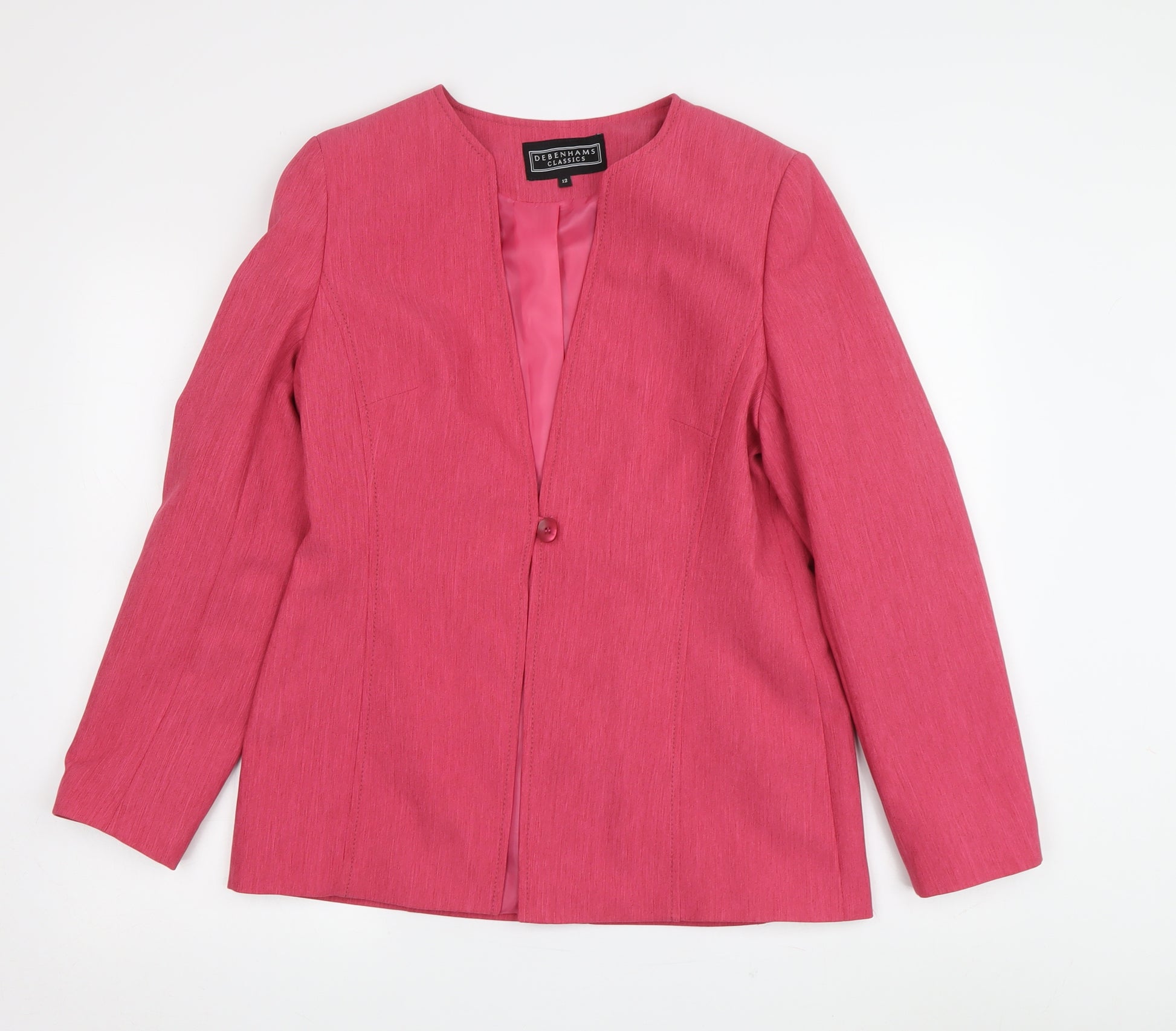Step out in confidence with this chic pink blazer from Debenhams. Perfect for adding a pop of colour to your spring wardrobe, this women’s mid-length blazer offers a comfortable fit with its polyester fabric, ensuring durability and a smooth finish. The collarless design lends a modern twist to this classic piece, making it a versatile addition to any outfit. Adorned with a single button accent, this blazer is ideal for casual occasions, blending effortlessly with other wardrobe staples. Whether heading to brunch or attending a casual meeting, this blazer promises to keep you looking stylish and composed. The machine-washable nature adds ease to your routine, while the simple yet elegant twill texture enhances its appeal. Wear it over a simple top or dress to elevate your everyday look effortlessly. With Debenhams' renowned quality and attention to detail, this pink jacket ensures you stay fashionable and comfortable. Make it your go-to choice for a blend of elegance and contemporary style.