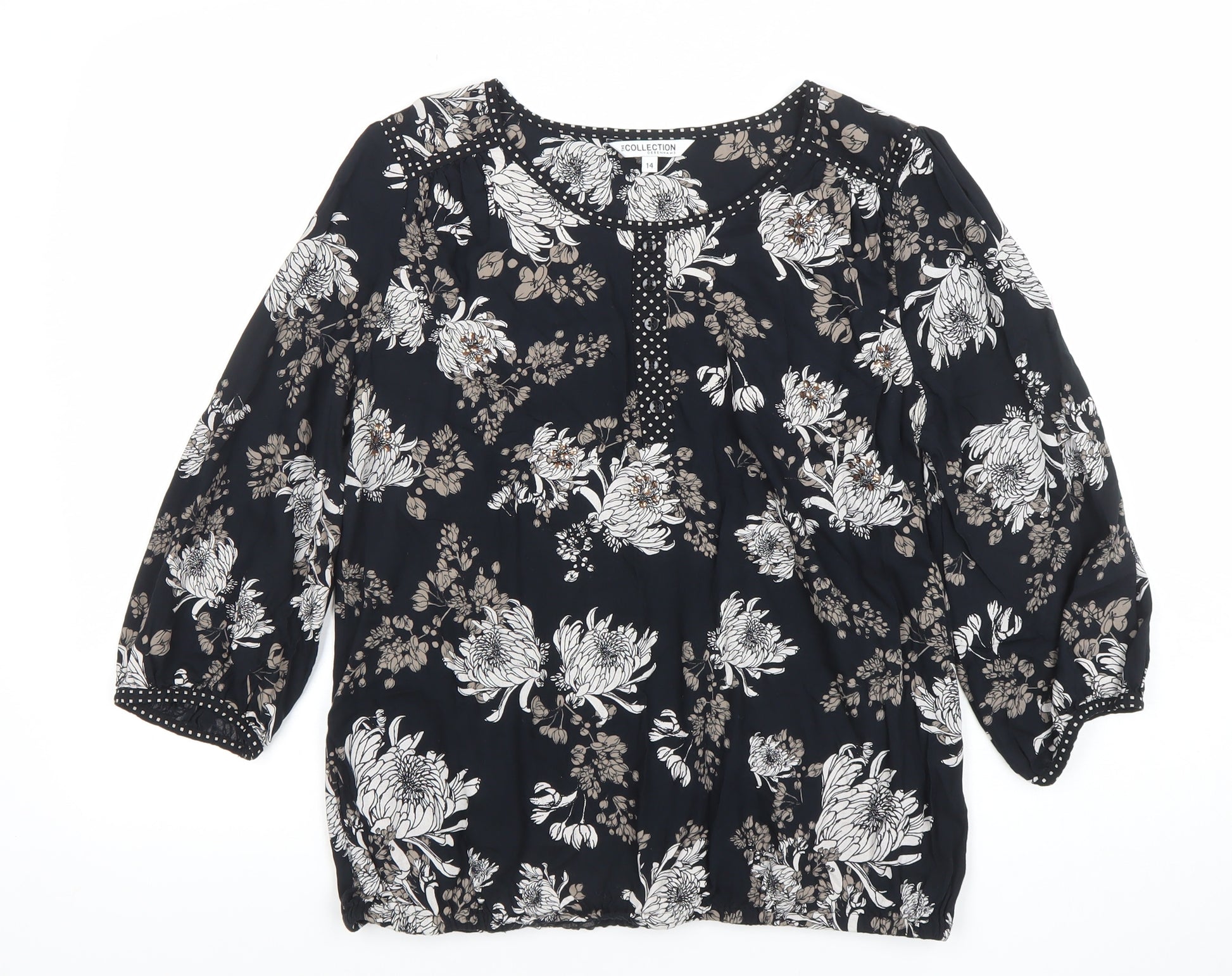 Add effortless elegance to your wardrobe with this beautiful women’s floral blouse from The Collection by Debenhams. Crafted from 100% viscose, this lightweight and breathable piece offers a soft, comfortable feel while maintaining a smooth, flowing drape. The blouse features a striking floral pattern in shades of neutral beige and white against a chic black background, providing a timeless yet modern style suitable for a variety of occasions. Designed with a flattering scoop neckline enhanced by delicate beaded accents, this top combines understated charm with a touch of embellishment. The relaxed fit and three-quarter balloon sleeves ensure ease of movement and a graceful silhouette, while the pullover design makes it effortlessly wearable. Perfect for spring through autumn, this tunic-style blouse pairs beautifully with tailored trousers for the office, jeans for a weekend outing, or a skirt for a casual evening look. The woven viscose fabric gives a soft texture and drapes naturally over the body for a relaxed and flattering shape. Machine washable for easy care, this blouse offers both practicality and refinement. Whether worn as a standalone statement piece or layered under a light jacket, this versatile top will quickly become a go-to favourite in your collection. Condition is excellent, showing minimal signs of wear and no visible flaws. An ideal choice for women seeking both comfort and style in everyday wardrobe essentials. Refresh your collection with this sophisticated Debenhams floral tunic and enjoy a polished, feminine aesthetic effortlessly.