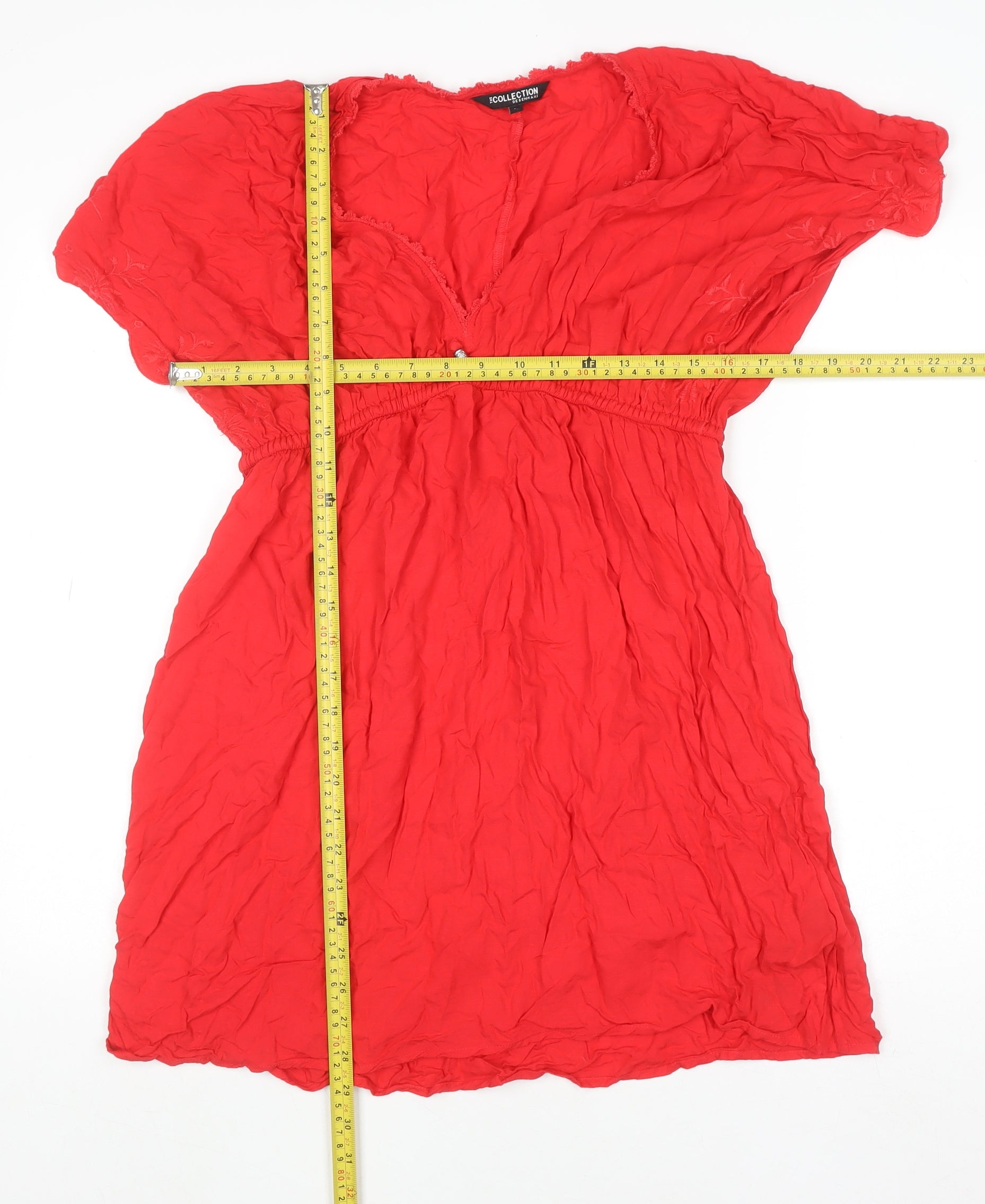 Add a splash of colour to your wardrobe with this vibrant red tunic blouse from The Collection by Debenhams. Designed for both style and comfort, this blouse is crafted from 100% viscose, offering a soft, lightweight, and breathable feel that keeps you comfortable throughout the day. The relaxed fit and gathered waist create a flattering silhouette that gently flows over the figure, while the crinkled texture lends a casual yet refined charm. Featuring short kimono-style sleeves and a feminine V-neckline with subtle embroidered detailing, this piece strikes the perfect balance between laid-back and polished. Its pullover design ensures effortless wear, making it ideal for pairing with jeans, tailored trousers, or skirts. Suitable for spring and summer seasons, the top’s bright red hue adds a bold touch to any outfit. Perfect for casual outings, lunches, and weekend wear, this tunic blouse embodies timeless everyday elegance with a touch of personality. In excellent pre-loved condition with only minimal signs of handling, it’s a versatile wardrobe essential ready to brighten up your collection. Whether styled up with accessories or kept simple for a relaxed look, this Debenhams red tunic offers comfort and sophistication in equal measure—making it a piece you’ll reach for time and again.